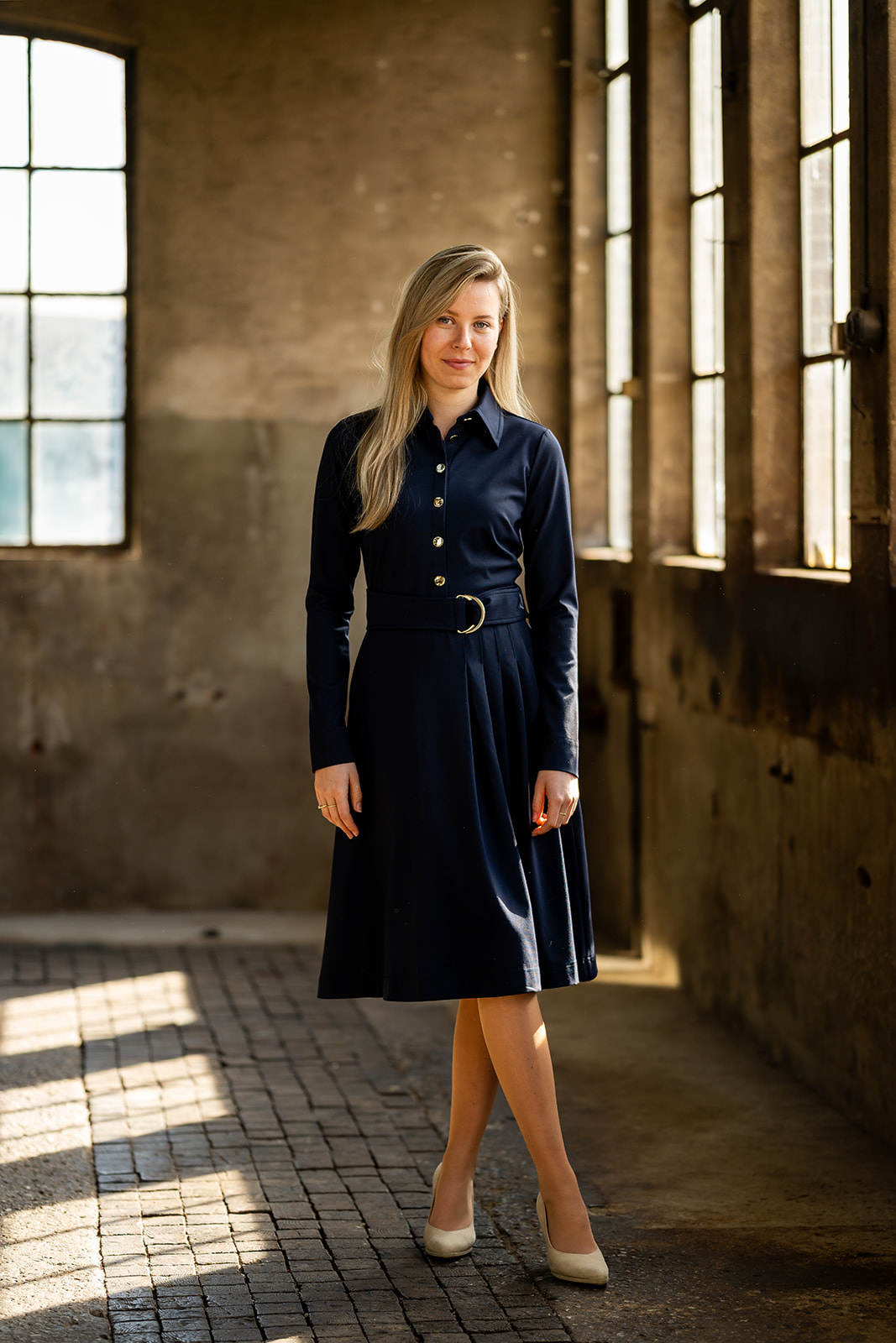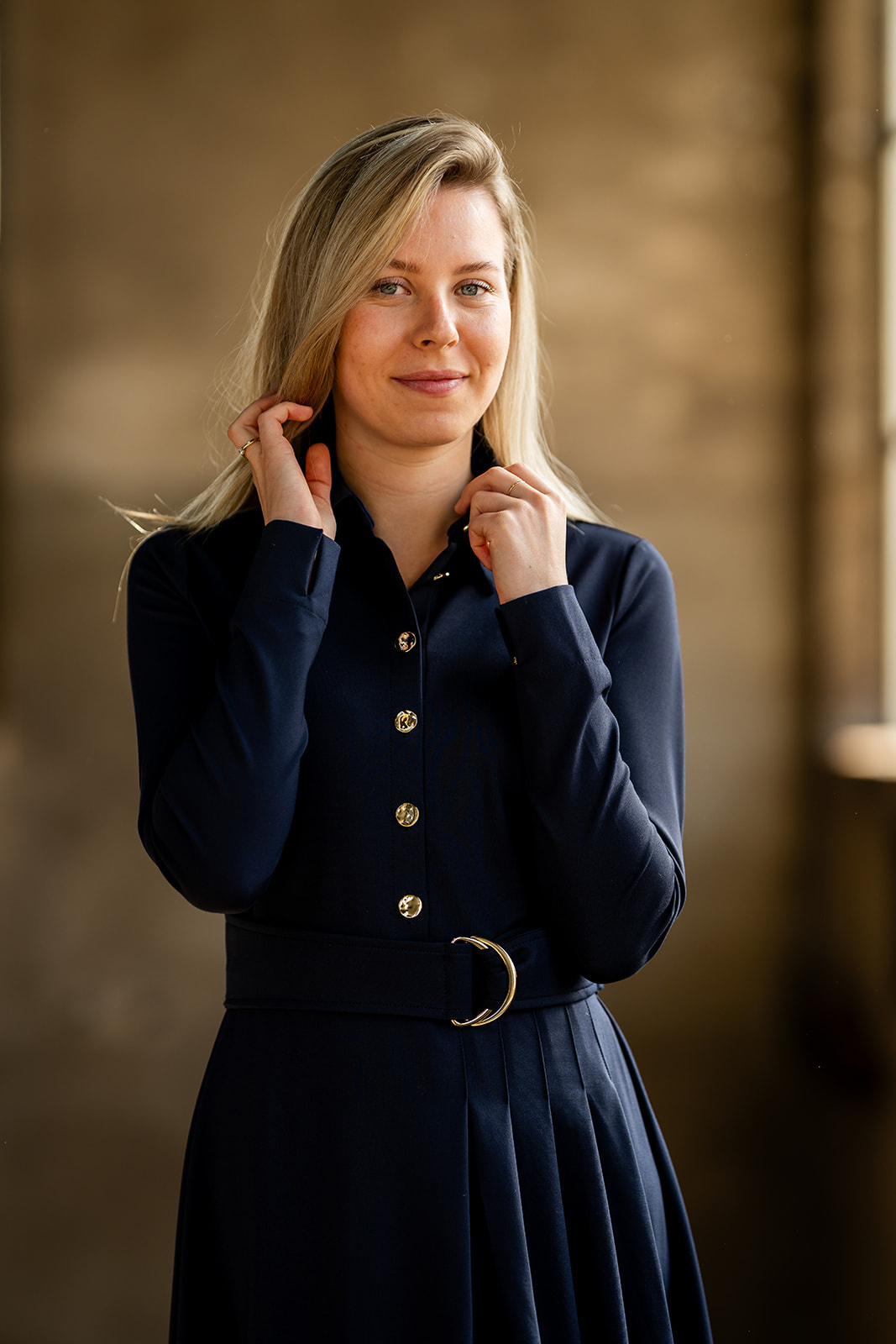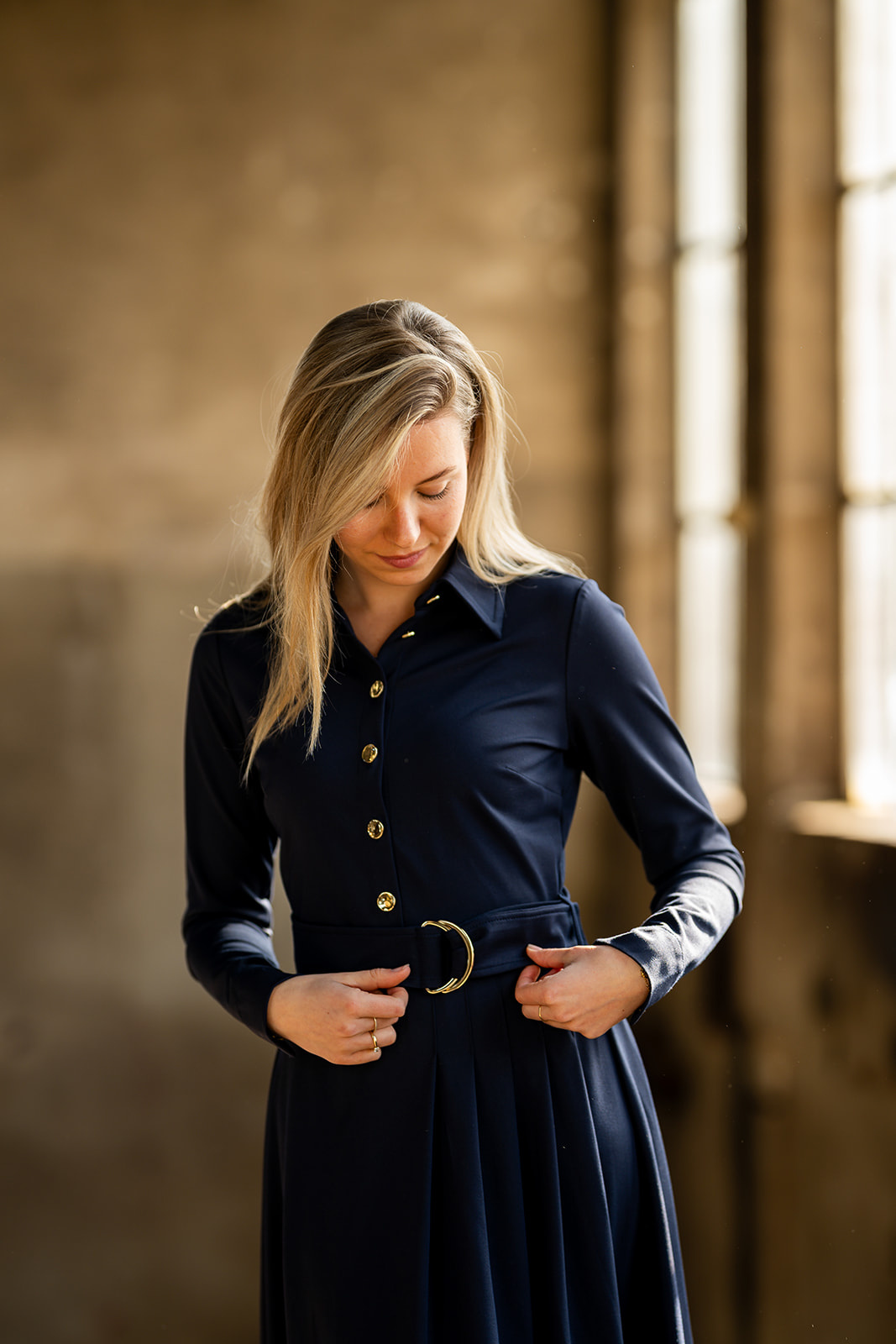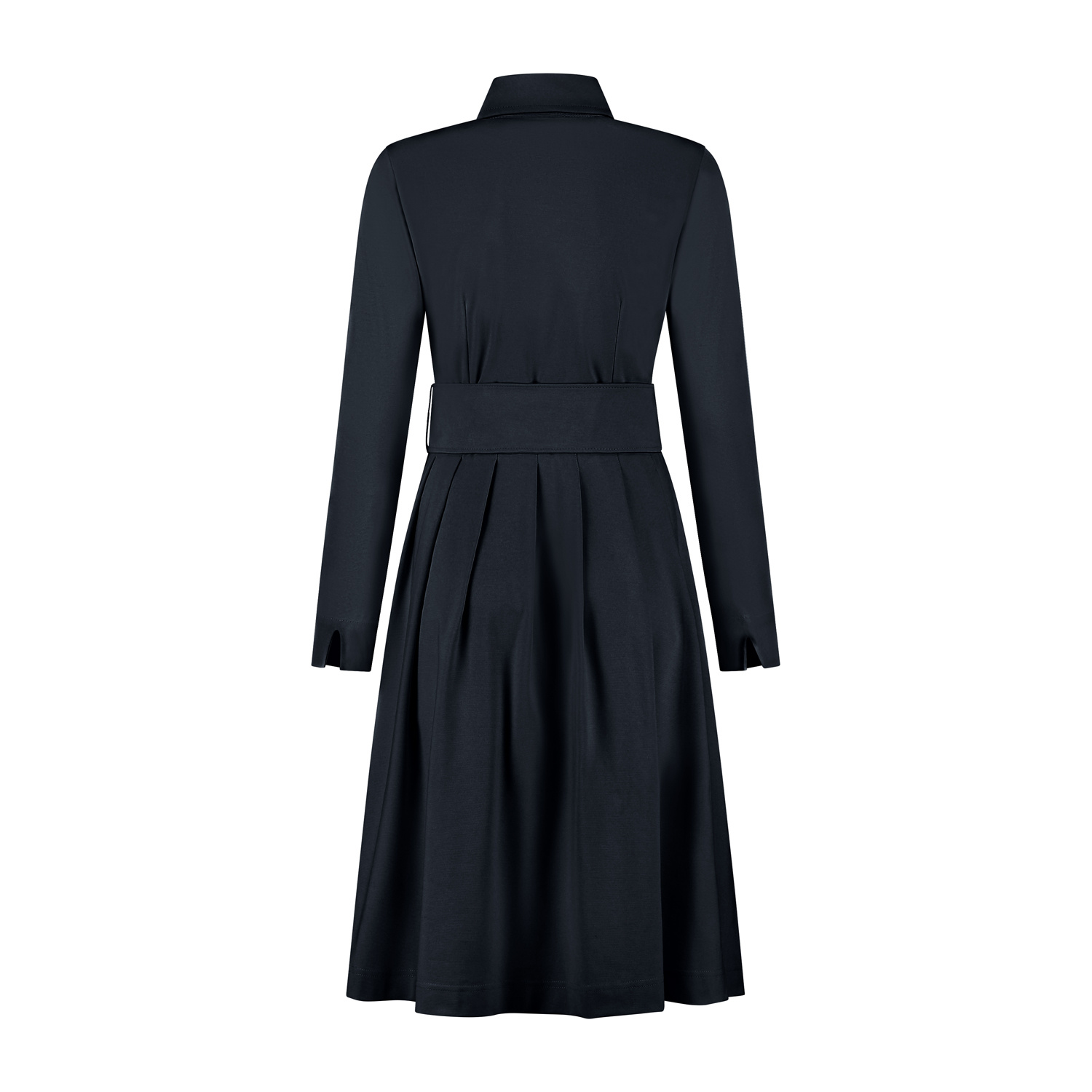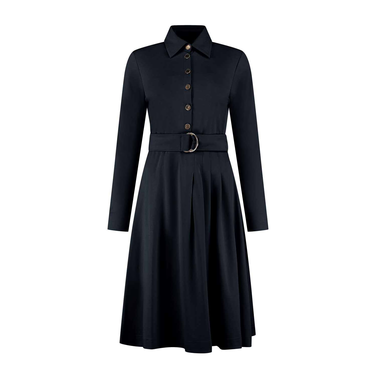 Jurk met lange mouw met manchet en splitje. De jurk heeft een doorgestikte blousekraag en knopenlijst vooraan. De jurk heeft een aansluitende bovenpas en het rokgedeelte heeft vanuit de taille in het achterpand en een helft van het voorpand diverse plooien. De jurk heeft een ceintuur met goudkleurige D-ringen om de taille. De jurk is gemaakt in een mooie luxe tricot kwaliteitsstof.