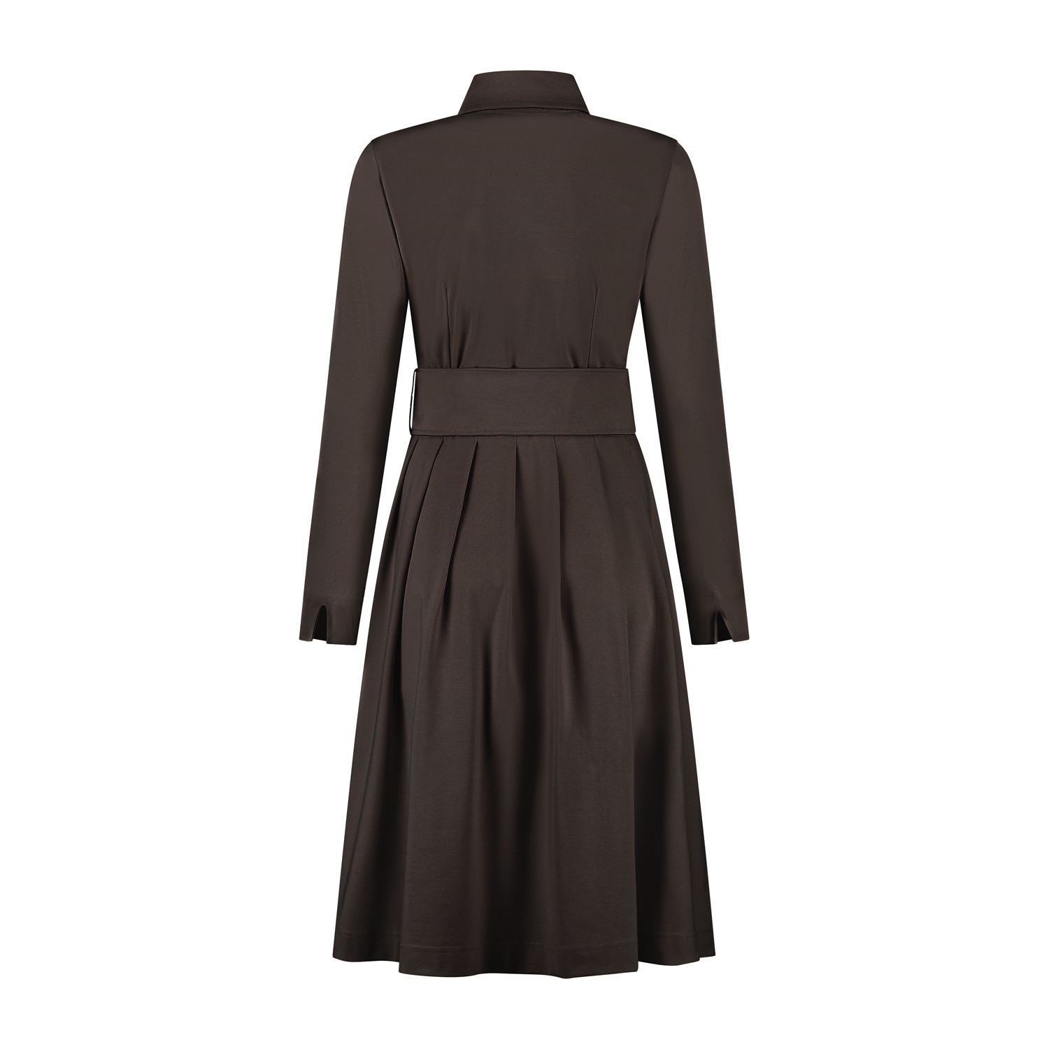 Jurk met lange mouw met manchet en splitje. De jurk heeft een doorgestikte blousekraag en knopenlijst vooraan. De jurk heeft een aansluitende bovenpas en het rokgedeelte heeft vanuit de taille in het achterpand en een helft van het voorpand diverse plooien. De jurk heeft een ceintuur met goudkleurige D-ringen om de taille. De jurk is gemaakt in een mooie luxe tricot kwaliteitsstof.