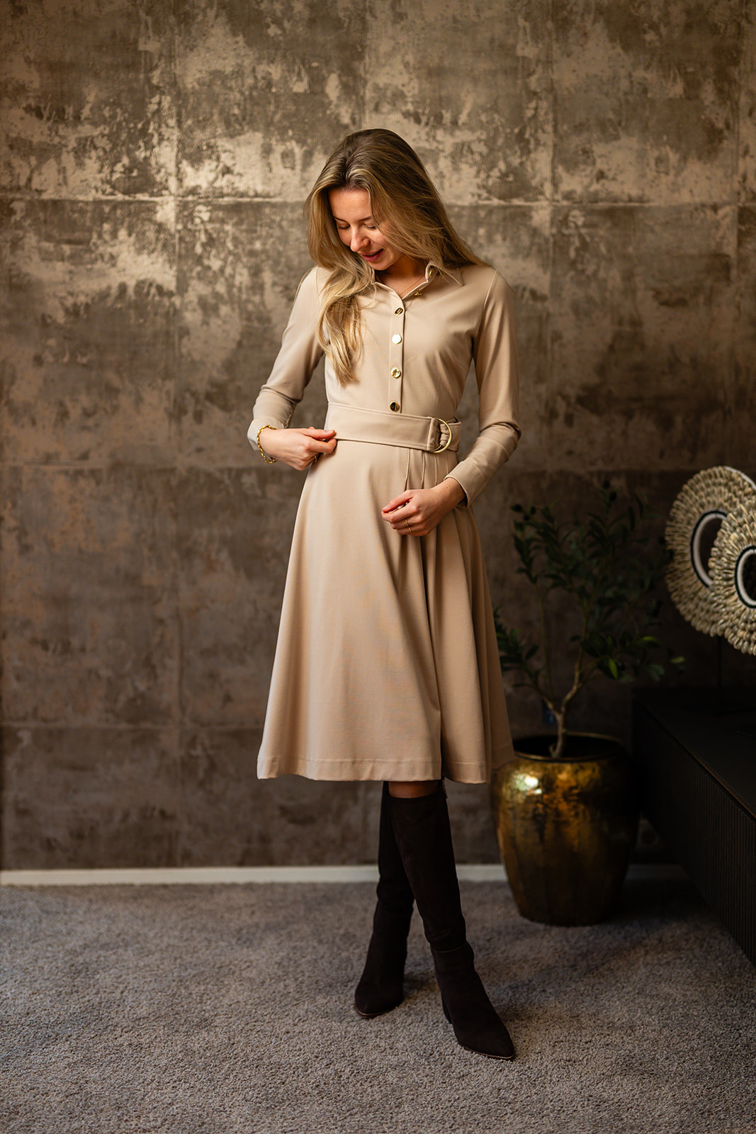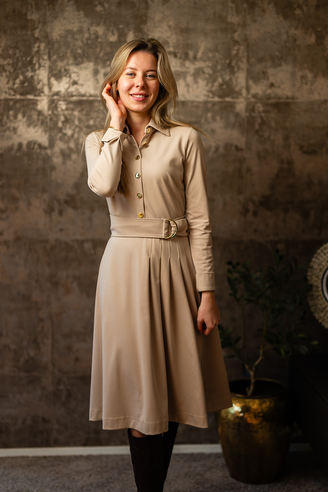 Jurk met lange mouw met manchet en splitje. De jurk heeft een doorgestikte blousekraag en knopenlijst vooraan. De jurk heeft een aansluitende bovenpas en het rokgedeelte heeft vanuit de taille in het achterpand en een helft van het voorpand diverse plooien. De jurk heeft een ceintuur met goudkleurige D-ringen om de taille. De jurk is gemaakt in een mooie luxe tricot kwaliteitsstof.