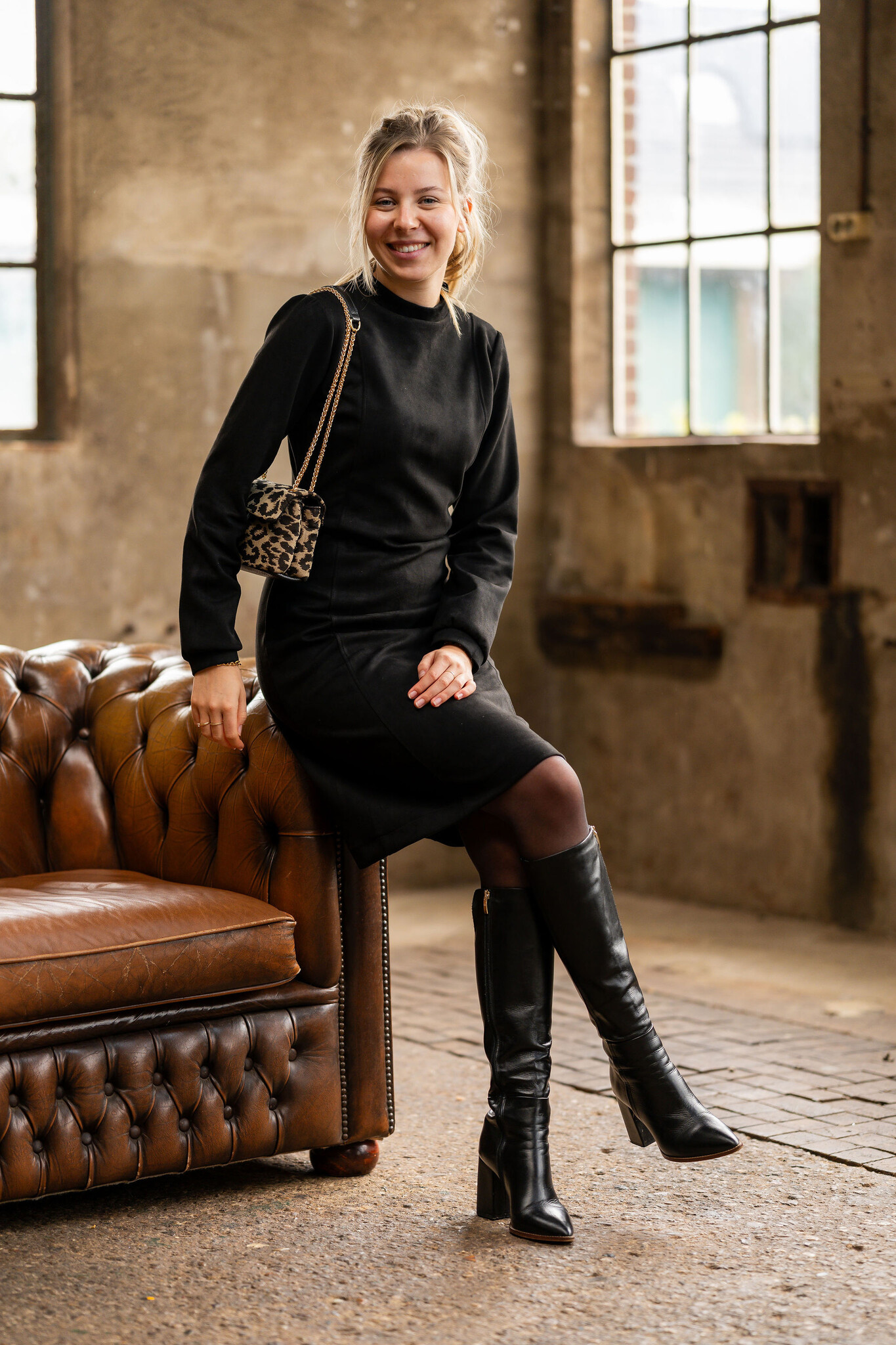 Jurk met opstaand boordkraagje en lange mouwen. De jurk heeft diverse deelnaden in voor- en achterpand en sluit middenachter d.m.v. een metalen rits. De jurk is lichtgerend van model en is gemaakt in een stretch suèdine kwaliteitsstof.