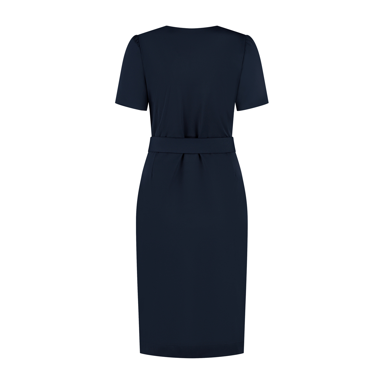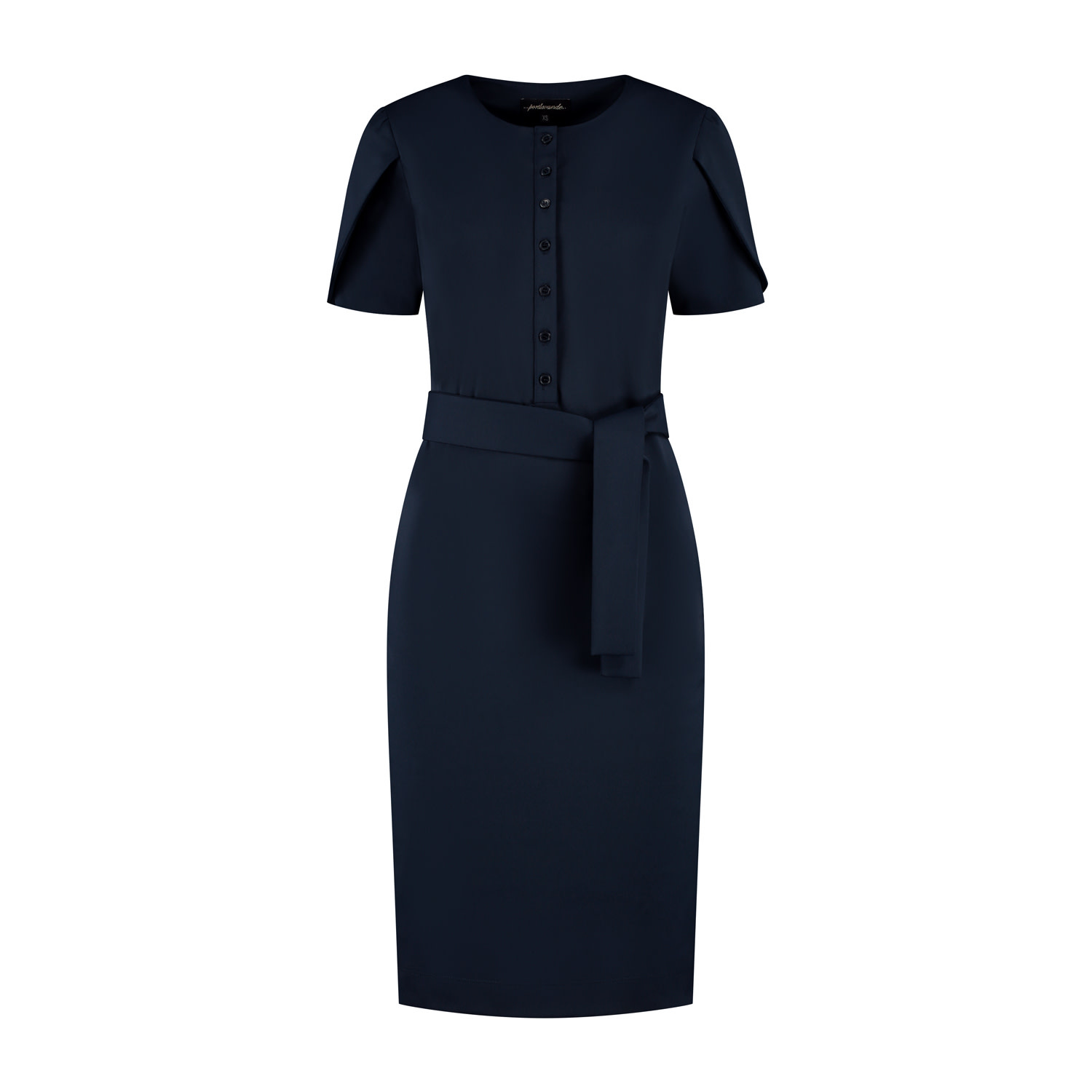 Jurk met ronde halslijn en korte tulpmouw. De jurk heeft in het bovenpand een knopenlijst en een strikceintuur om de taille. Het rokgedeelte is recht van model. Deze jurk is gemaakt in een mooie stevige travel kwaliteitsstof.