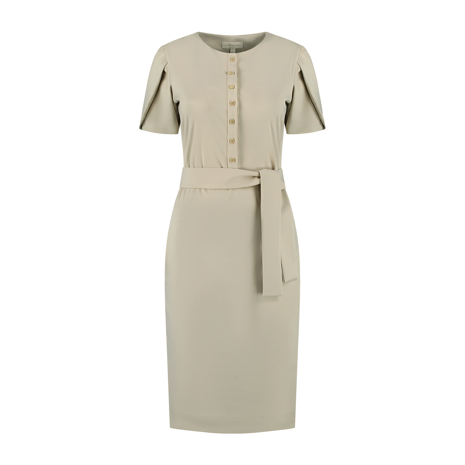 Jurk met ronde halslijn en korte tulpmouw. De jurk heeft in het bovenpand een knopenlijst en een strikceintuur om de taille. Het rokgedeelte is recht van model. Deze jurk is gemaakt in een mooie stevige travel kwaliteitsstof.