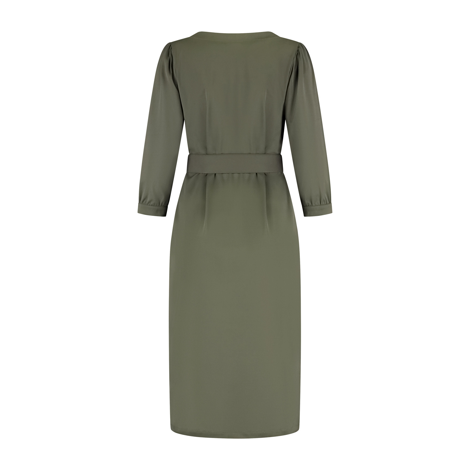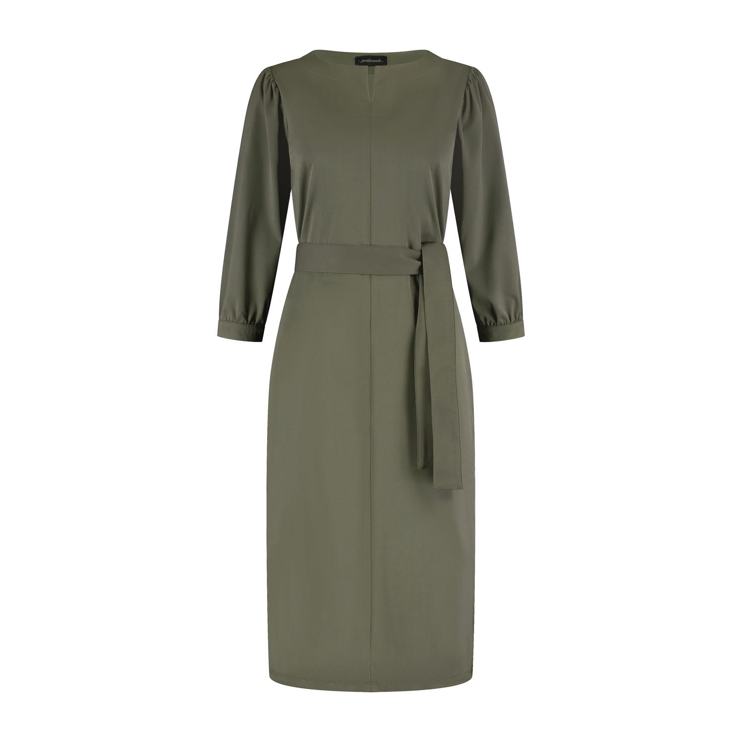 Jurk Fieke is een exclusieve olijfgroene damesjurk met een elegante en vrouwelijke uitstraling. Deze jurk heeft een ronde halslijn met splitje en iets wijdervallende 3/4 mouwen met een smal boordje. Met de brede strikceintuur modelleer je deze jurk perfect in de taille. De olijfgroene kleur geeft de jurk een warme, luxe uitstraling en maakt haar eenvoudig te combineren met zowel lichte als donkere accessoires. Jurk Fieke is ongevoerd en gemaakt in een mooie stevige comfortabele travel kwaliteitsstof.