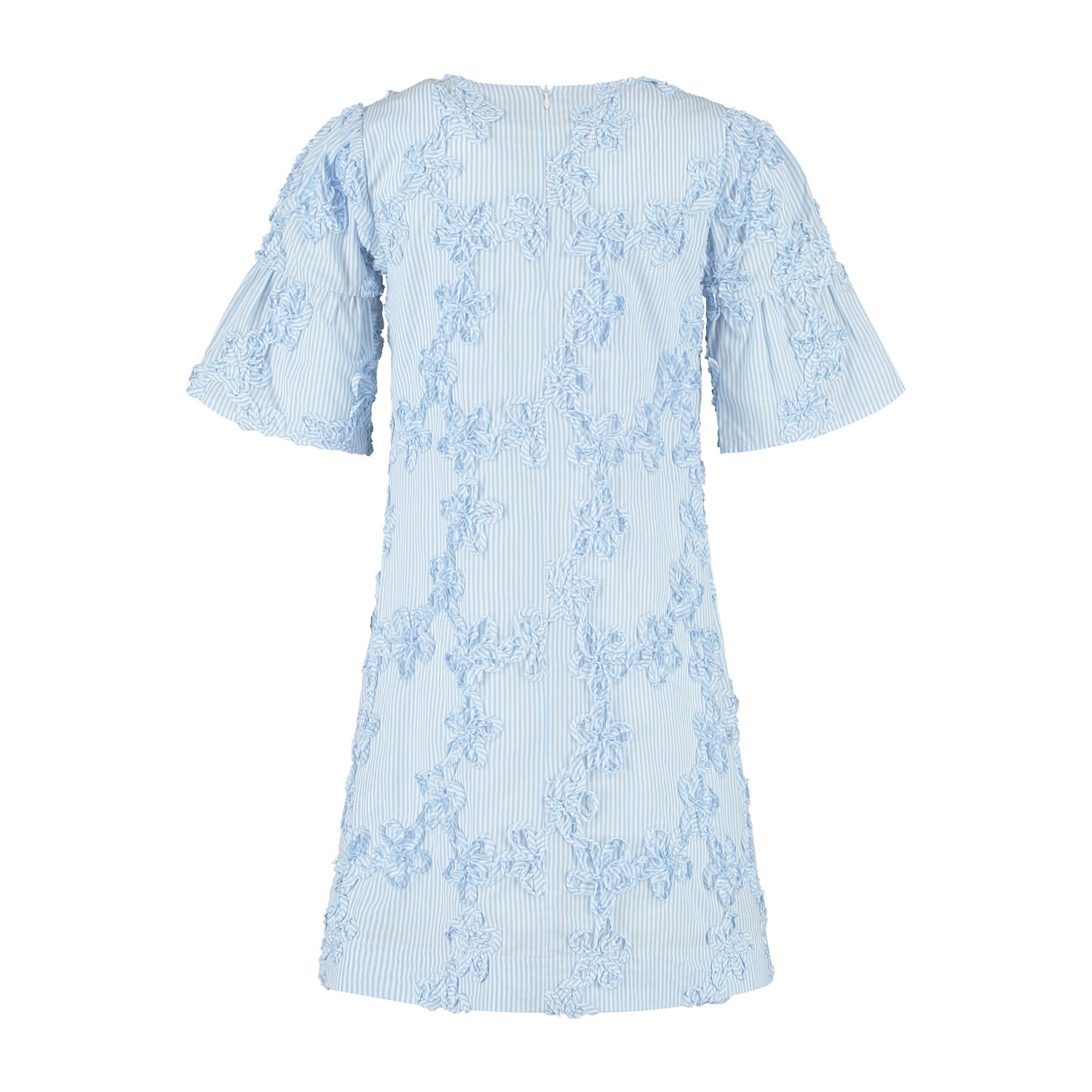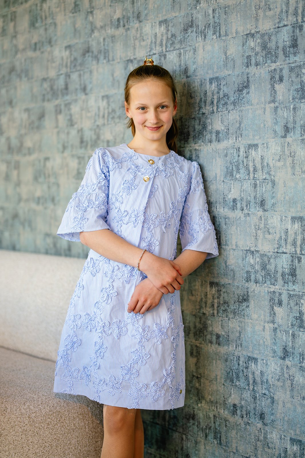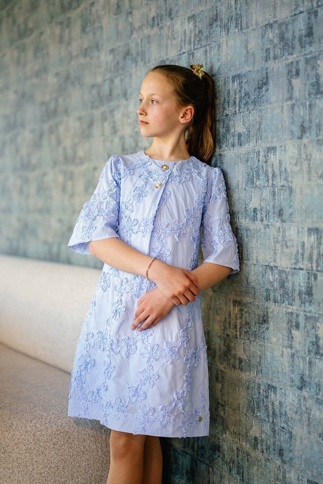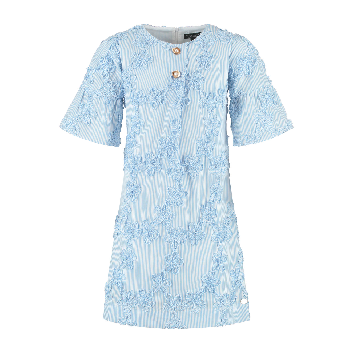 Deze charmante meisjesjurk Lotje van Port Lavande is uitgevoerd in een frisse lichtblauwe tint met een streepdessin, verrijkt met verfijnde bloemapplicaties die zorgen voor een unieke en luxe look. De korte, licht uitlopende mouwen geven de jurk een luchtig en vrolijk karakter, terwijl de rechte lichtgerende pasvorm zorgt voor optimaal draagcomfort. De sierlijke knoop/plooidetails aan de voorzijde en de zachte stof maken deze jurk perfect voor zowel feestelijke gelegenheden als zonnige dagen. Jurk Lotje is gemaakt in een katoenen kwaliteitsstof en voorzien van een voeringstof en sluit middenachter d.m.v. een blinde rits. Combineer met sandaaltjes of ballerina’s voor een lieve, zomerse look.