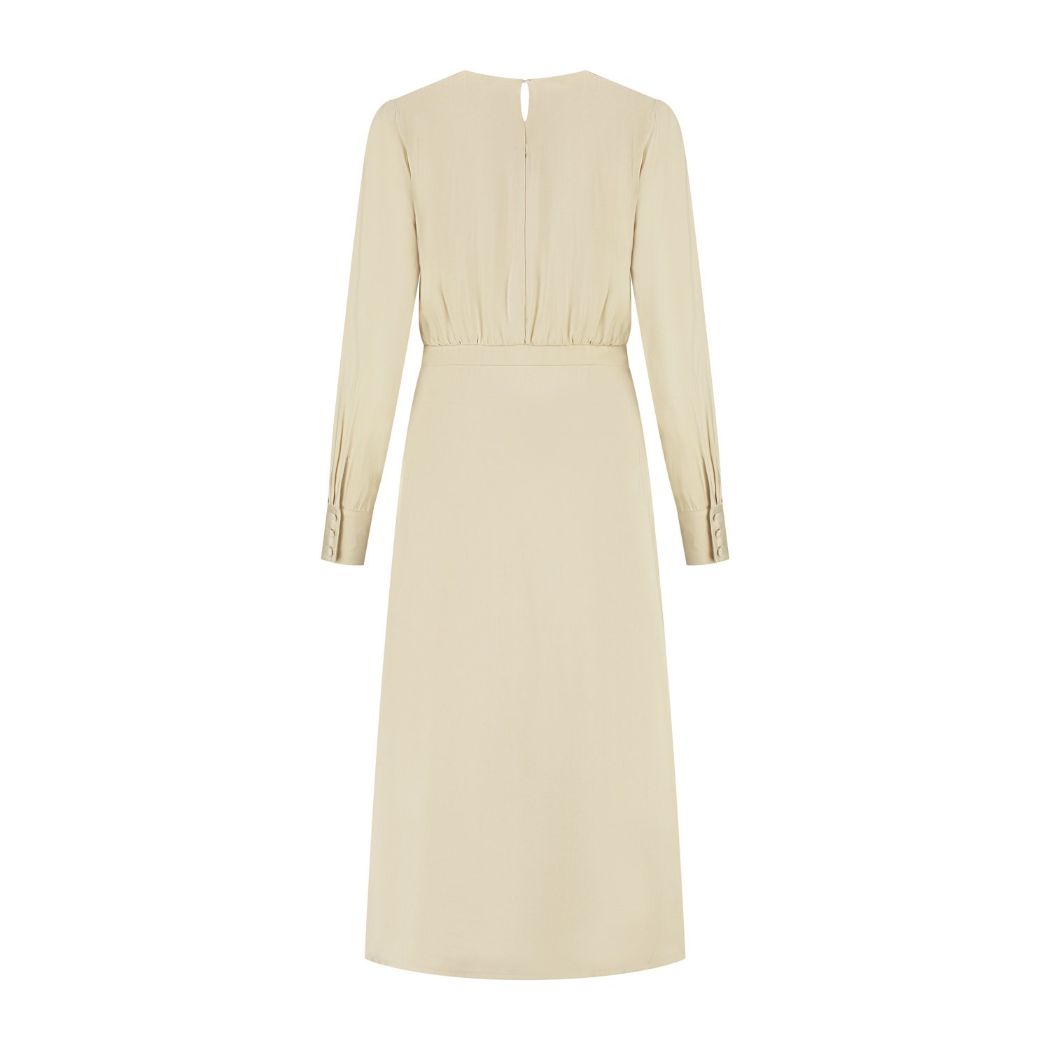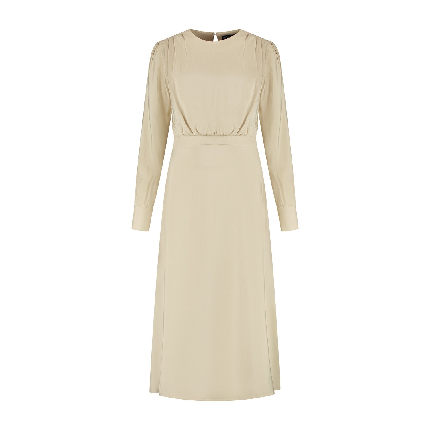 Deze jurk Maira heeft een lichtblousende bovenpas met verfijnde plooien vanaf de schoudernaad en een licht getailleerde pasvorm door de taillepas. De lange mouwen met manchet en stofknoopjes geven de jurk net even iets extra's. De minimalistische ronde halslijn en de zachte vanille kleur zorgt ervoor dat je de jurk moeiteloos kunt combineren met diverse tinten. De jurk Maira is gemaakt in een chique viscose kwaliteitsstof met een vleugje glans en is voorzien van een voeringstof en sluit middenachter d.m.v. een splitje/blindknoopje. Kortom, ontdek de perfecte balans tussen elegantie en comfort met de jurk Maira in zandkleur van Port Lavande.