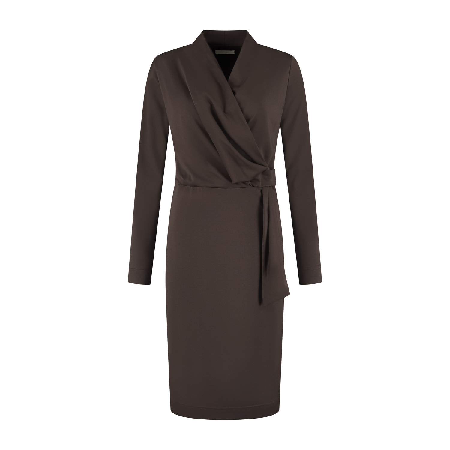 Jurk met een aangeknipte kraag en gedrapeerde overslaglook. De overslag loopt in een sjerp door een lusje in de zijnaad over het rokgedeelte. Het bovenpasje van de jurk is voorzien van een voering. Deze jurk is gemaakt in een luxe tricot kwaliteitsstof.