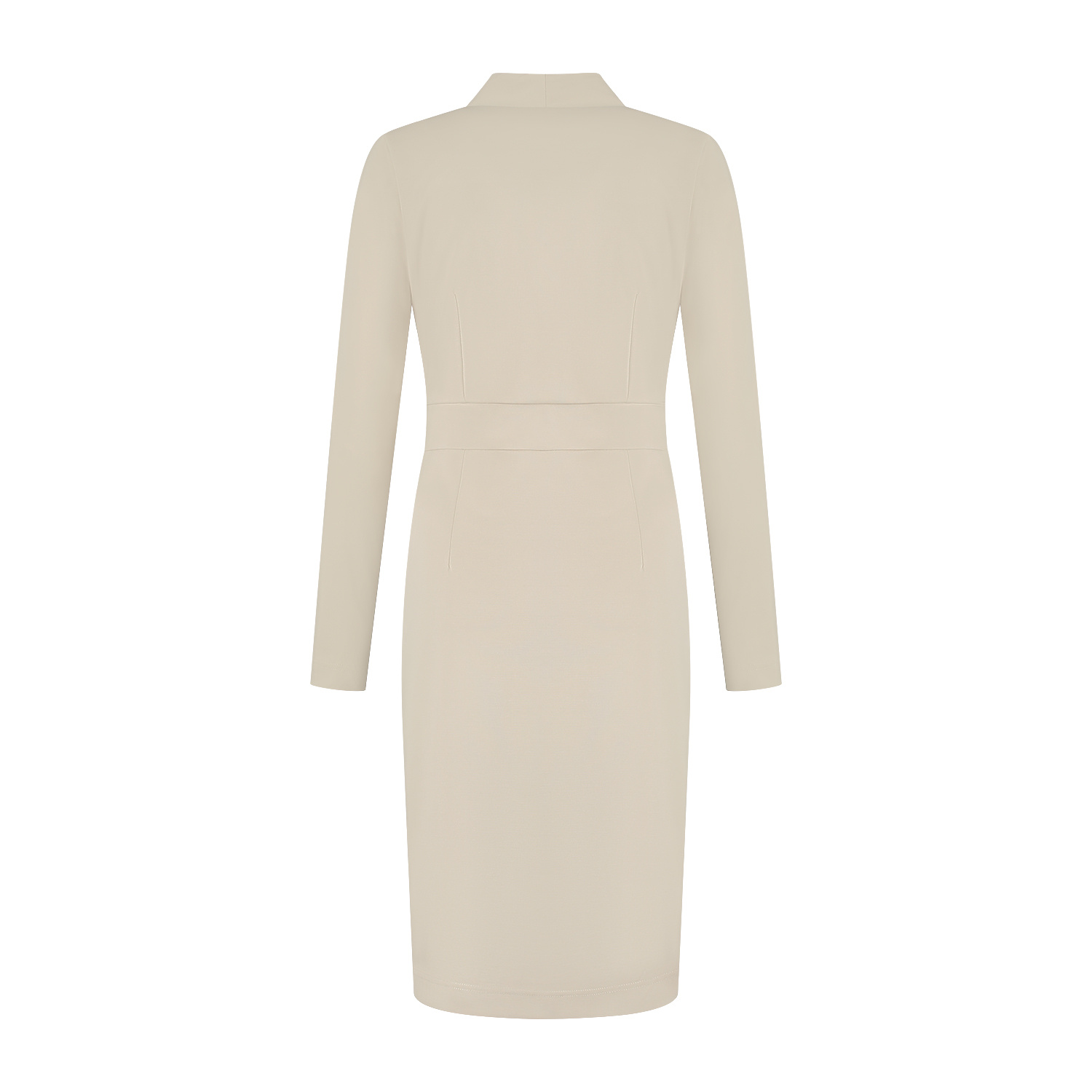 Jurk met een aangeknipte kraag en gedrapeerde overslaglook. De overslag loopt in een sjerp door een lusje in de zijnaad over het rokgedeelte. Het bovenpasje van de jurk is voorzien van een voering. De...