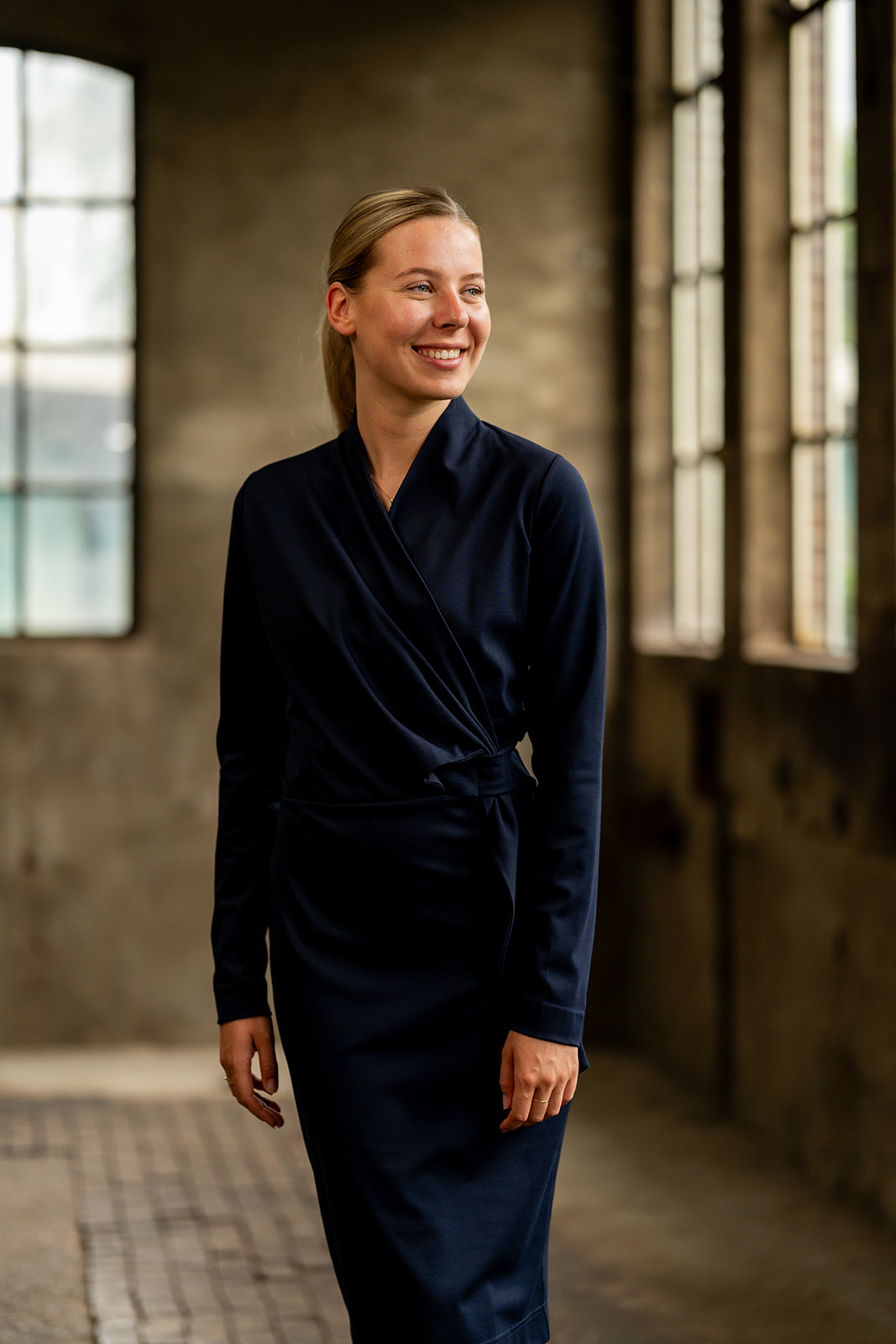 Jurk met een aangeknipte kraag en gedrapeerde overslaglook. De overslag loopt in een sjerp door een lusje in de zijnaad over het rokgedeelte. Het bovenpasje van de jurk is voorzien van een voering. Deze jurk is gemaakt in een luxe tricot kwaliteitsstof.