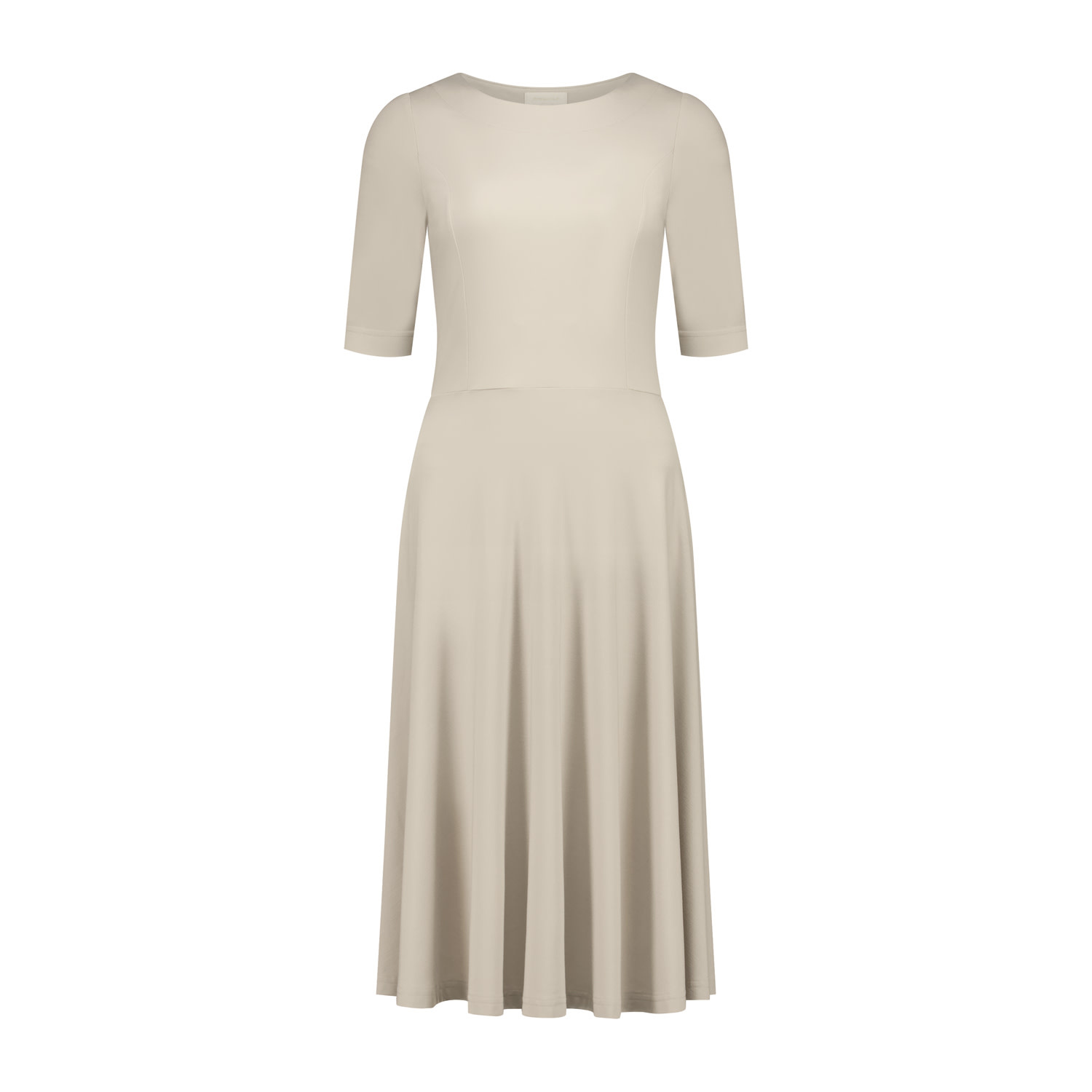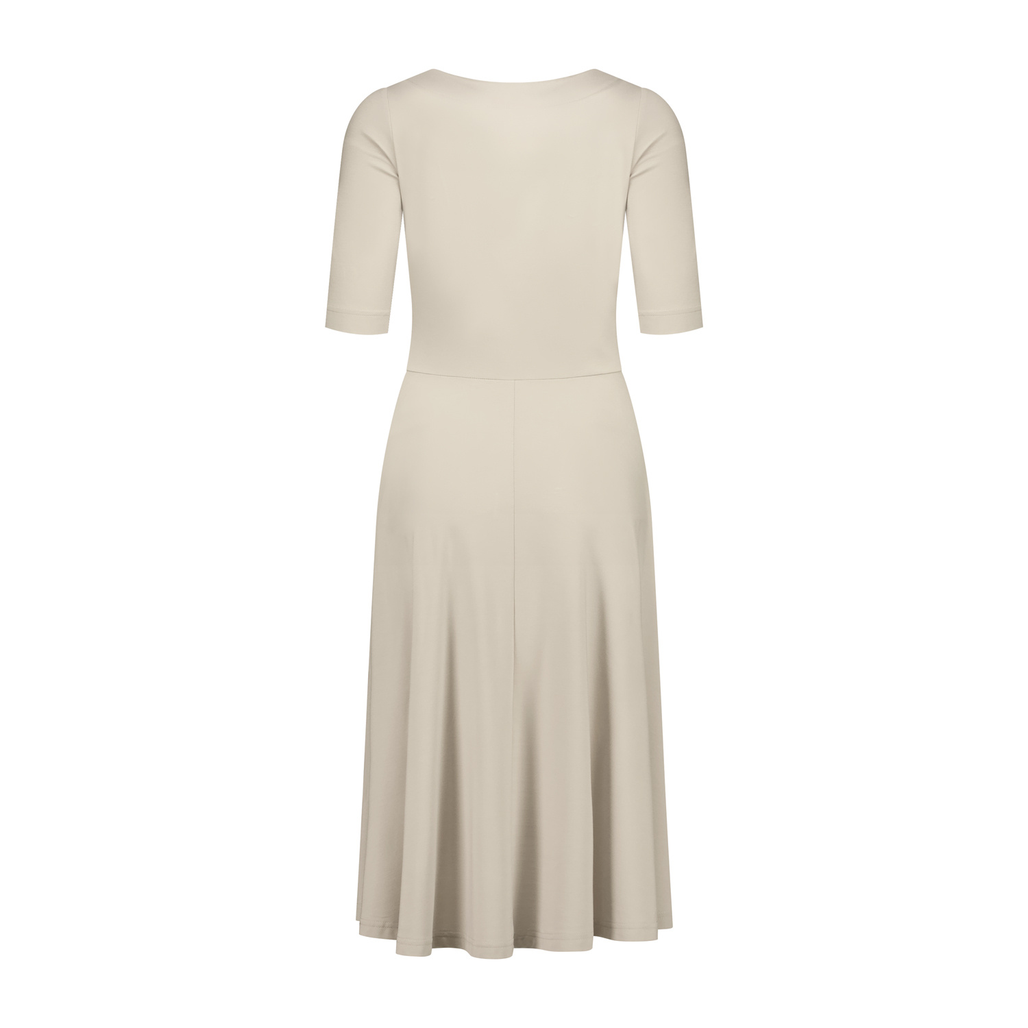 De Jurk Marian in zandkleur van Port Lavande is een stijlvolle jurk voor elke garderobe. De jurk heeft een mooie aangesloten bovenkant met een korte mouw, een licht getailleerde taille en een zwierig vallende rok die soepel meebeweegt. Deze jurk is niet voorzien van een voeringstof en is gemaakt in een zachte tricotpunto kwaliteitstof.