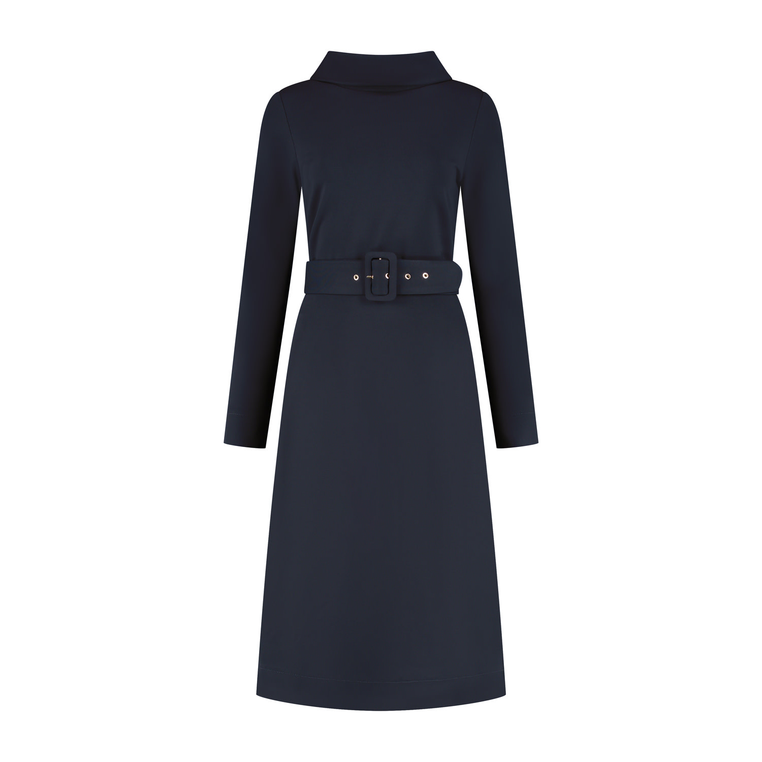 Jurk met opstaande ronde boothalskraag en lange mouw. De jurk heeft een iets blousend bovenlijf en brede stoffen riem met gesp om de taille en een a-lijn rokgedeelte. De jurk sluit middenachter d.m.v. een goudkleurige rits en is gemaakt in een luxe stevige puntokwaliteitstof.
