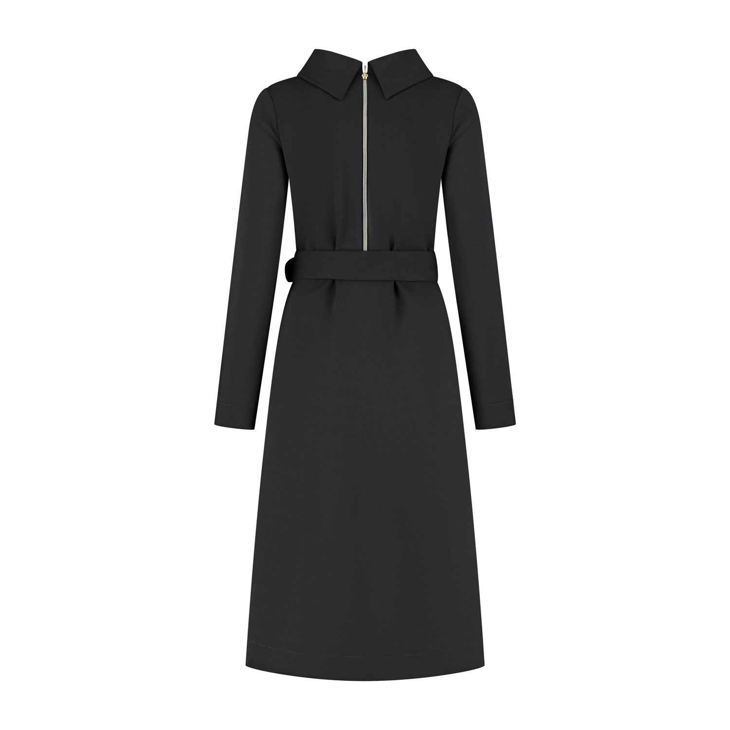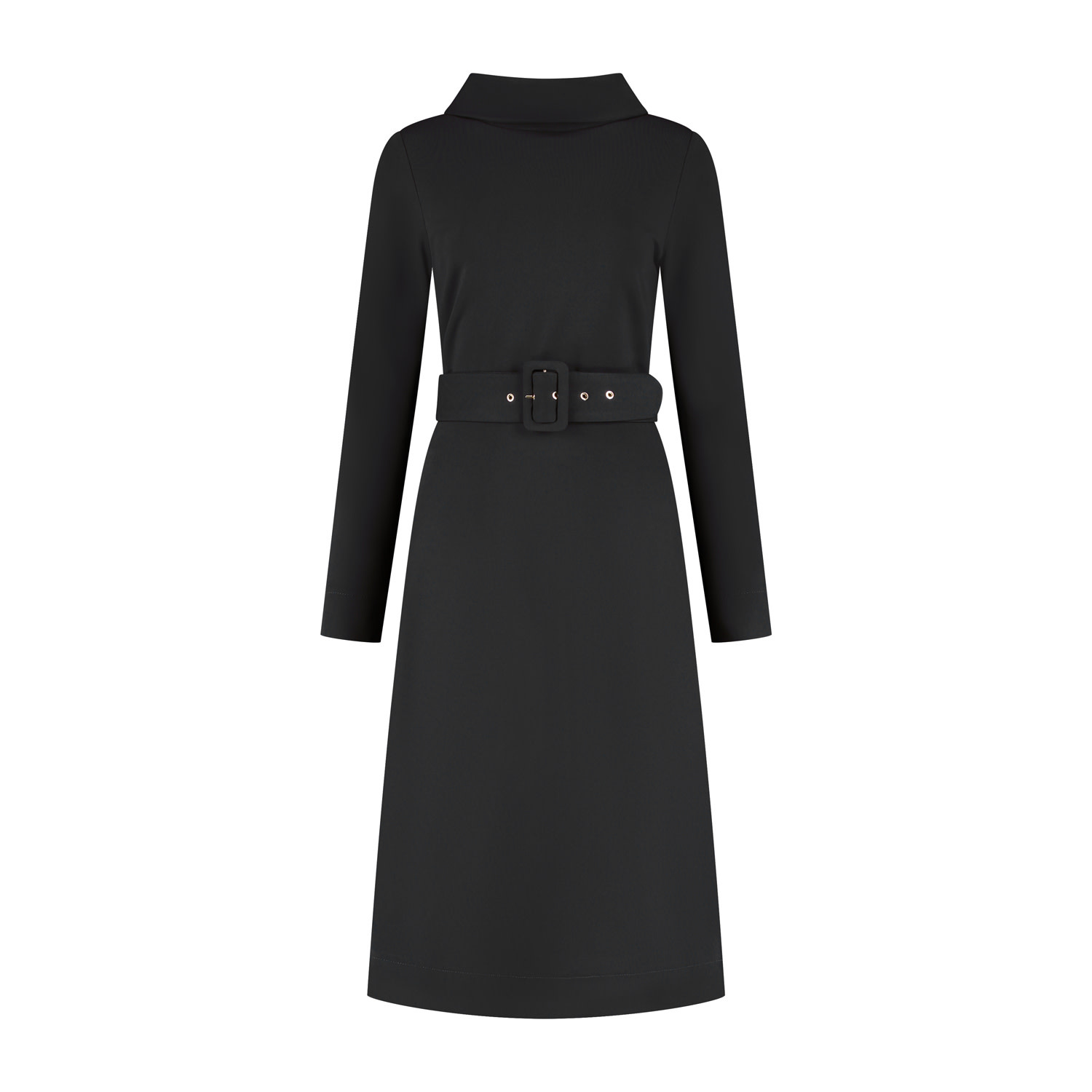Jurk met opstaande ronde boothalskraag en lange mouw. De jurk heeft een iets blousend bovenlijf en brede stoffen riem met gesp om de taille en een a-lijn rokgedeelte. De jurk sluit middenachter d.m.v. een goudkleurige rits en is gemaakt in een luxe stevige puntokwaliteitstof.