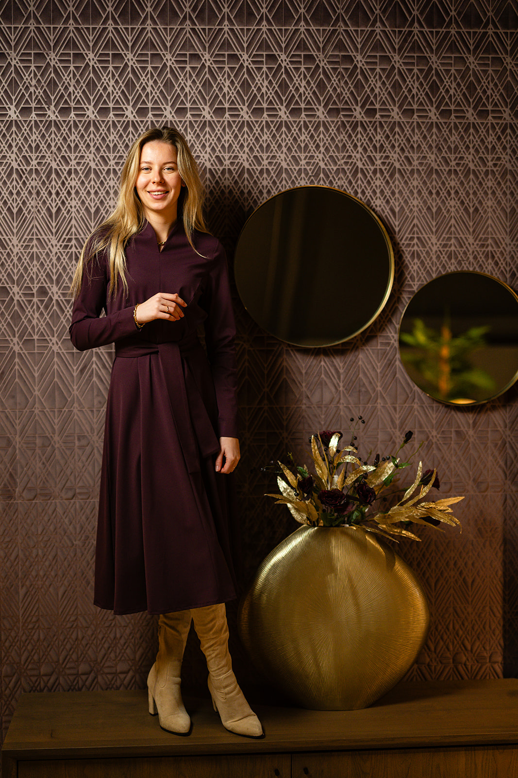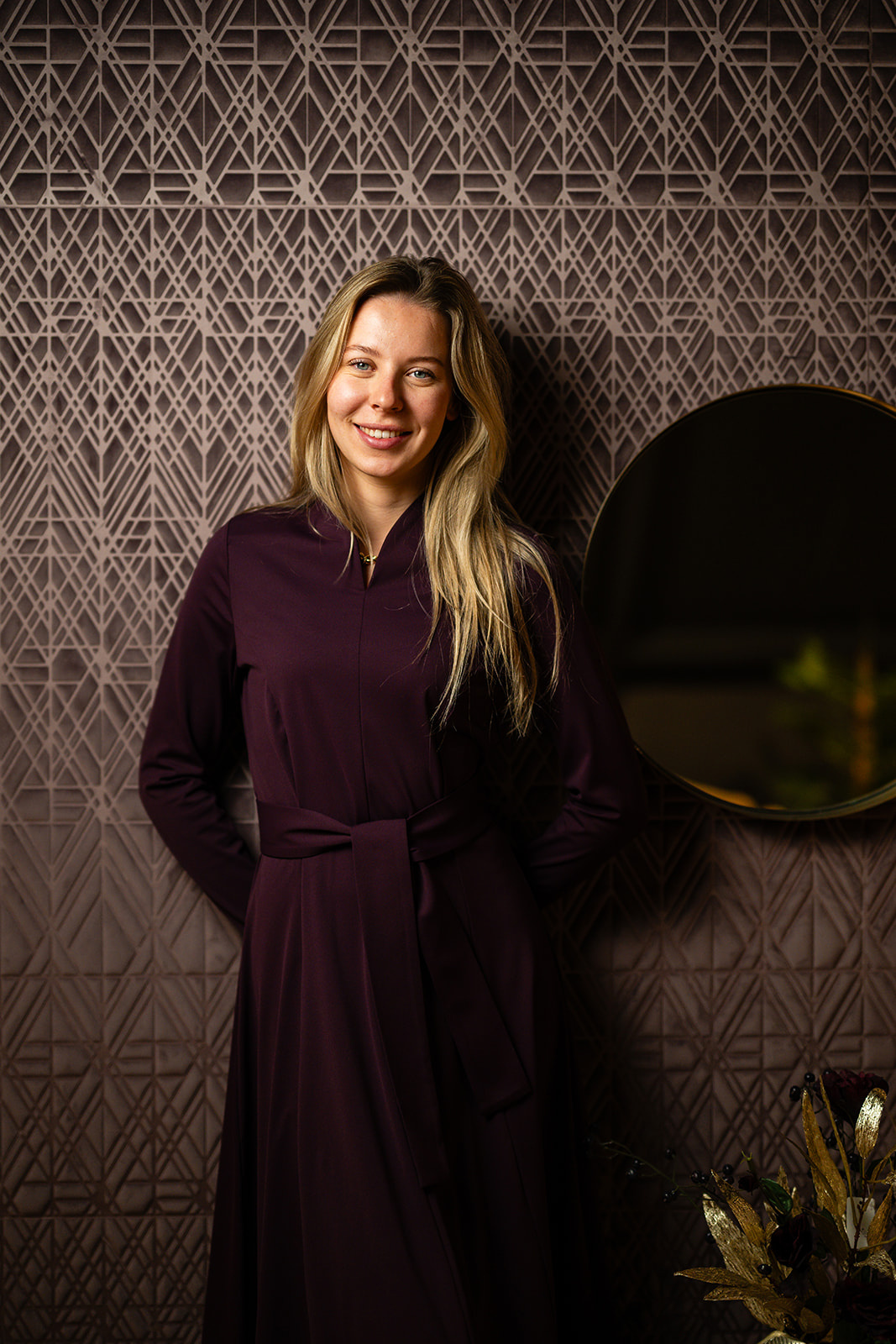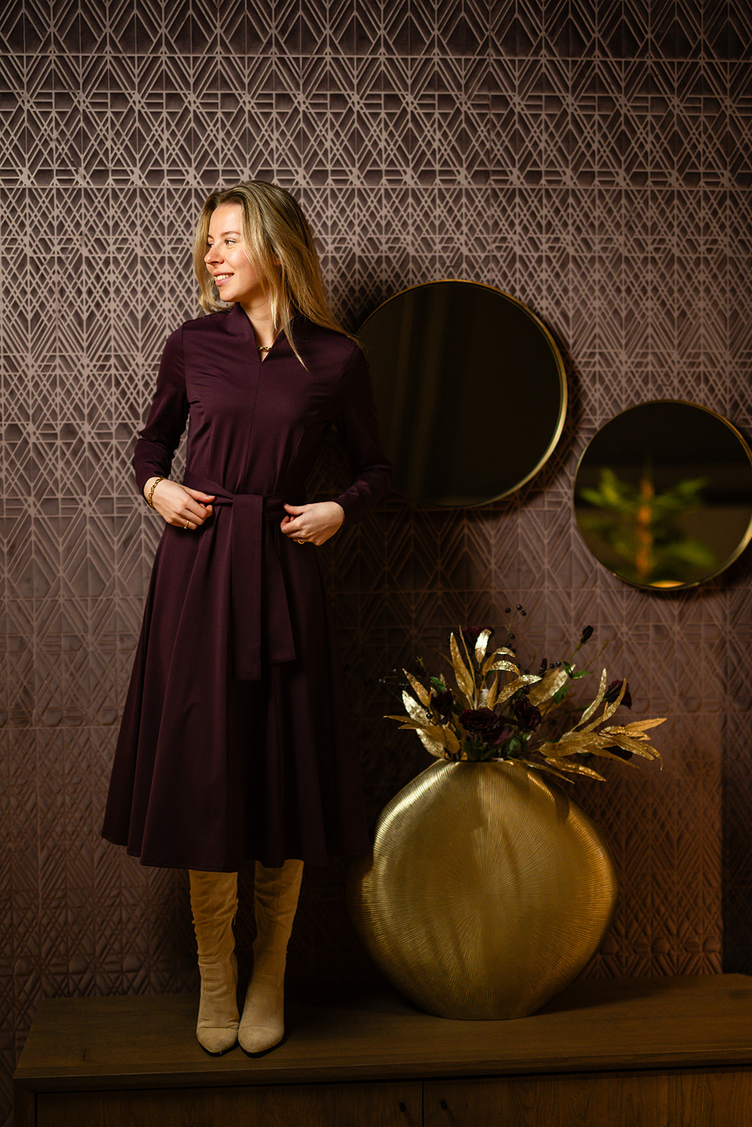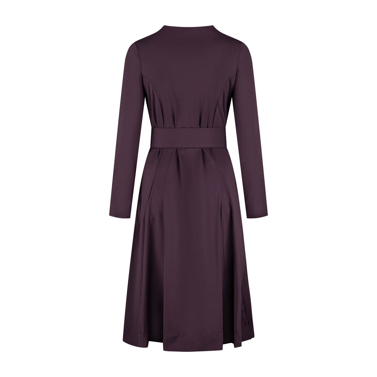 Jurk Mayah straalt ingetogen luxe uit. De aubergine kleur geeft de jurk een warme, krachtige uitstraling en maakt haar tot een exclusief item binnen de Port Lavande-garderobe. De jurk heeft een tulphals belijning en diverse deel-figuurnaden uitlopend in een wijde klokkend rokgedeelte en om de taille en breed strikceintuur. De jurk Mayah voelt comfortabel aan en oogt tegelijk stijlvol en verzorgd en is ongevoerd en gemaakt in een mooie stevige travel kwaliteitsstof.