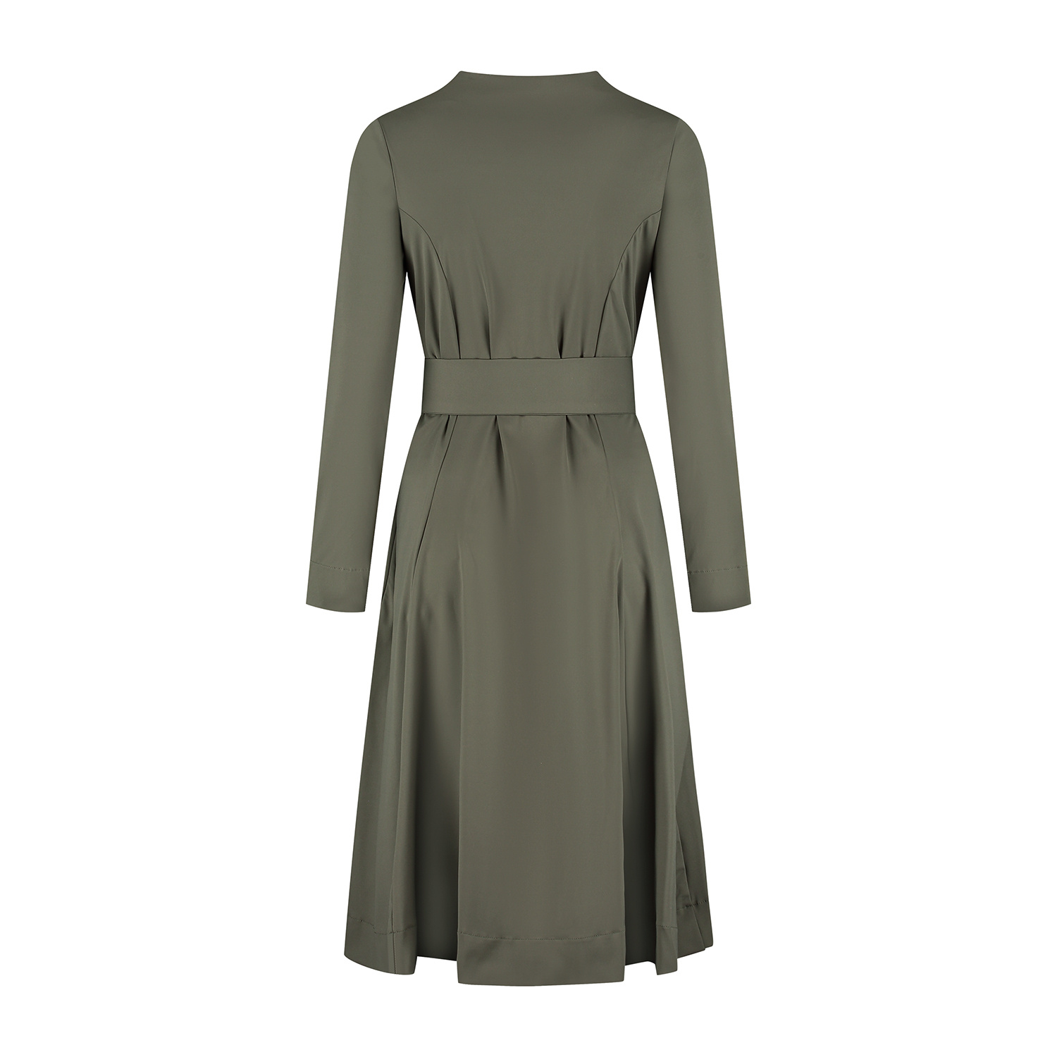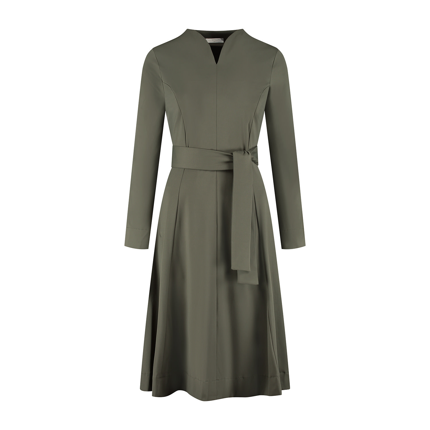 Jurk Mayah straalt ingetogen luxe uit. De olijfgroene kleur geeft de jurk een frisse, natuurlijke uitstraling en maakt haar tot een exclusief item binnen de Port Lavande-garderobe. De jurk heeft een tulphals belijning en diverse deel-figuurnaden uitlopend in een wijde klokkend rokgedeelte en om de taille en breed strikceintuur. De jurk Mayah voelt comfortabel aan en oogt tegelijk stijlvol en verzorgd en is ongevoerd en gemaakt in een mooie stevige travel kwaliteitsstof.