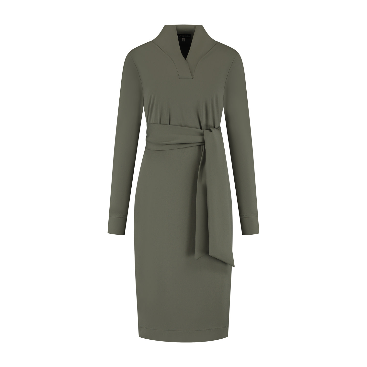De jurk Mylene in olijfgroen is een veelzijdige item voor elke garderobe. De elegante knielengte en de zachte, soepelvallende stof zorgen voor een flatterend silhouet dat comfortabel aanvoelt. De jurk heeft een opstaande V-hals en lange mouwen met manchetten voor een moderne, geklede uitstraling. De brede tailleband kan geknoopt of gestrikt worden in de taille en creëert een vrouwelijk silhouet. De warme olijfgroene tint maakt de jurk Mylene perfect voor elk seizoen. Een jurk die je keer op keer uit de kast pakt; stijlvol, comfortabel en typisch Port Lavande. Jurk Mylene is ongevoerd en gemaakt in een mooie stevige comfortabele travel kwaliteitsstof.