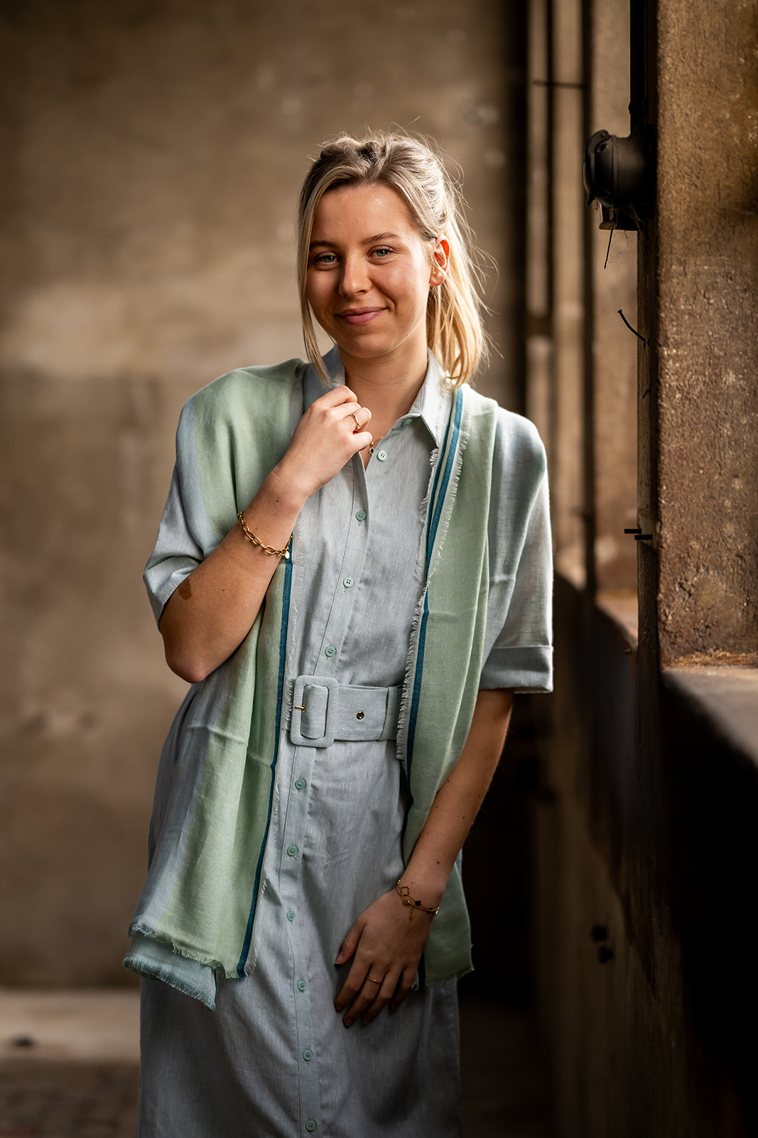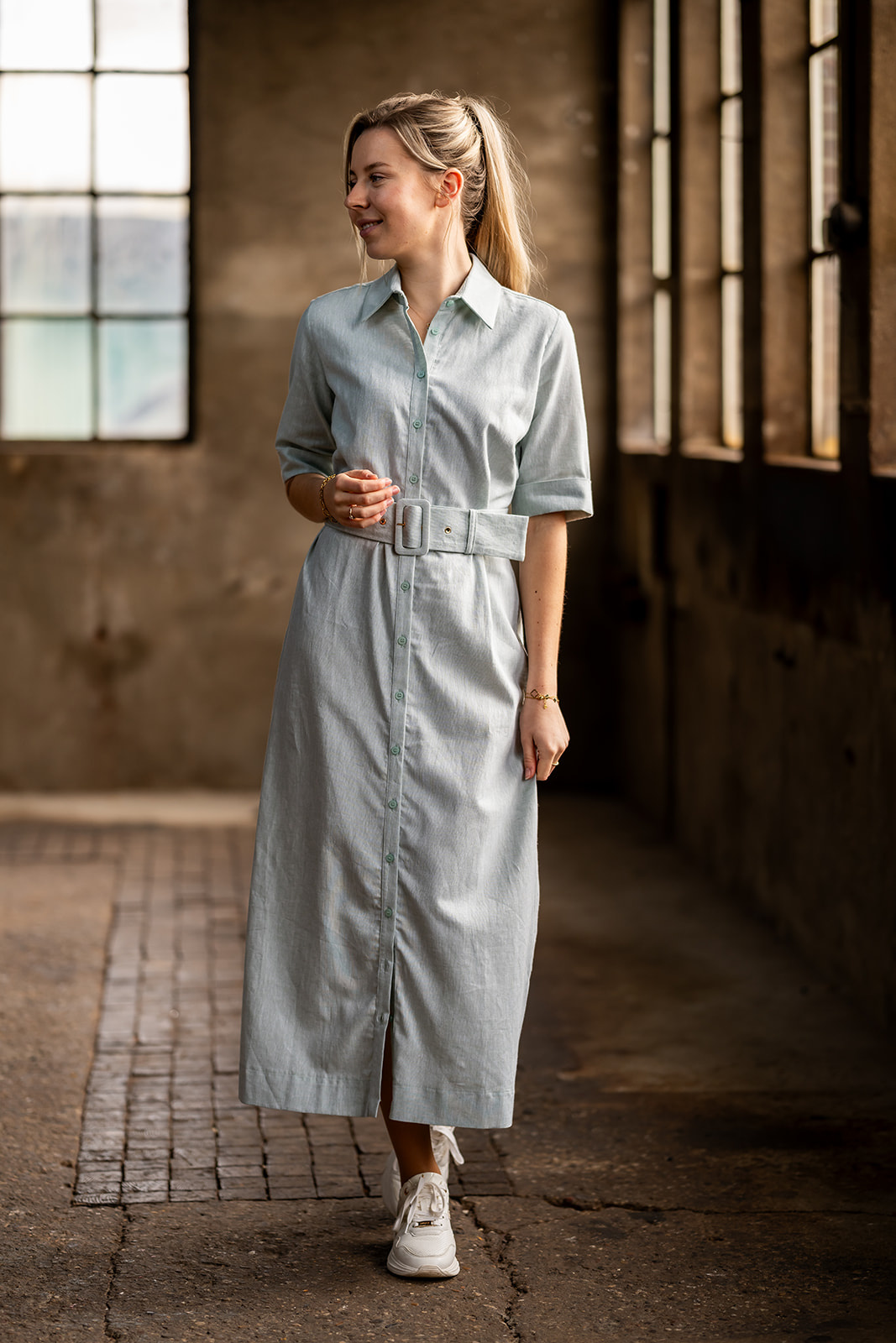 Jurk met blousekraag en volledige doorknooplijst. De jurk heeft een korte mouw met omslag en een brede ceintuur met stoffen gesp om de taille. De jurk is licht blousend van model en is gemaakt in een mooie gemeleerde linnen- katoenen kwaliteitsstof.