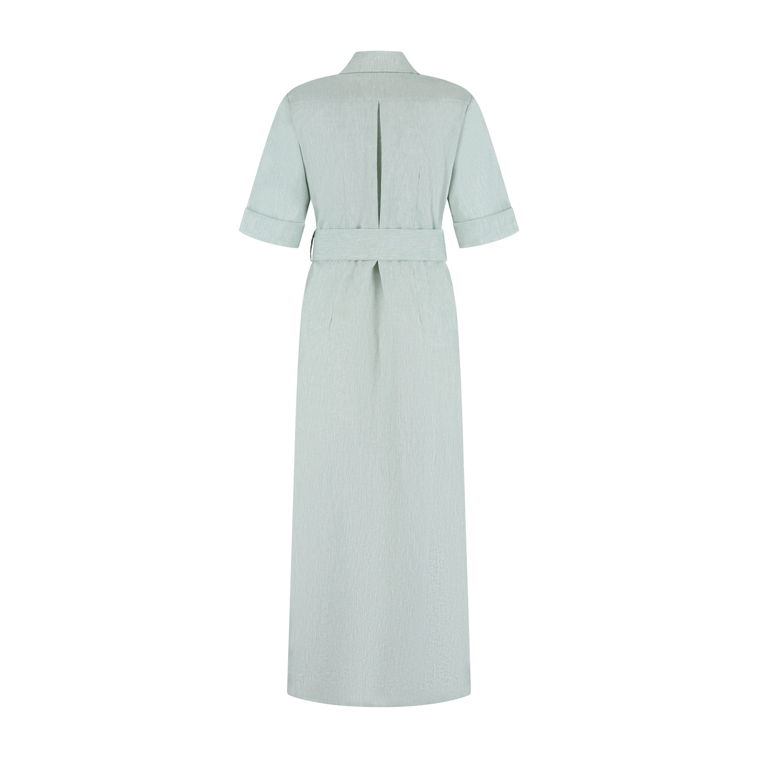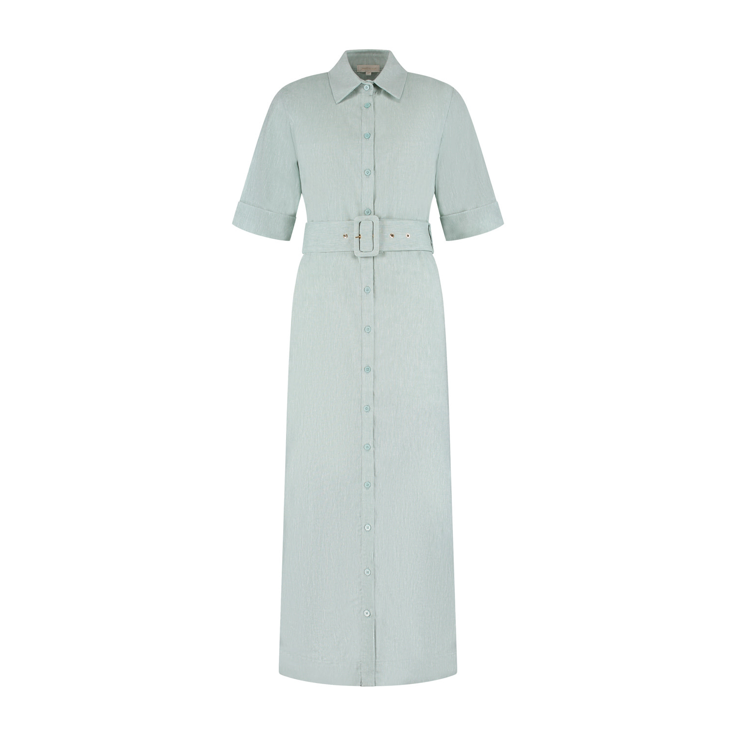 Jurk met blousekraag en volledige doorknooplijst. De jurk heeft een korte mouw met omslag en een brede ceintuur met stoffen gesp om de taille. De jurk is licht blousend van model en is gemaakt in een ...