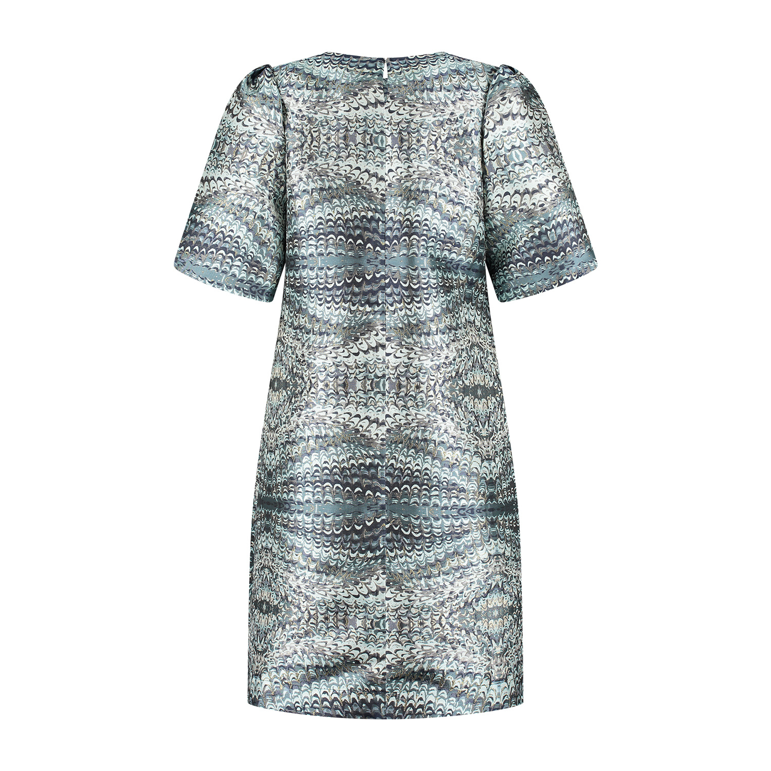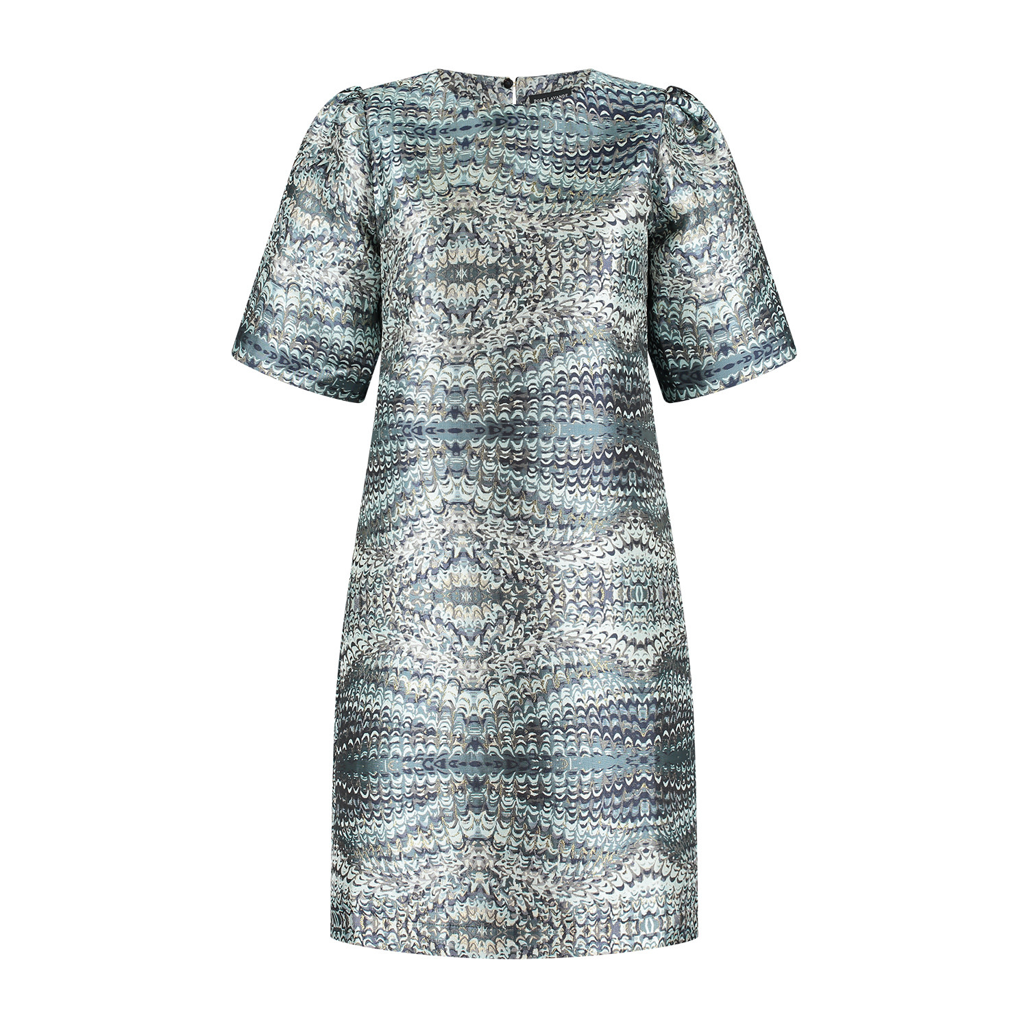 Jurk Rebecca is een elegante blauw getinte damesjurk met print die direct opvalt door haar verfijnde dessin en vrouwelijke belijning. De zachte blauwtinten in combinatie met het patroon geven de jurk een stijlvolle uitstraling. De jurk heeft een A-lijn model en korte ballonmouwen en sluit middenachter d.m.v. een splitje/blindknoopje. Deze exclusieve jurk is voorzien van voeringstof en is gemaakt in een mooie geweven jacquard kwaliteitsstof.