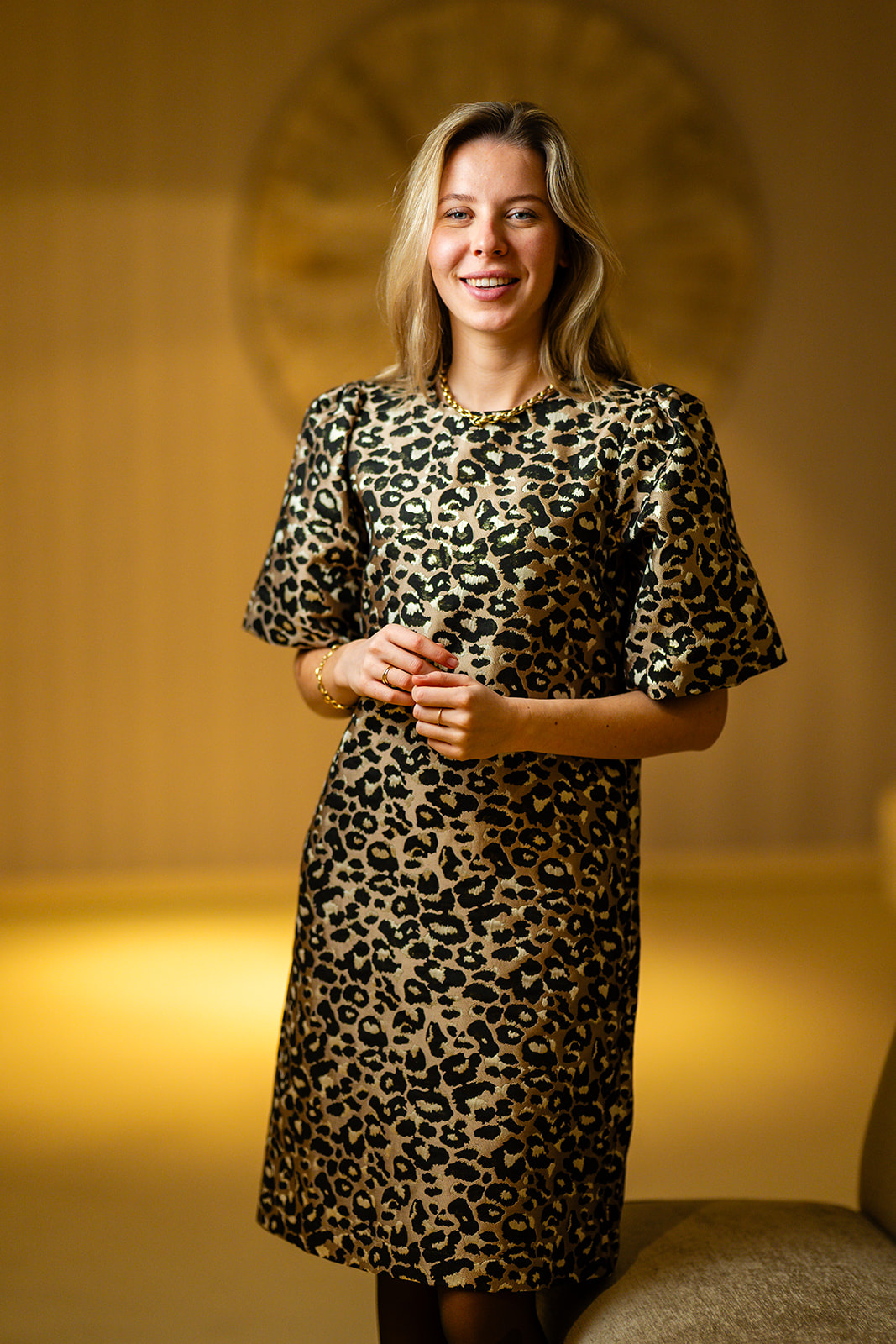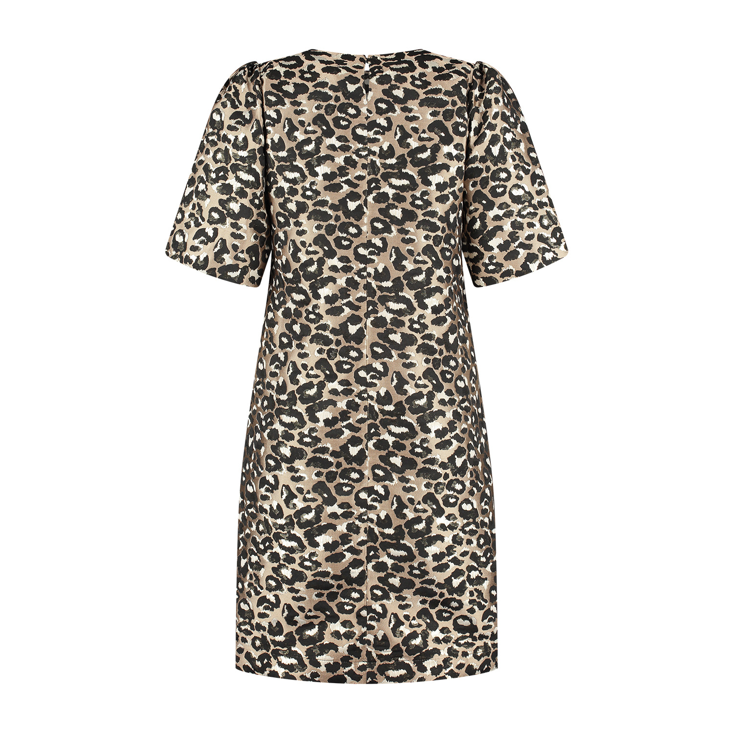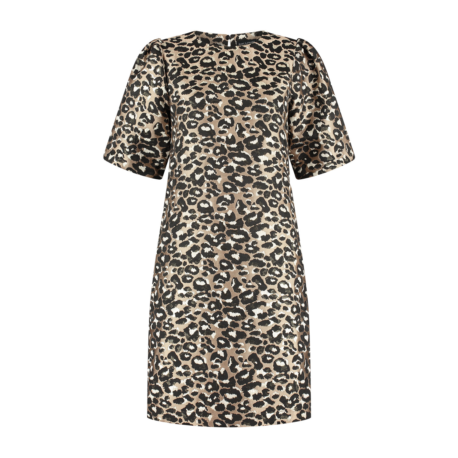 Jurk Rebecca is een elegante zand-bruin getinte damesjurk met print die direct opvalt door haar verfijnde dessin en vrouwelijke belijning. De zachte bruintinten in combinatie met het patroon geven de jurk een stijlvolle uitstraling. De jurk heeft een A-lijn model en korte ballonmouwen en sluit middenachter d.m.v. een splitje/blindknoopje. Deze exclusieve jurk is voorzien van voeringstof en is gemaakt in een mooie geweven jacquard kwaliteitsstof.