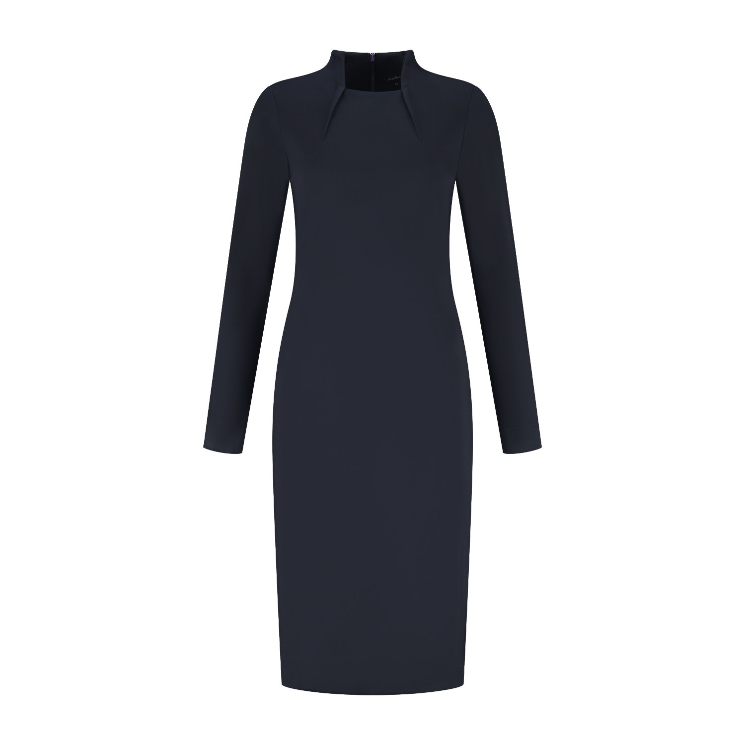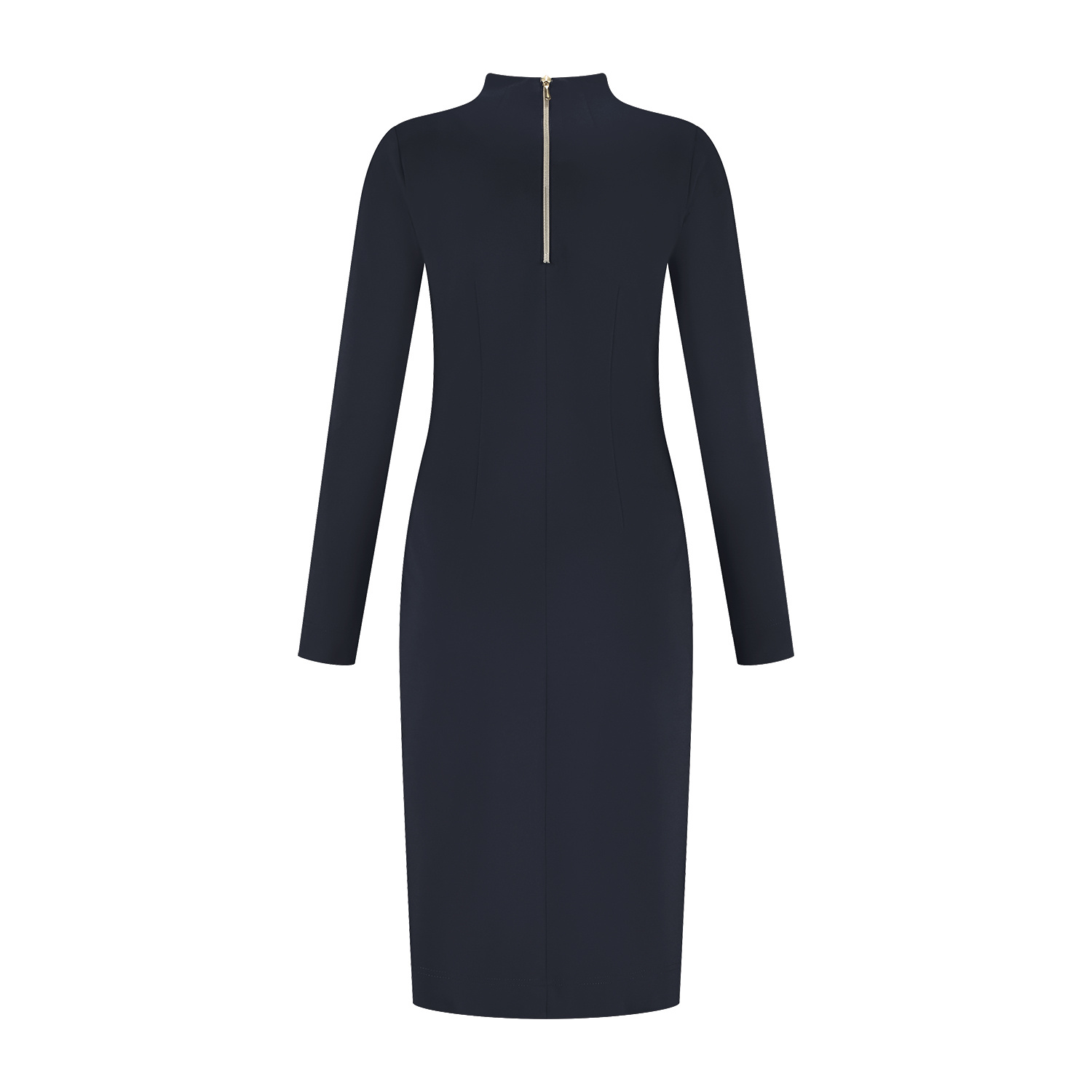 Jurk met aangeknipte kraag en plooidetail bij de voorkant van de halslijn. De jurk heeft lange mouwen en is door de figuurnaden achteraan heeft de jurk een getailleerde pasvorm. De jurk sluit middenachter d.m.v. een lichtgoudkleurige rits en is gemaakt in een luxe tricotpunto kwaliteitsstof.