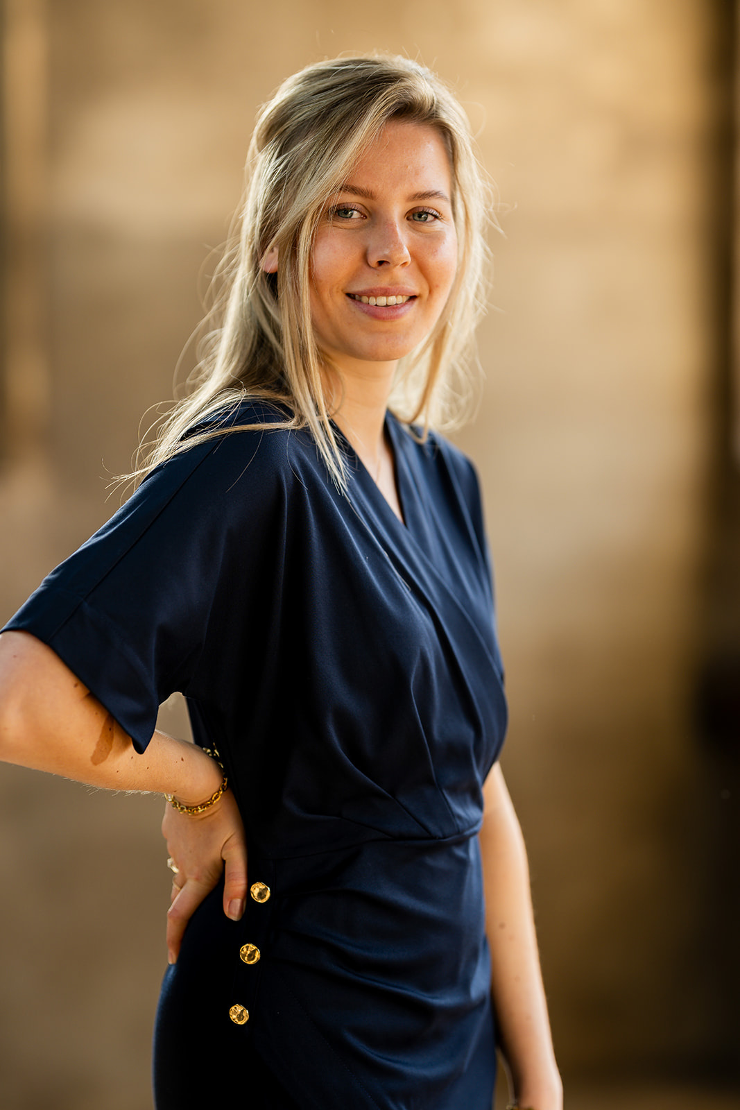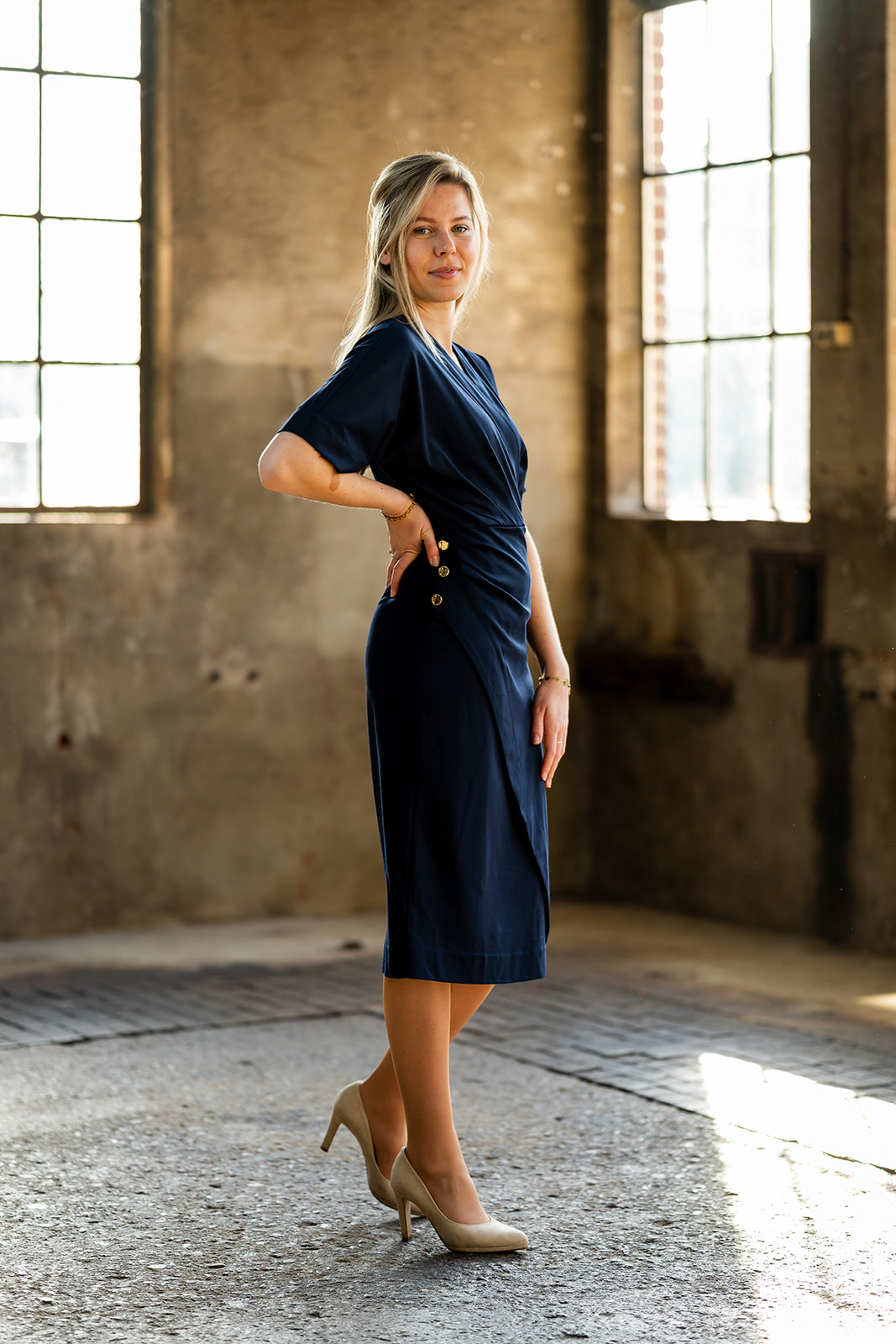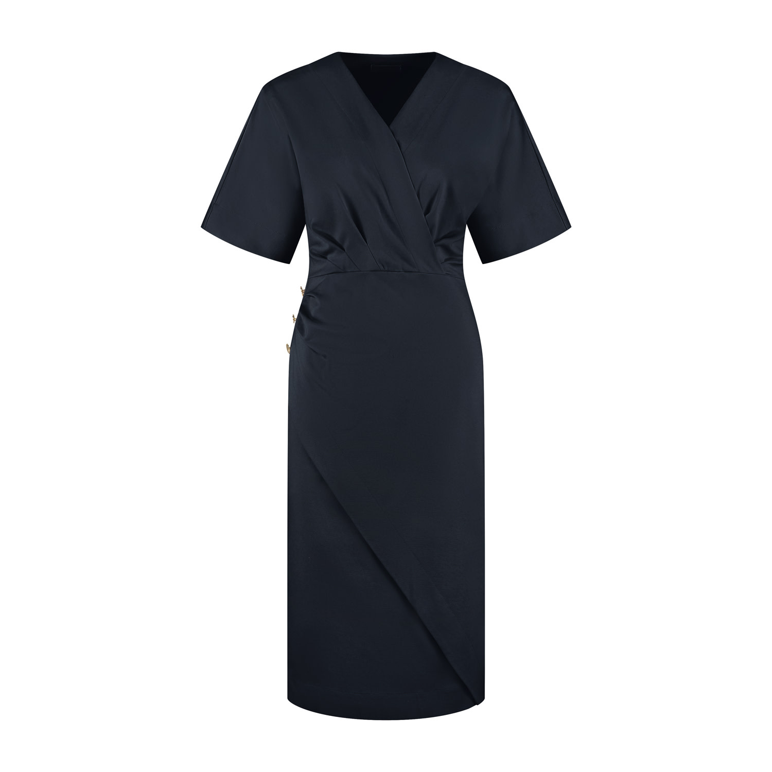 Jurk met iets oversized overslag bovenpand. De overslag zit ver over elkaar heen en heeft plooitjes vanuit de verhoogde taillenaad. Het rokgedeelte heeft aan de zijkant ook plooitjes voorzien van drie knopen. Het rokgedeelte heeft een royale overslag welke in de zijnaad is dicht gestikt. Deze jurk is niet voorzien van een voeringstof en is gemaakt in een luxe tricotpunto kwaliteitstof.