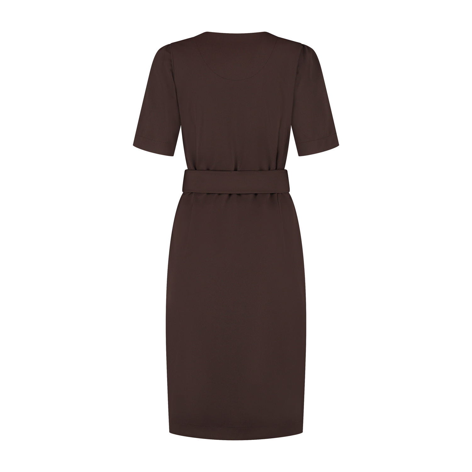 De jurk Sofie in donkerbruin van Port Lavande is een moderne klassieker met een verfijnde uitstraling. De jurk heeft een mooie dubbele V-halslijn en subtiele rimpeling in de korte mouwen. De bijpassen...