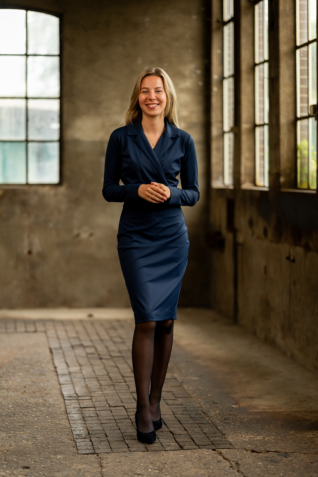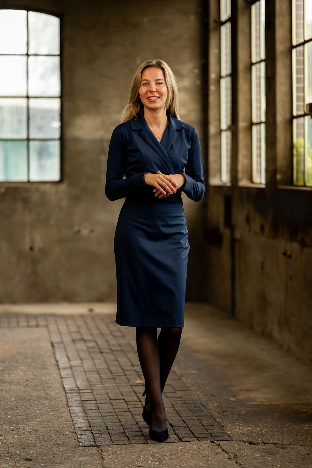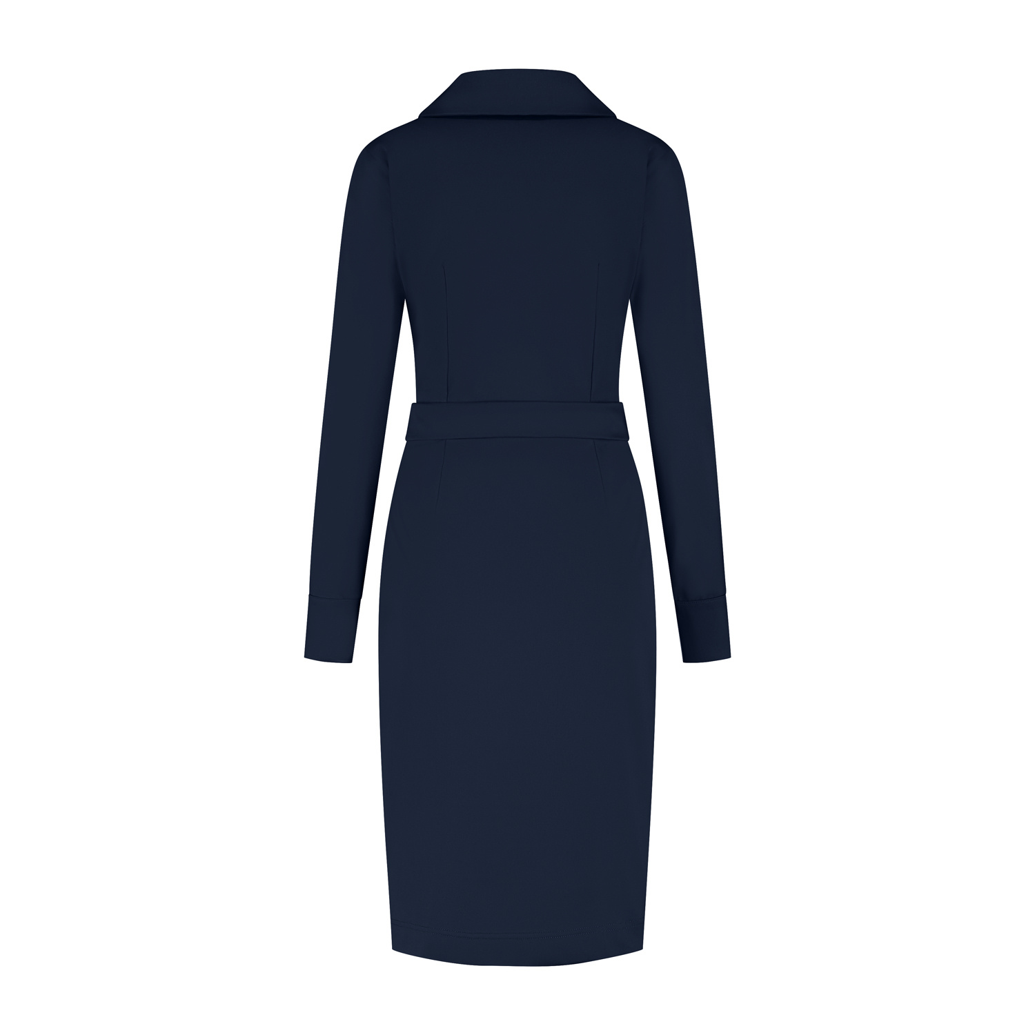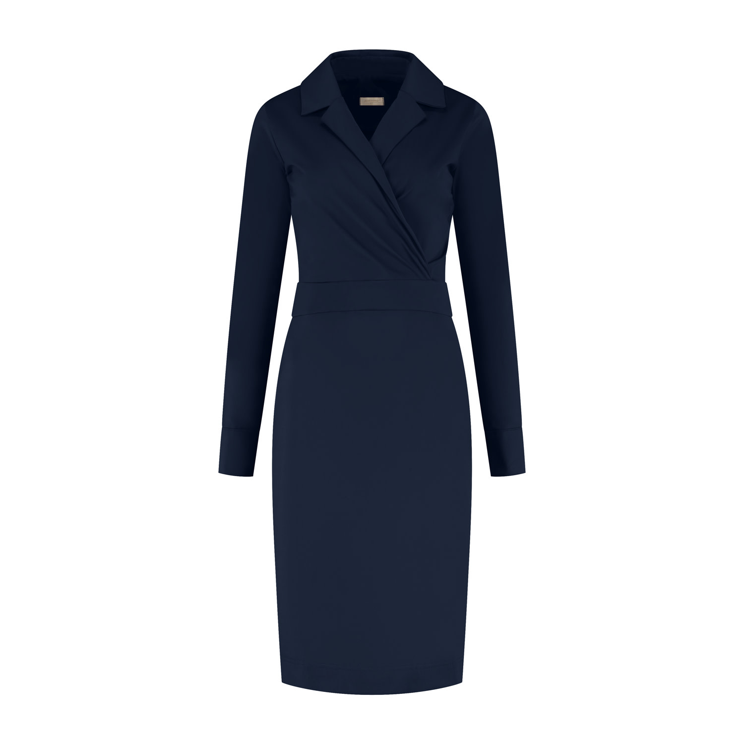 Jurk met reverkraag en lange mouwen met brede boord en splitje. De jurk heeft een bovenpas met een overslaglook en een smalle taillepas. De jurk heeft een licht getailleerde pasvorm en is gemaakt in een mooie stevige travel kwaliteitsstof.