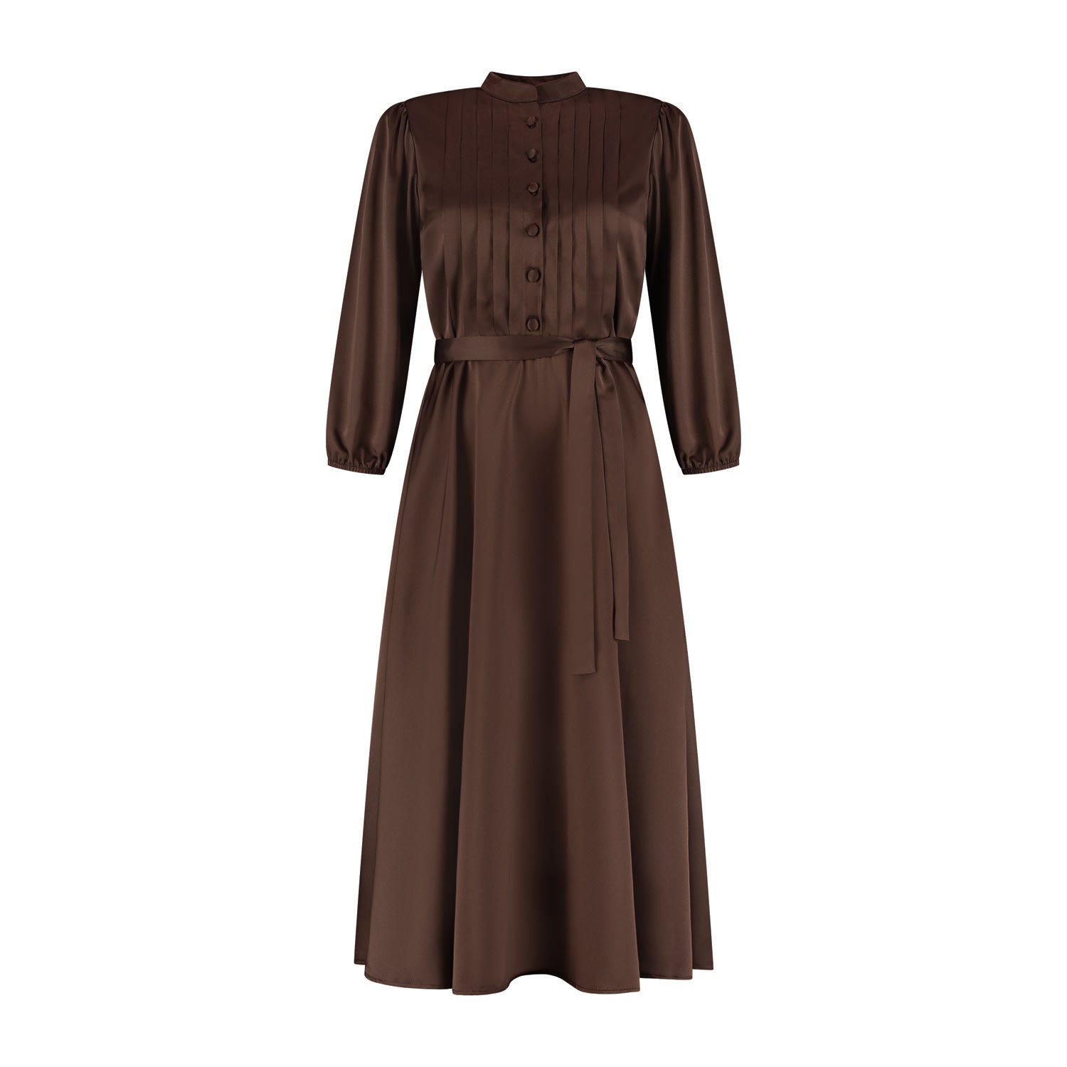 Deze jurk Tara is ontworpen met oog voor detail en is een veelzijdige toevoeging aan elke garderobe. De jurk heeft een vrouwelijke, licht getailleerde pasvorm die mooi wordt geaccentueerd door...Deze jurk Tara is ontworpen met oog voor detail en is een veelzijdige toevoeging aan elke garderobe. De jurk heeft een vrouwelijke, licht getailleerde pasvorm die mooi wordt geaccentueerd door de bijpassende strikceintuur in de taille. De ingelegde plooien op het voorpand, het kraagboordje en de stofknoopsluiting tot aan de hals geven het ontwerp een klassieke, luxe uitstraling. De 7/8 mouwen met elastisch bandje zorgen voor een elegante en comfortabele fit. Jurk Tara is gemaakt van een soepelvallende satijnlookstof met een lichte glans en is geheel voorzien van een voeringstof. De midi-lengte maakt de jurk geschikt voor zowel dagelijkse momenten als meer geklede gelegenheden.KleurdonkerbruinMateriaal100% polyesterMerkPort LavandeWasadviesfijnwas programma max. 30°C - hangend drogenMaatadvieszie onderstaande tabel, afmetingen zijn een indicatie.MaatTaillewijdteHeupwijdteAchterlengteMouwlengteXXS7511012050XS8011512050S8512012050M9012512050L9513012050XL10113512050XXL10814012050XXXL11514512050 Toon meerToon minder