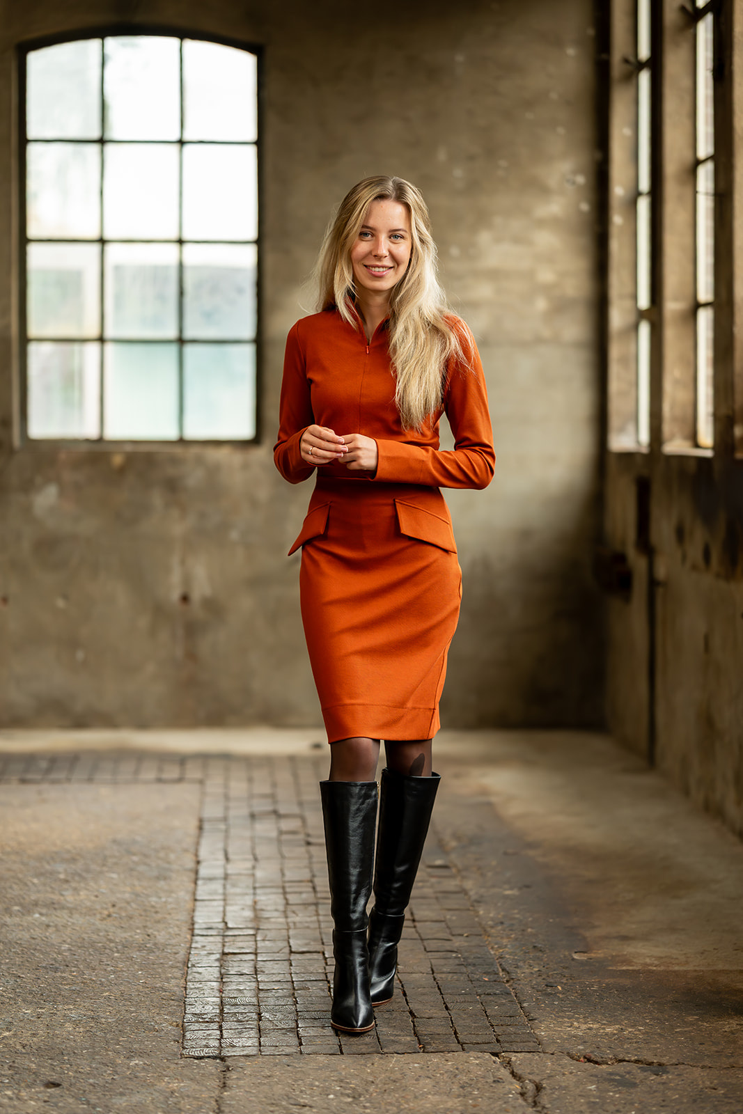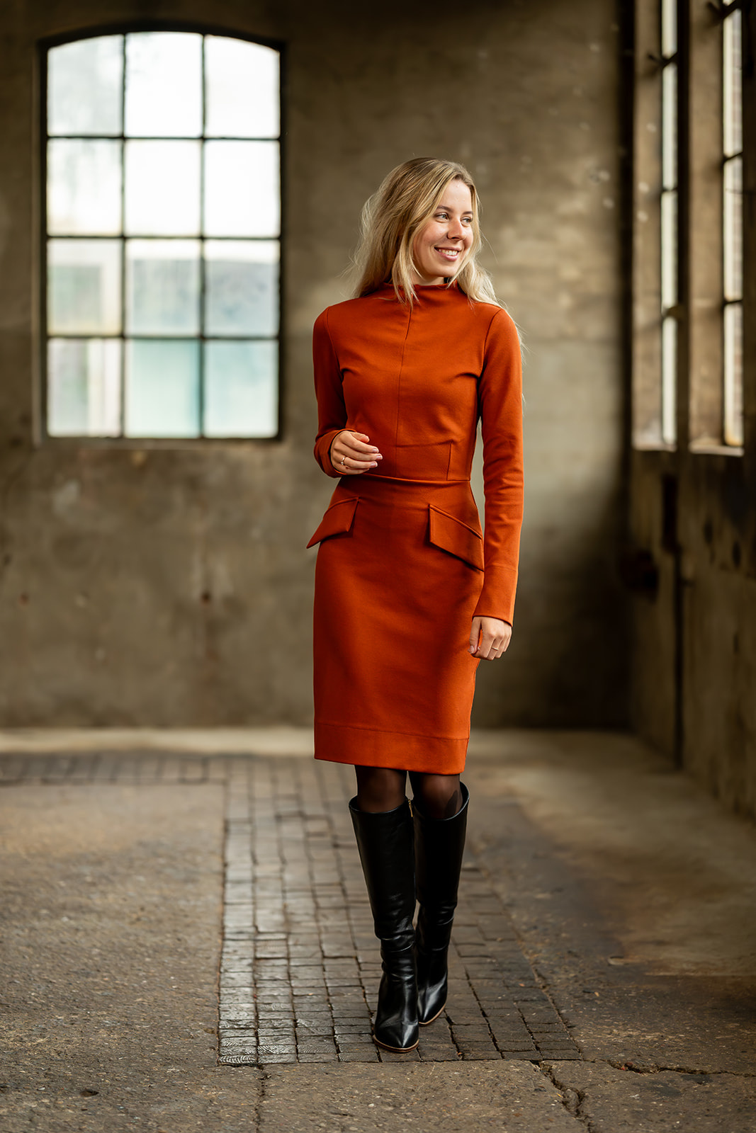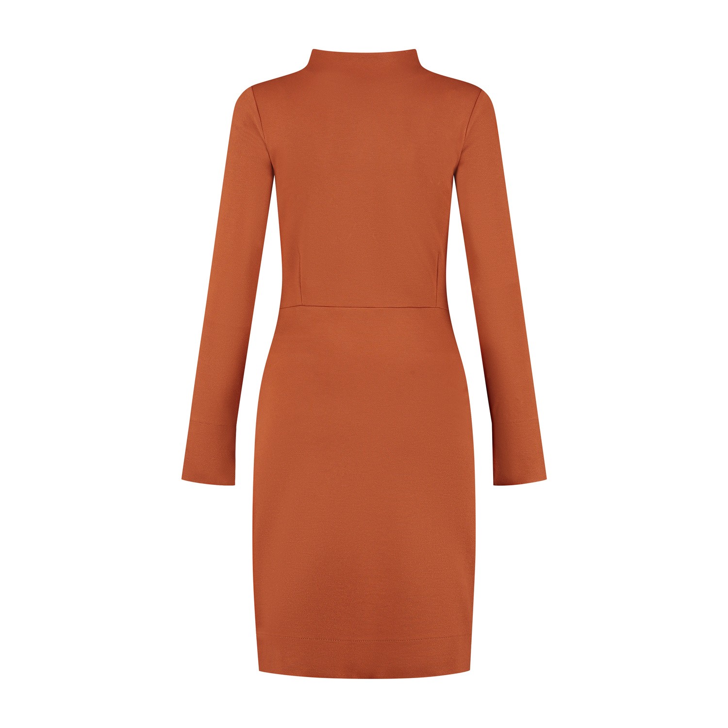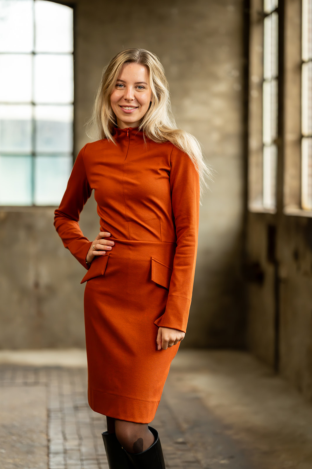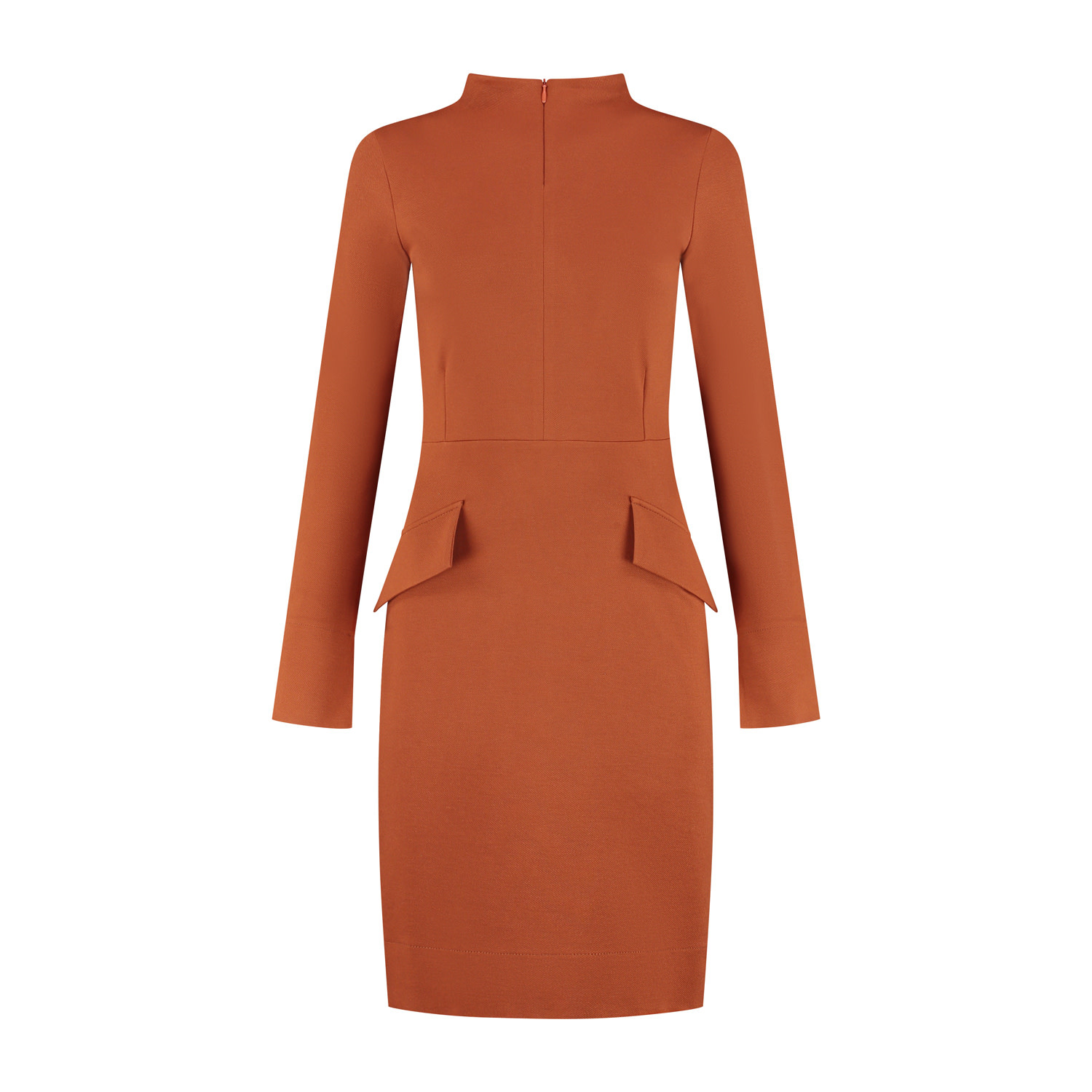 Jurk met aangeknipte kraag met blinde ritssluiting. De jurk heeft lange mouwen met brede manchetten die eventueel omgeslagen kunnen worden. De jurk is licht getailleerd en heeft fake kleppen op het voorpand. Deze jurk is gemaakt in een tricot kwaliteitsstof met een lichte ribstructuur.