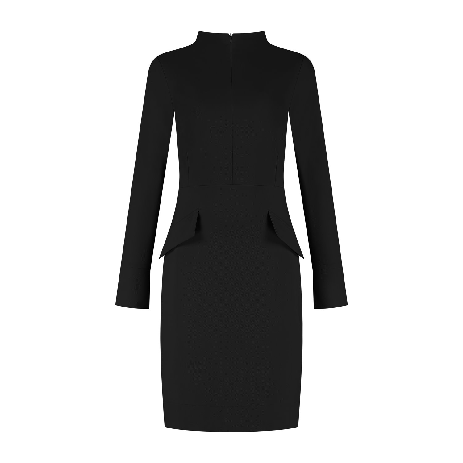 Jurk met aangeknipte kraag met blinde ritssluiting. De jurk heeft lange mouwen met brede manchetten die eventueel omgeslagen kunnen worden. De jurk is licht getailleerd en heeft fake kleppen op het voorpand. Deze jurk is gemaakt in een tricot kwaliteitsstof met een lichte ribstructuur.