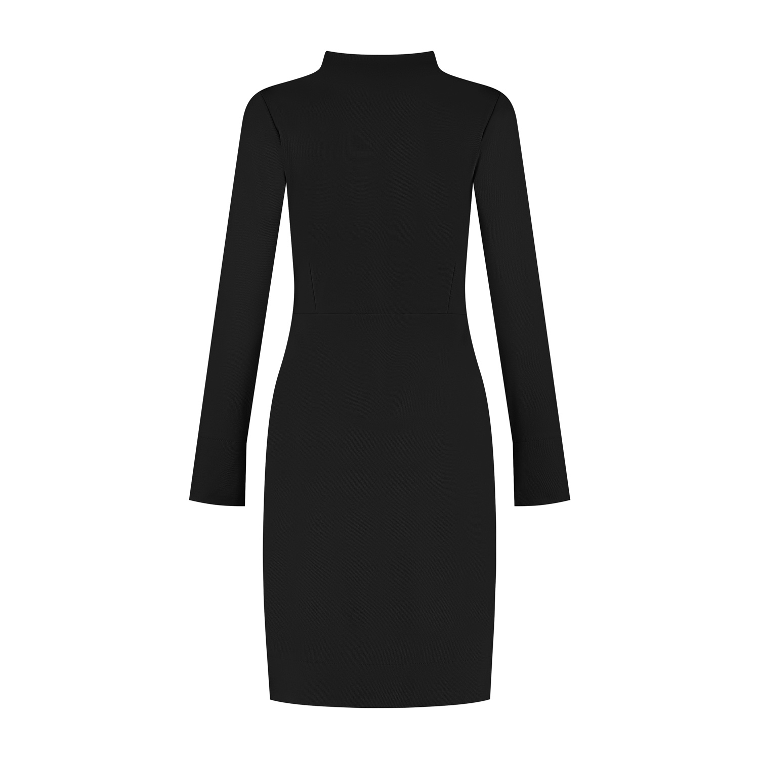 Jurk met aangeknipte kraag met blinde ritssluiting. De jurk heeft lange mouwen met brede manchetten die eventueel omgeslagen kunnen worden. De jurk is licht getailleerd en heeft fake kleppen op het vo...