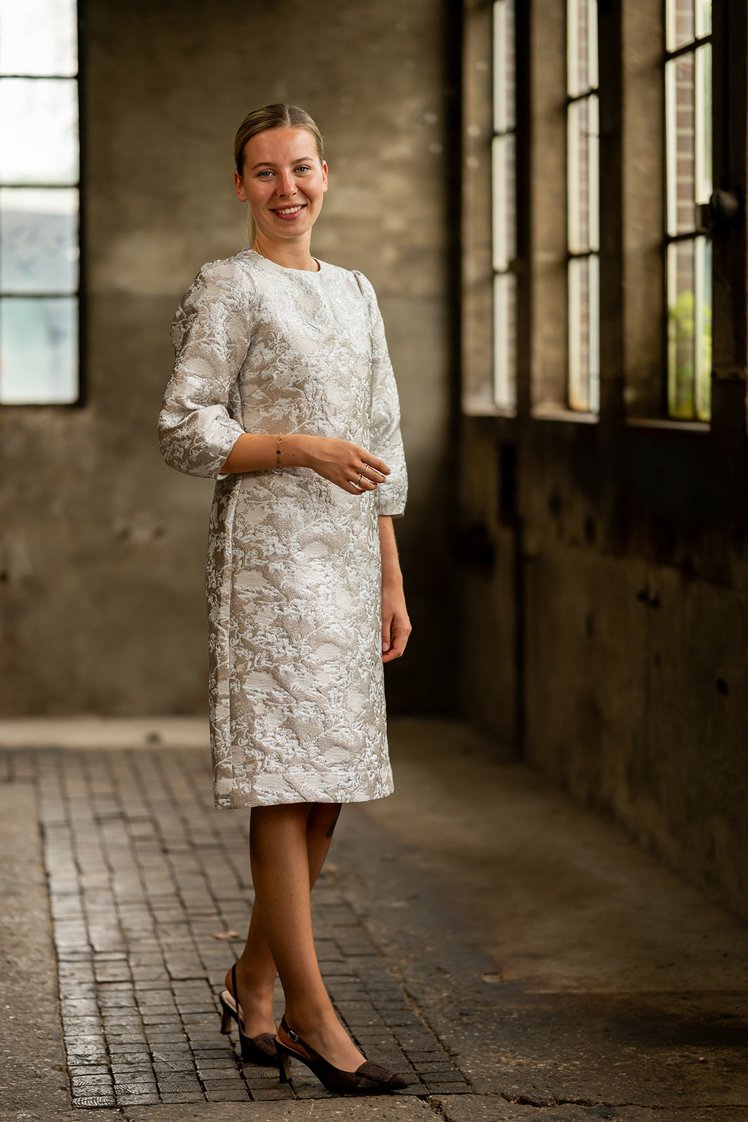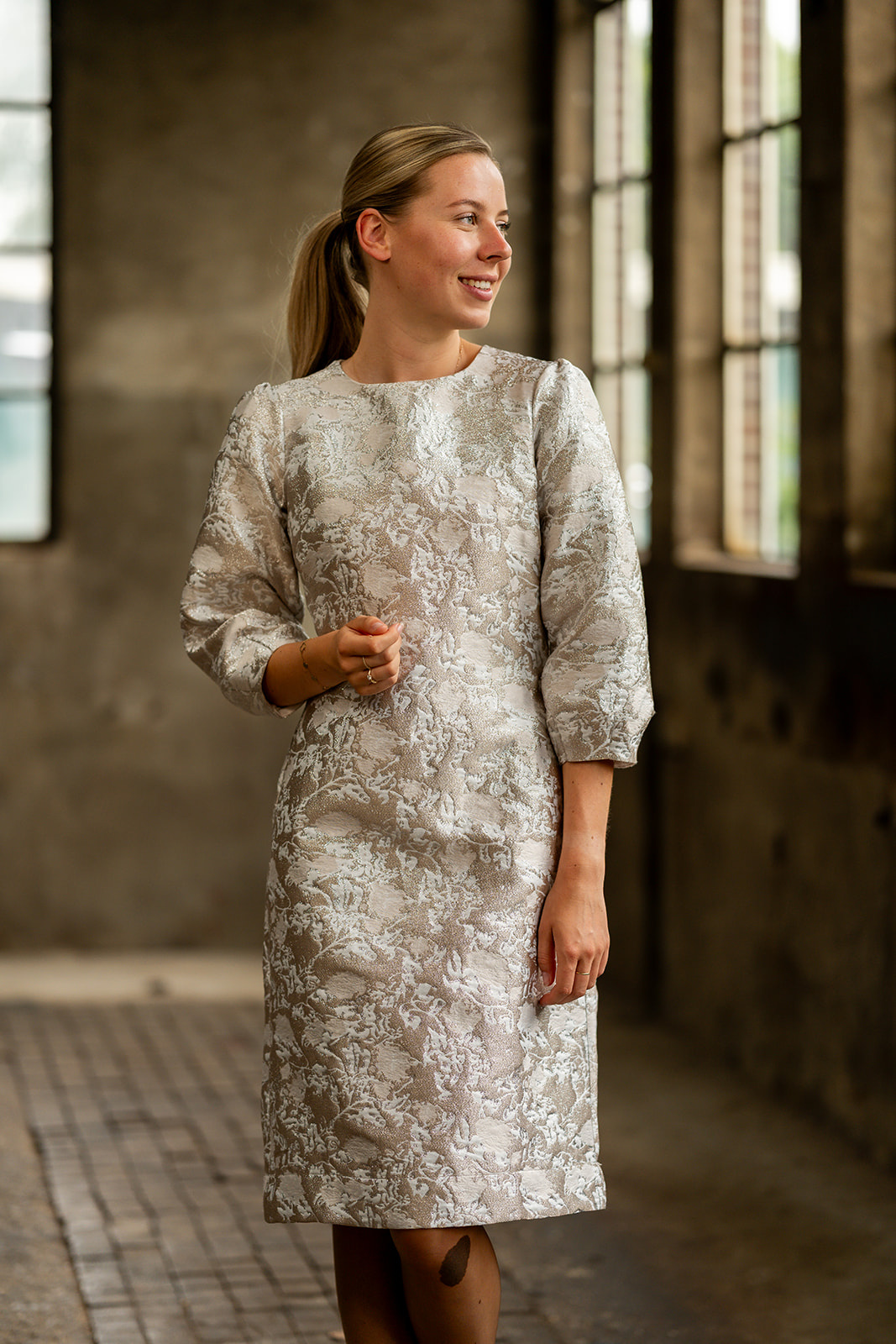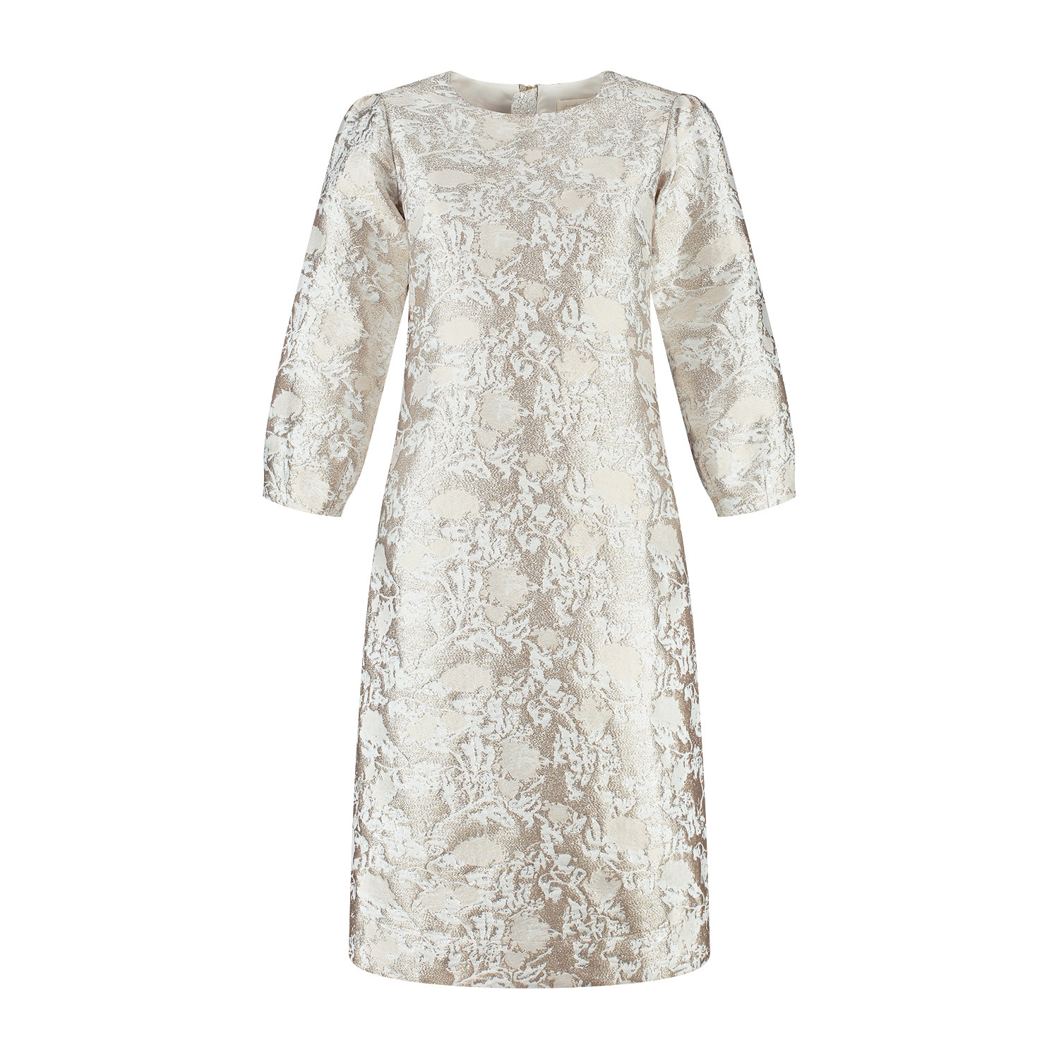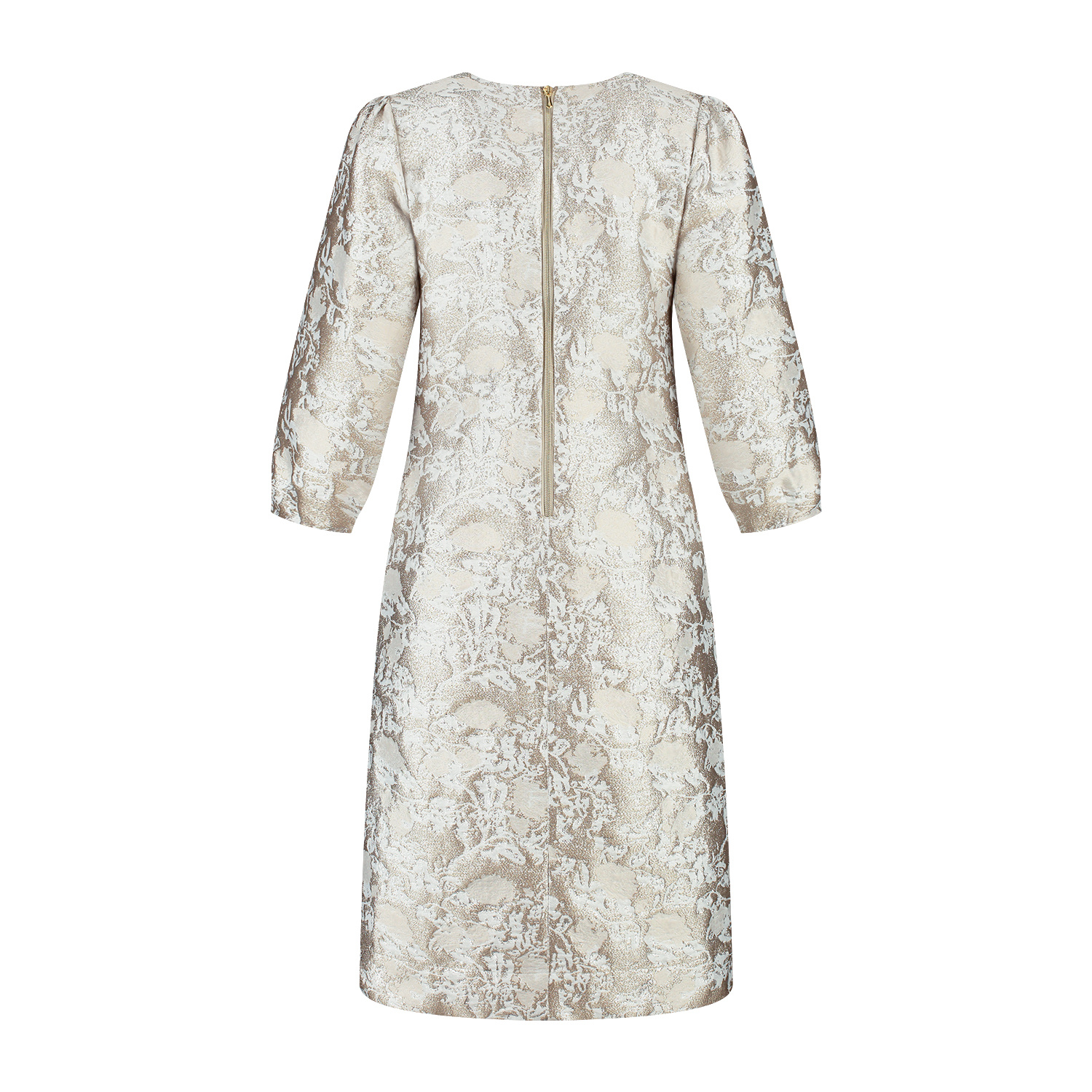 Jurk met ronde halslijn en 7/8 mouwen. Deze jurk heeft een A-lijn pasvorm en is iets losvallend van model en sluit middenachter d.m.v. een lichte goudkleurige rits. Deze exclusieve jurk is gemaakt in een mooie geweven jacquard kwaliteitsstof.