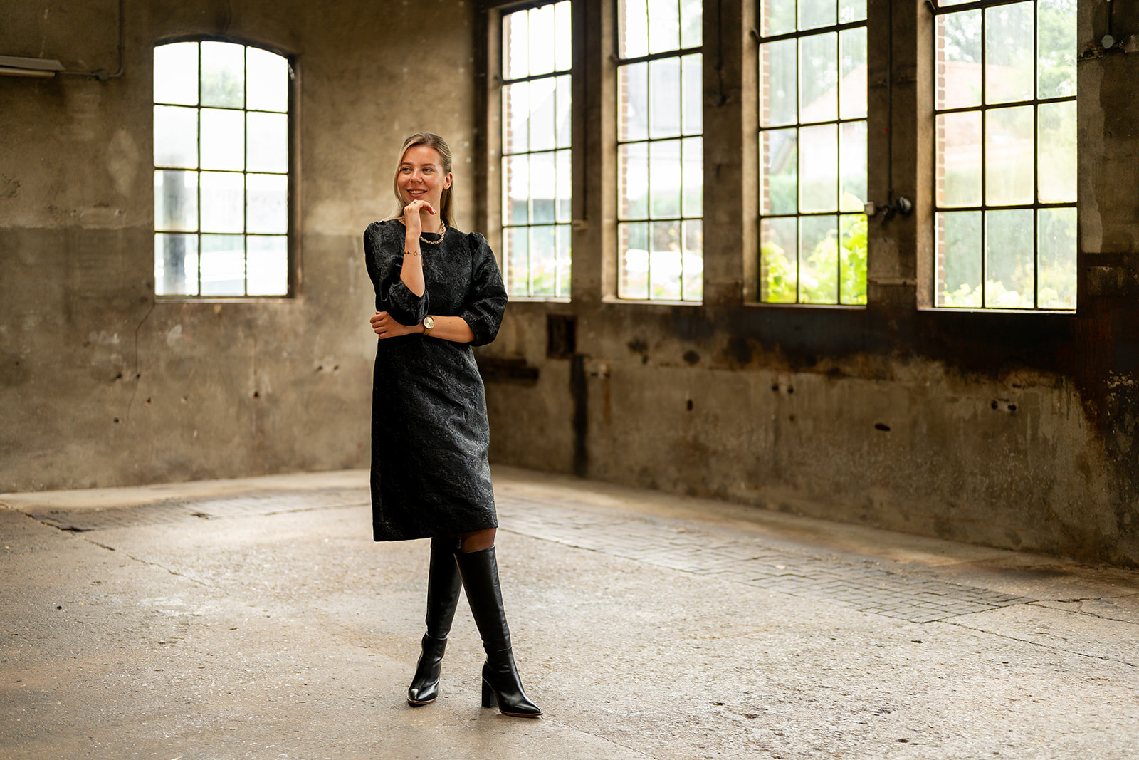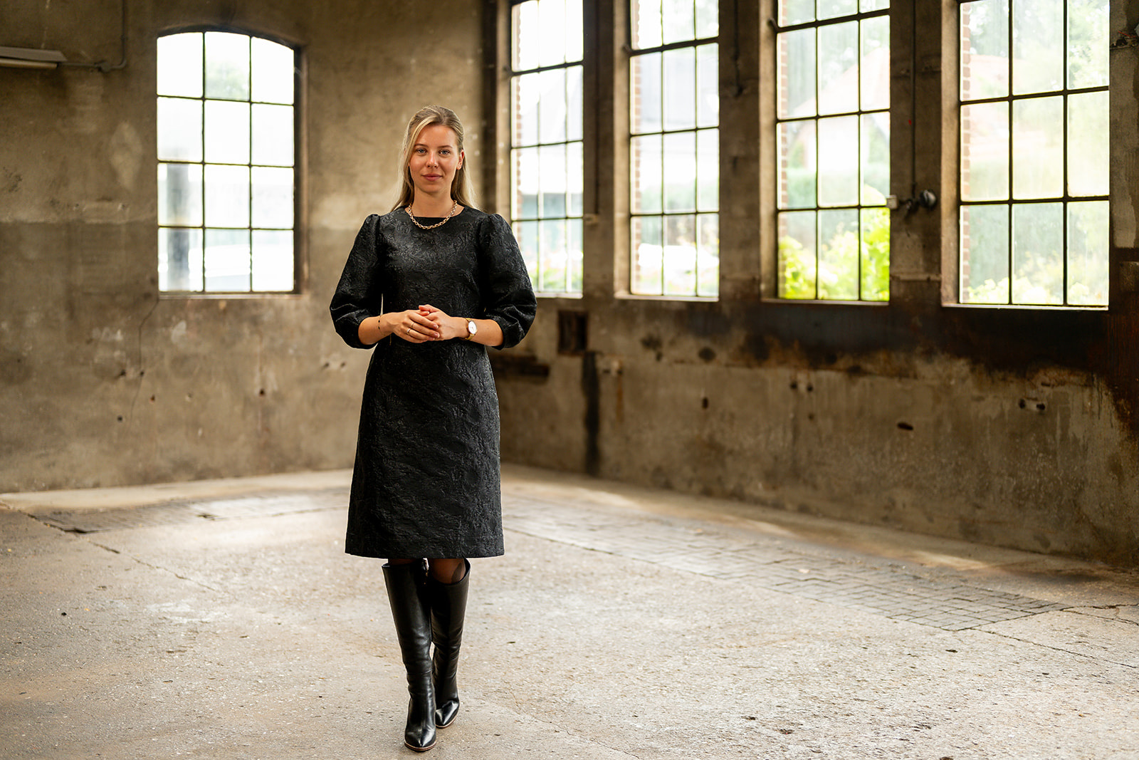 Jurk met ronde halslijn en 7/8 mouwen. Deze jurk heeft een A-lijn pasvorm en is iets losvallend van model en sluit middenachter d.m.v. een lichte goudkleurige rits. Deze exclusieve jurk is gemaakt in ...