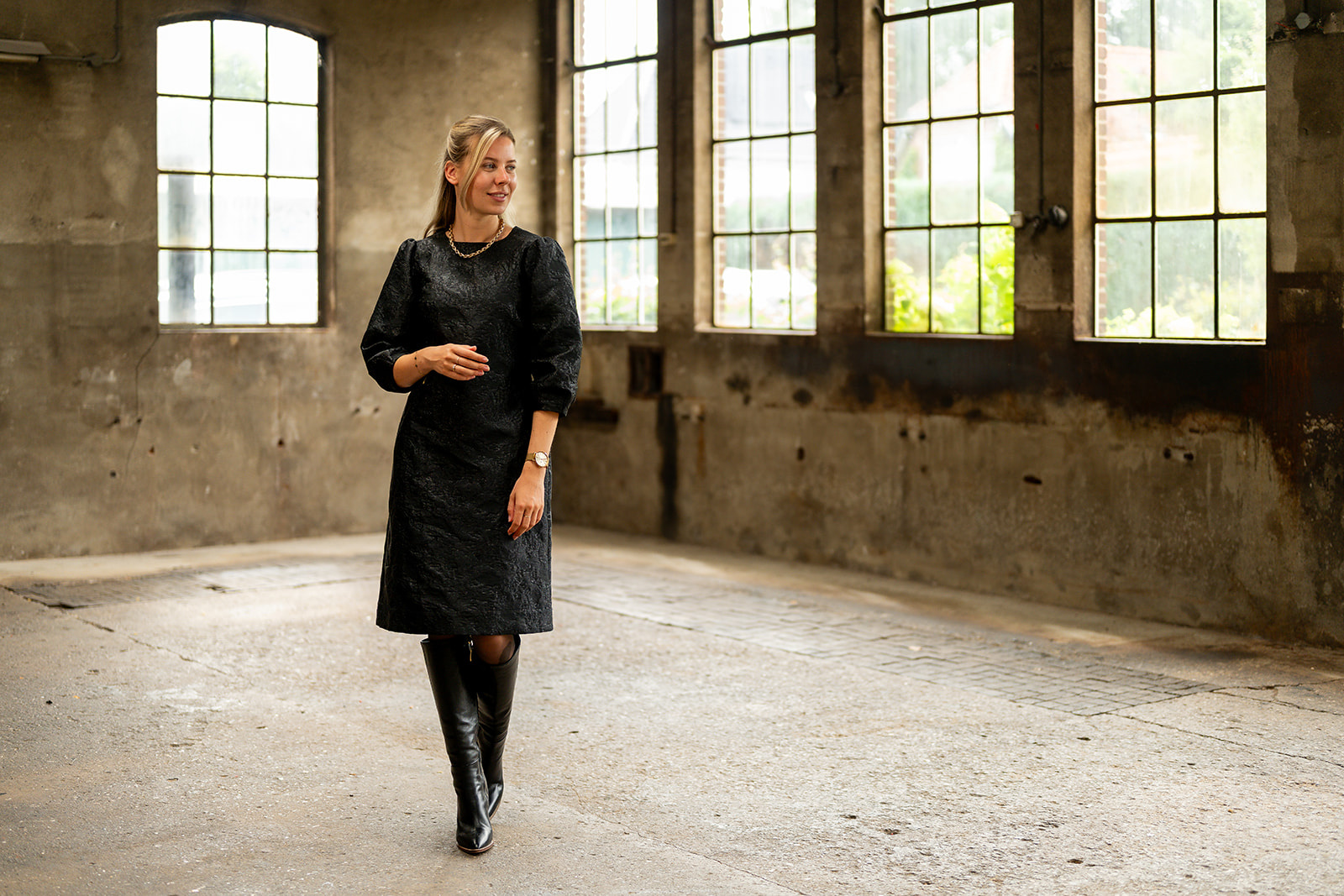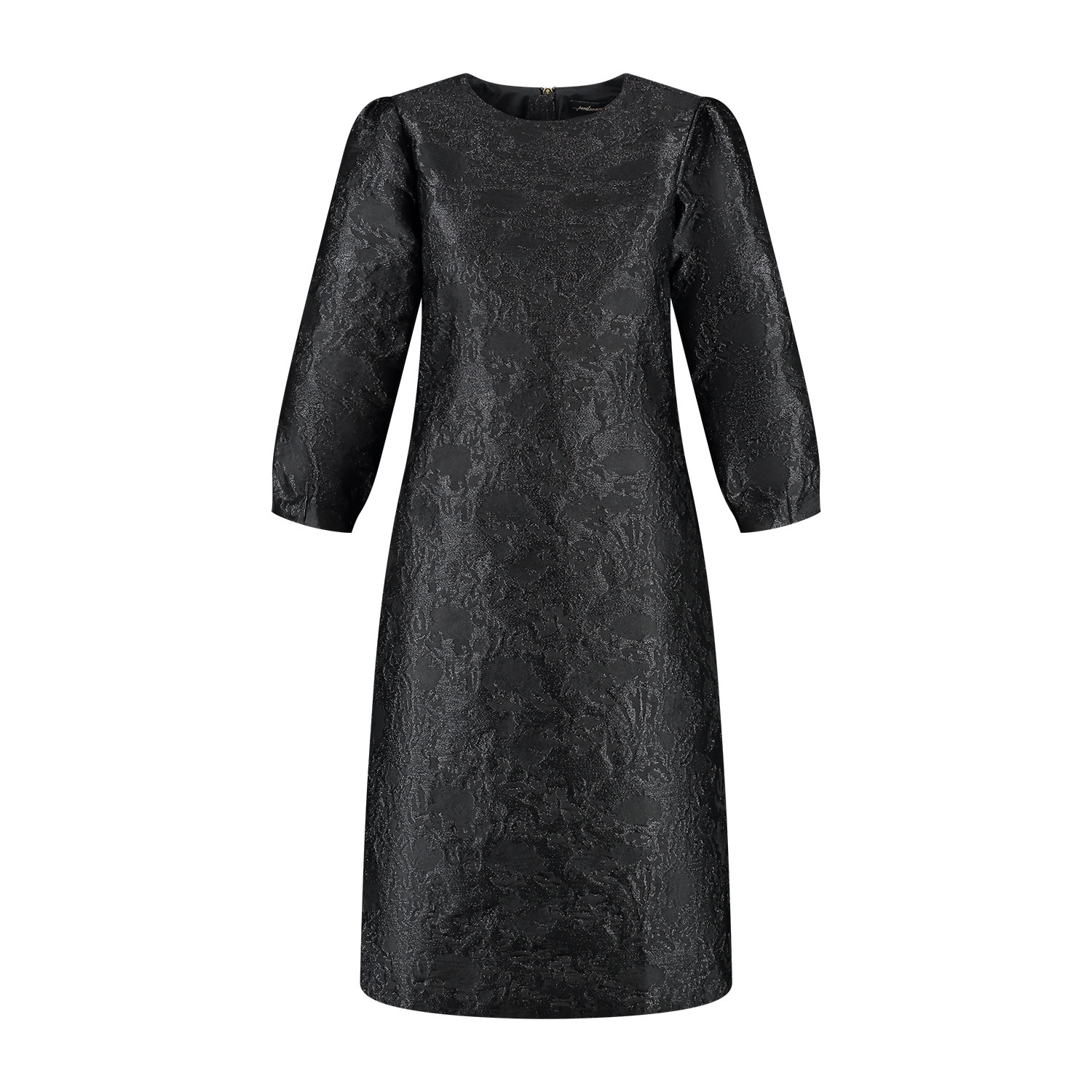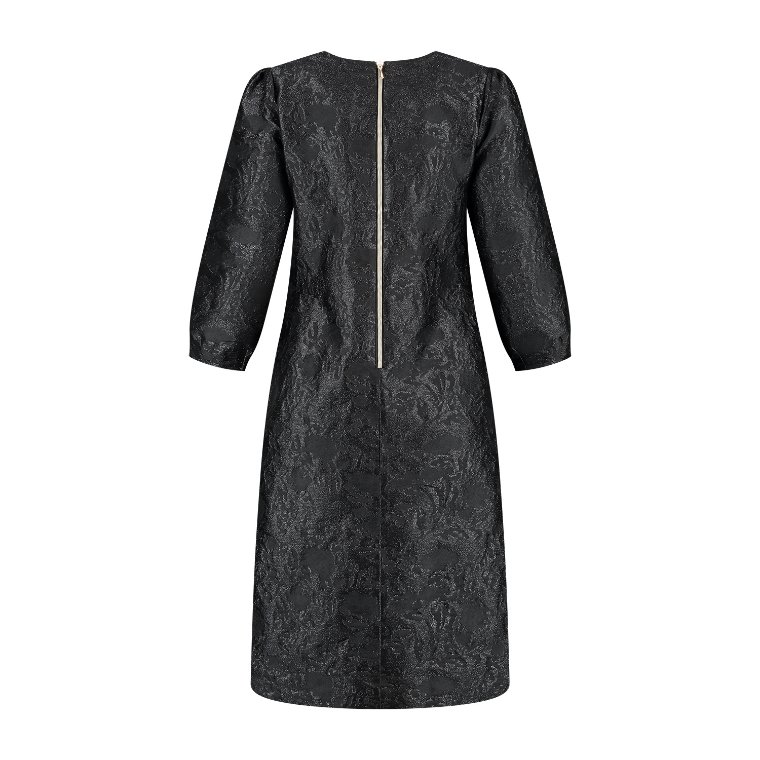 Jurk met ronde halslijn en 7/8 mouwen. Deze jurk heeft een A-lijn pasvorm en is iets losvallend van model en sluit middenachter d.m.v. een lichte goudkleurige rits. Deze exclusieve jurk is gemaakt in een mooie geweven jacquard kwaliteitsstof.