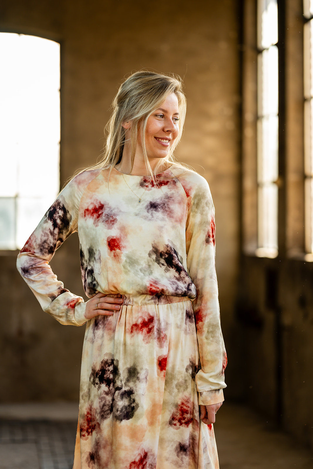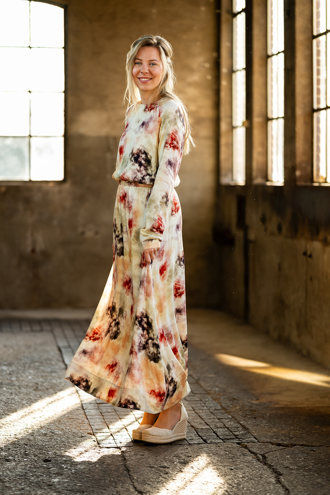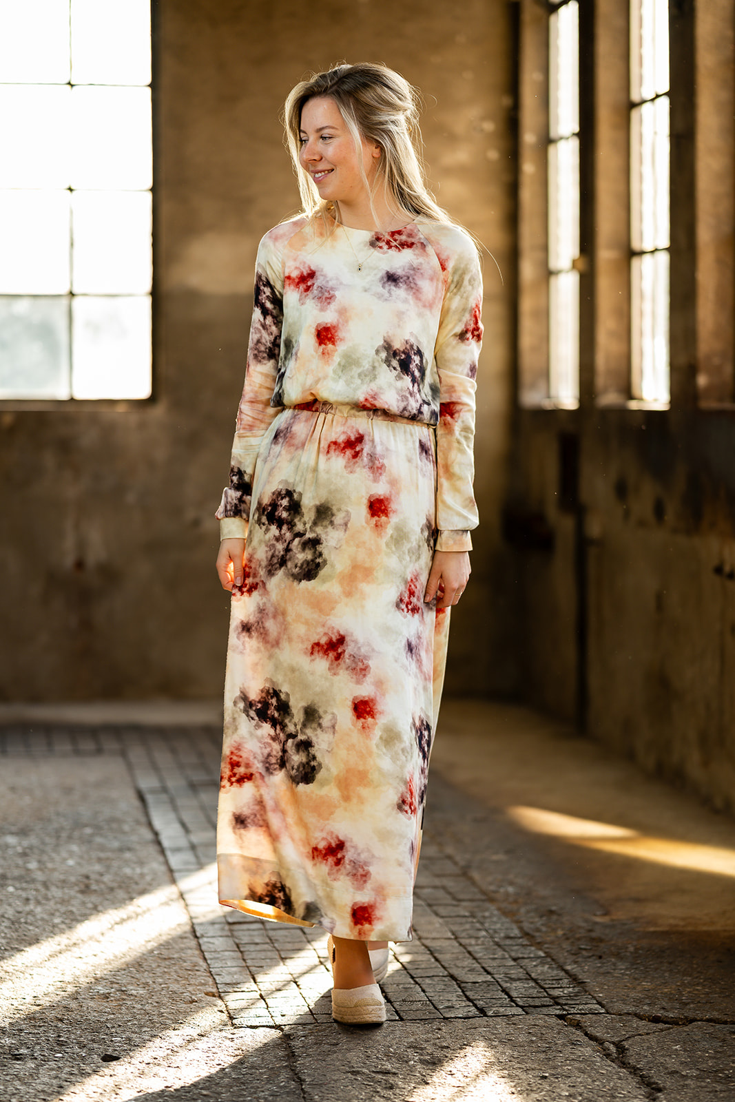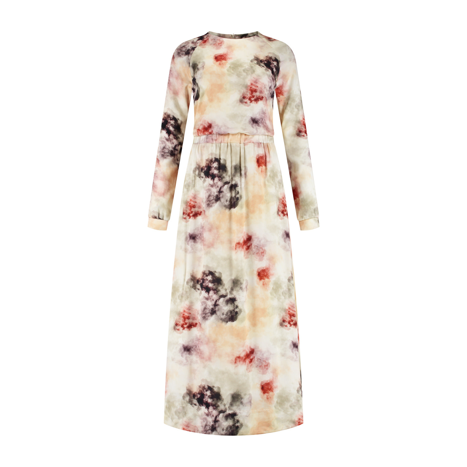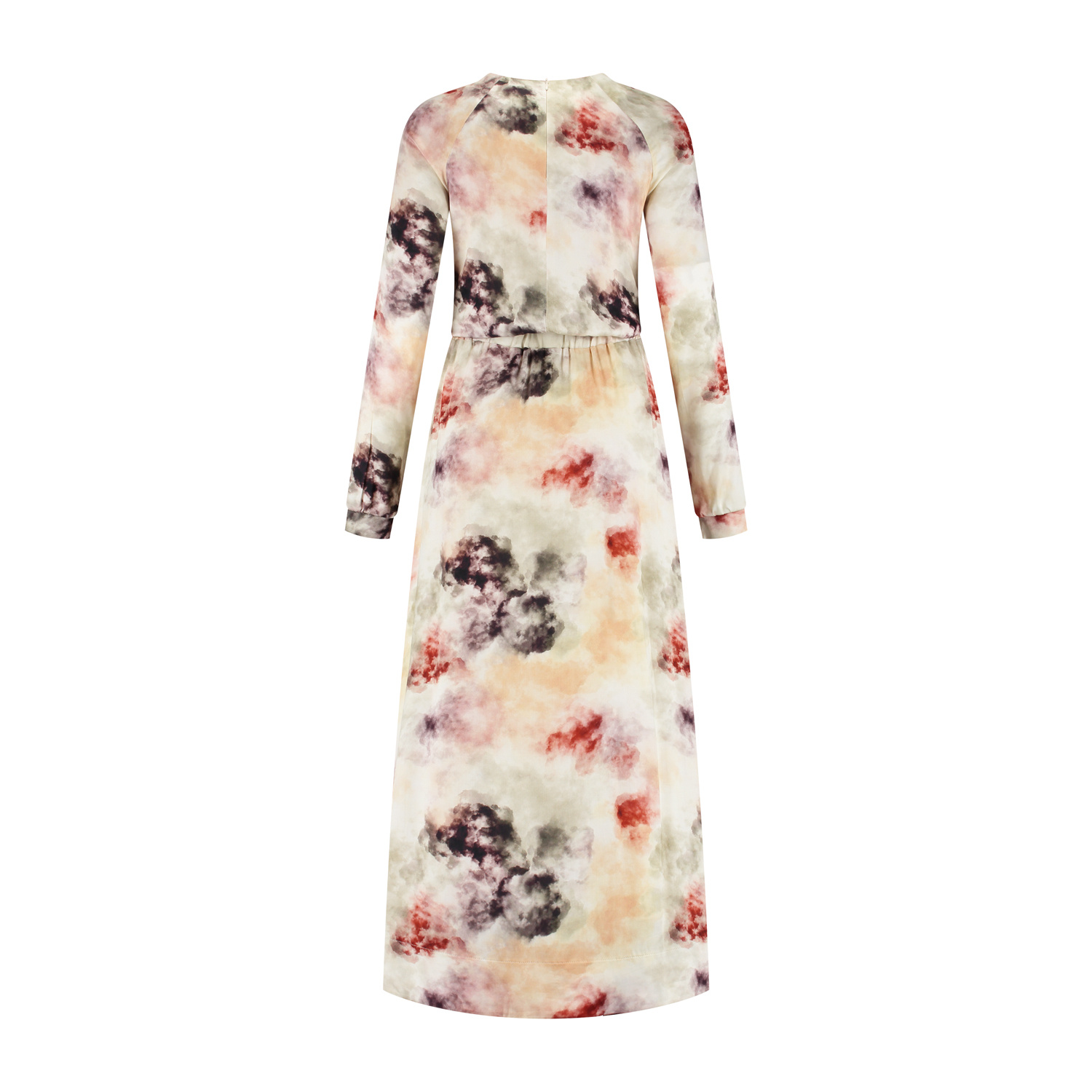 Jurk met een ronde halslijn en lange blousende raglanmouw met een smal elastisch boordje aan de onderrand. De jurk heeft een elastisch gerimpeld bandje in de taille verwerkt en sluit middenachter d.m.v. een blinde rits. De jurk is voorzien van een voering en is gemaakt in een mooie satijnachtige kwaliteitsstof met een vleugje glans en chique print. Ook erg leuk om een riem om de taille te dragen.
