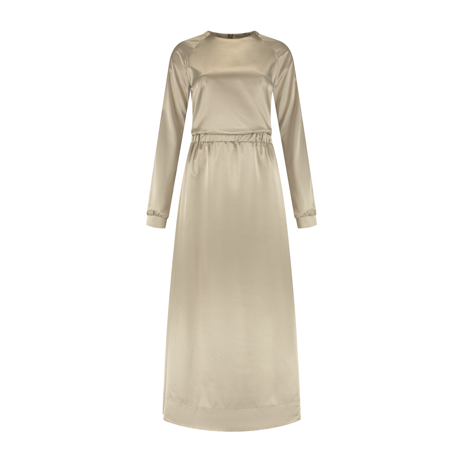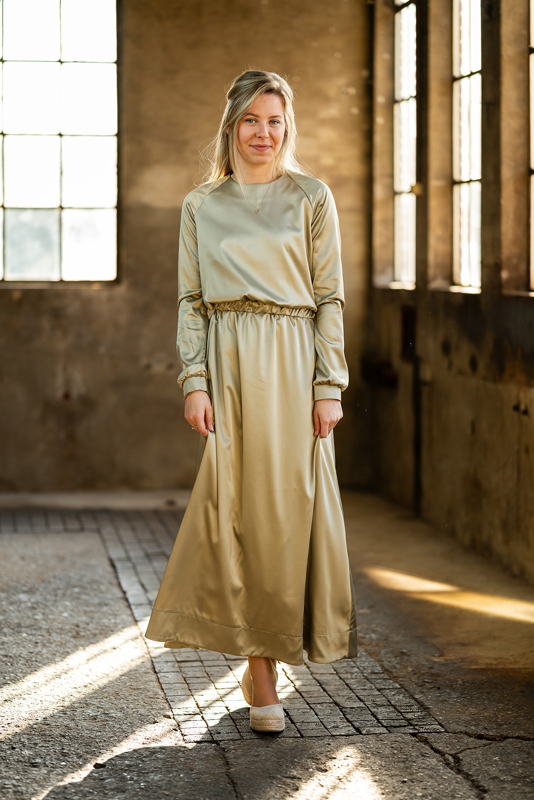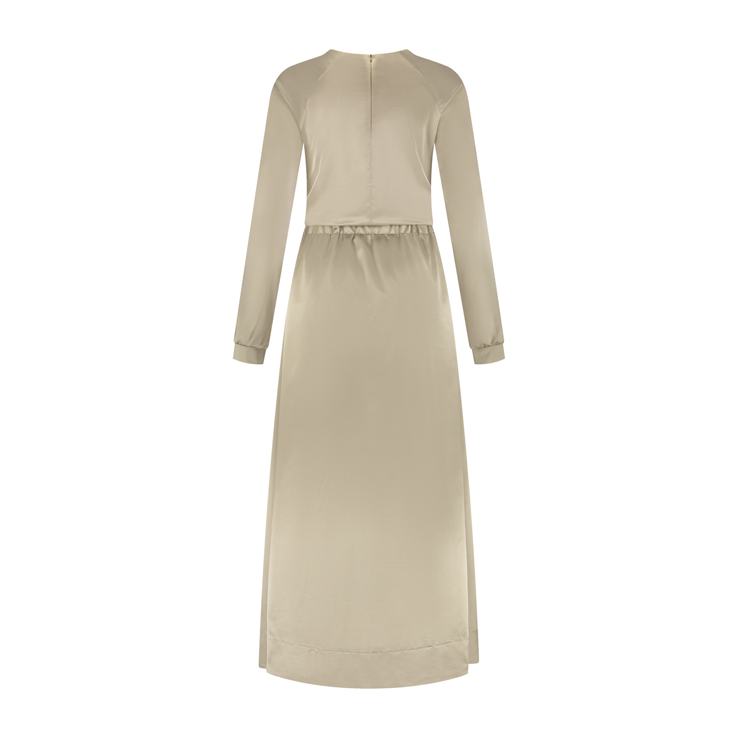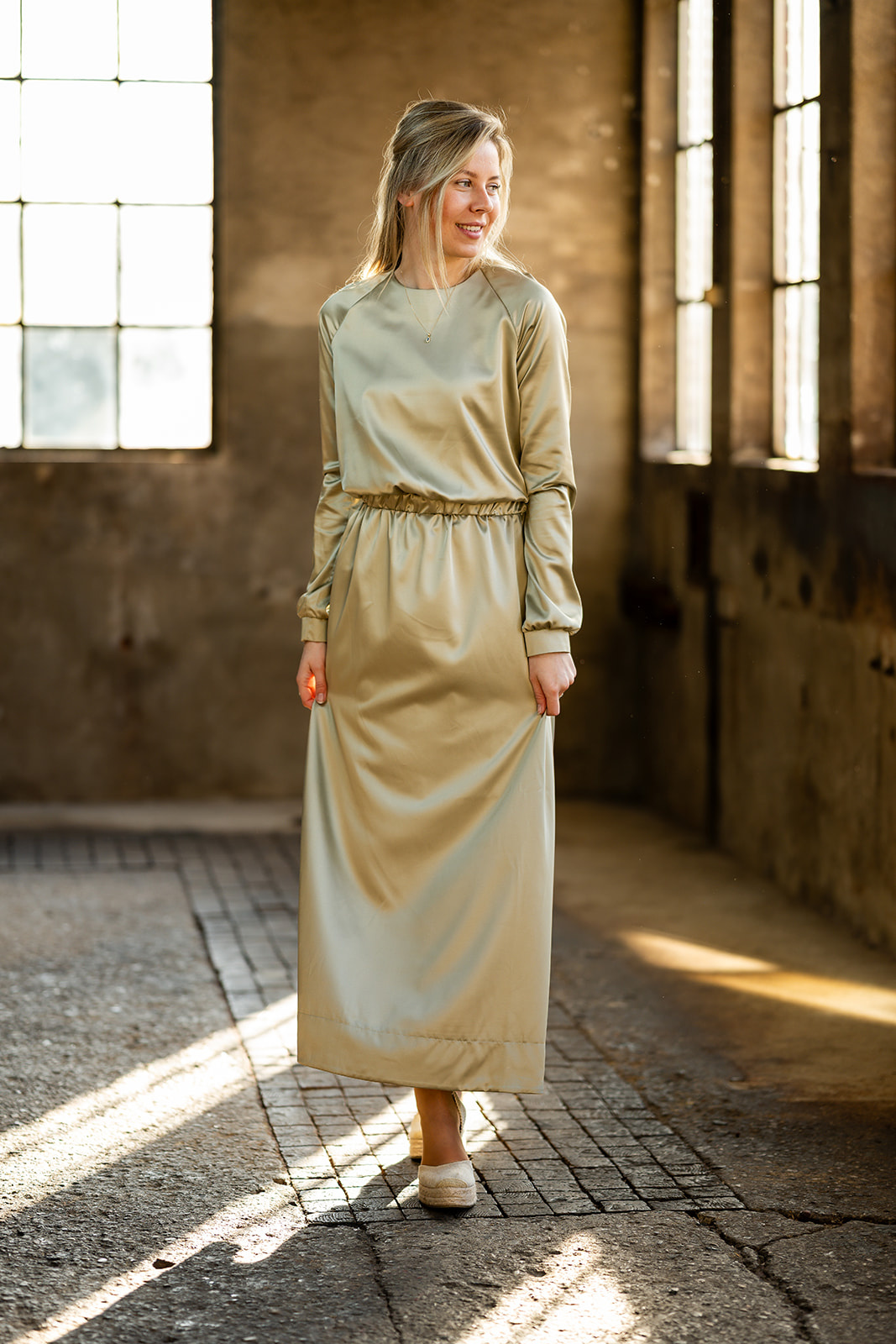 Jurk met een ronde halslijn en lange blousende raglanmouw met een smal elastisch boordje aan de onderrand. De jurk heeft een elastisch gerimpeld bandje in de taille verwerkt en sluit middenachter d.m.v. een blinde rits. De jurk is voorzien van een voering en is gemaakt in een mooie satijnachtige kwaliteitsstof met een vleugje glans. Ook erg leuk om een riem om de taille te dragen.