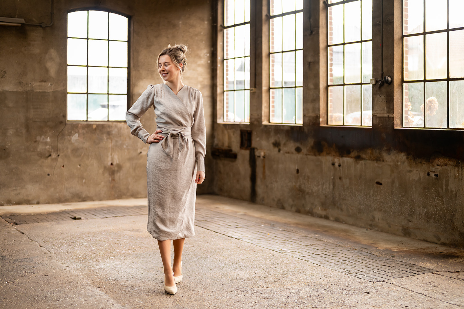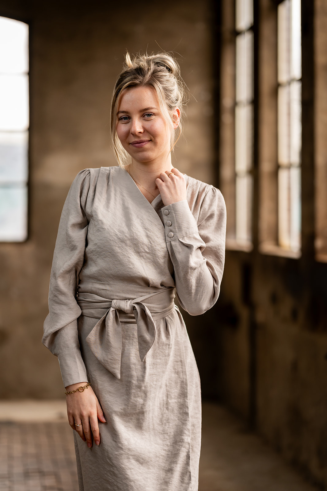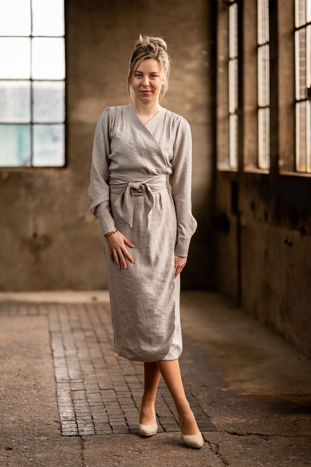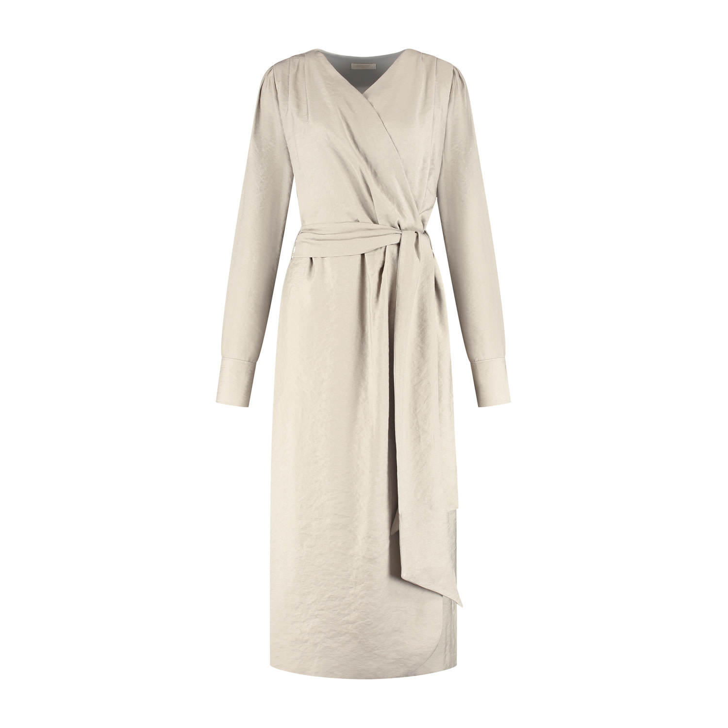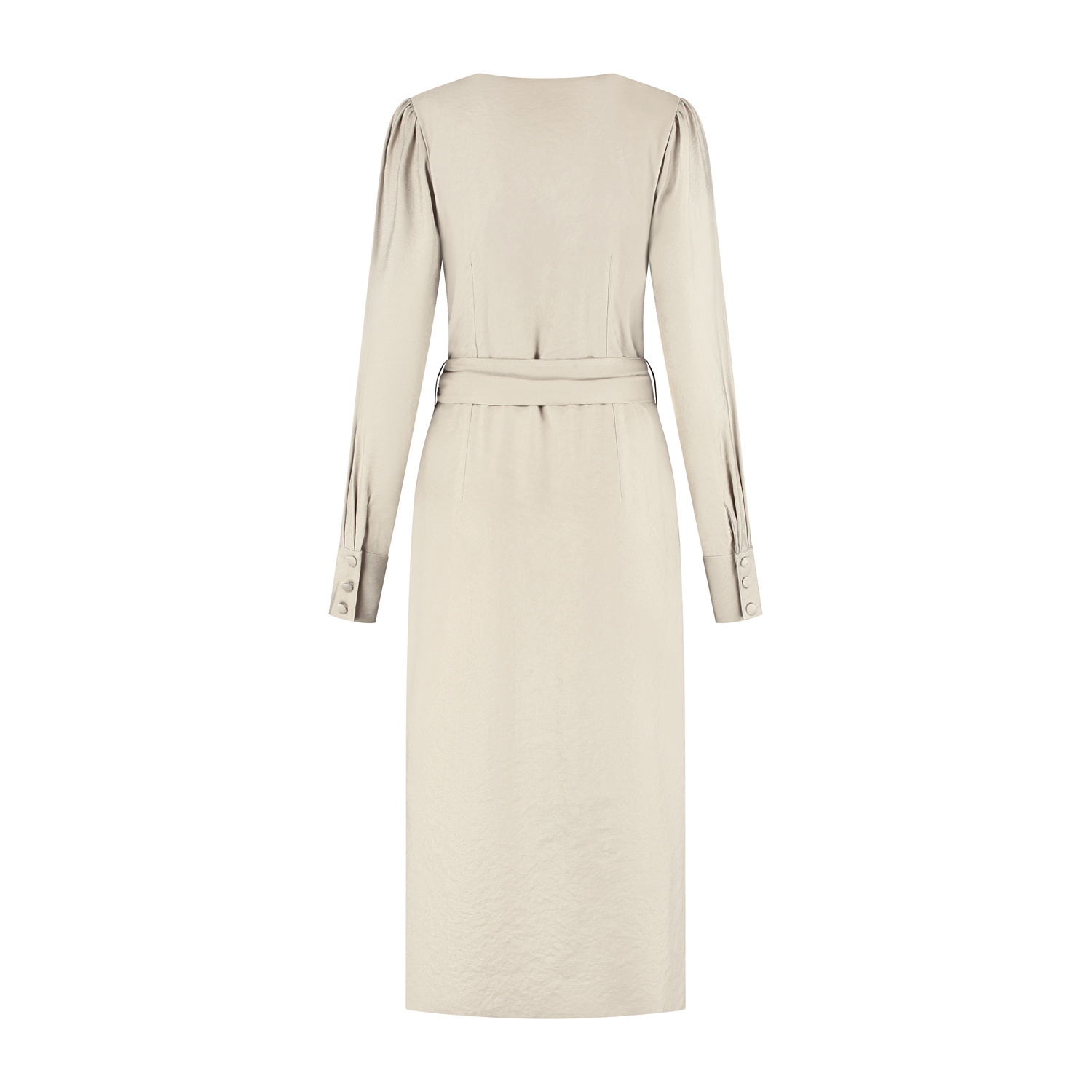 Jurk met royale volledige overslag en blousend bovenpasje d.m.v. plooien vanuit de taille. De jurk heeft een iets wijdere rok met brede zoom en een brede tailleceintuur, die eventueel twee keer om de taille geknoopt kan worden. De jurk heeft licht gerimpelde mouwen met brede manchet voorzien van stofknoopjes. Deze jurk is geheel gevoerd en gemaakt in een chique kwaliteitstof met een vleugje glans. Kortom een prachtige chique jurk.