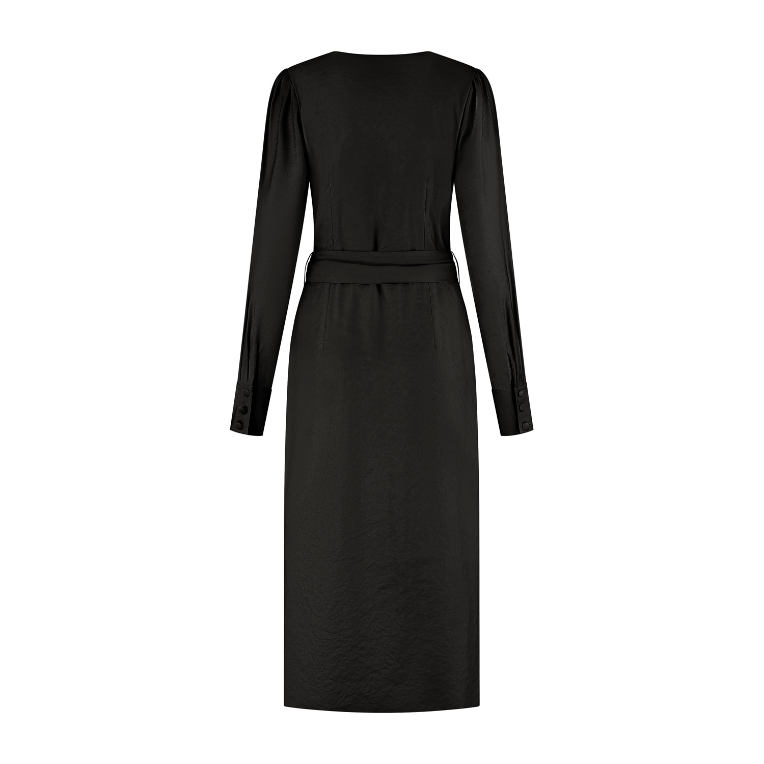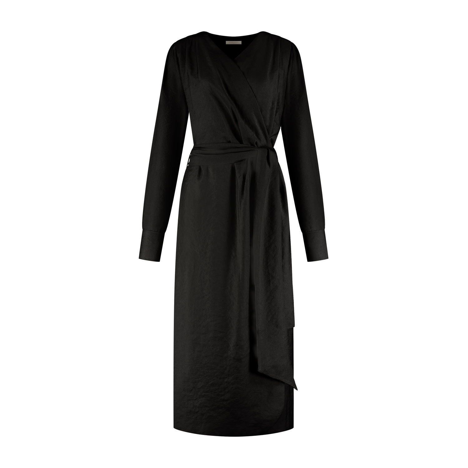 Jurk met royale volledige overslag en blousend bovenpasje d.m.v. plooien vanuit de taille. De jurk heeft een iets wijdere rok met brede zoom en een brede tailleceintuur, die eventueel twee keer om de taille geknoopt kan worden. De jurk heeft licht gerimpelde mouwen met brede manchet voorzien van stofknoopjes. Deze jurk is geheel gevoerd en gemaakt in een chique kwaliteitstof met een vleugje glans. Kortom een prachtige chique jurk.
