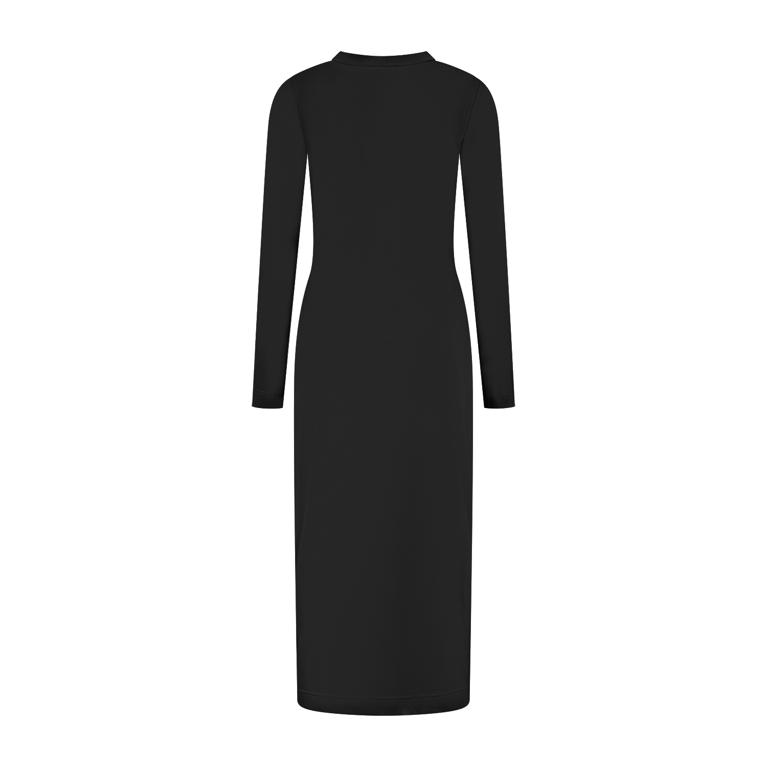 Jurk met opstaand kraagboordje en lange mouwen. De jurk heeft middenvoor een deelnaad over de lengte van de jurk en in de taille een aantal horizontale plooien met vanuit de zijnaden een strik/knoop c...