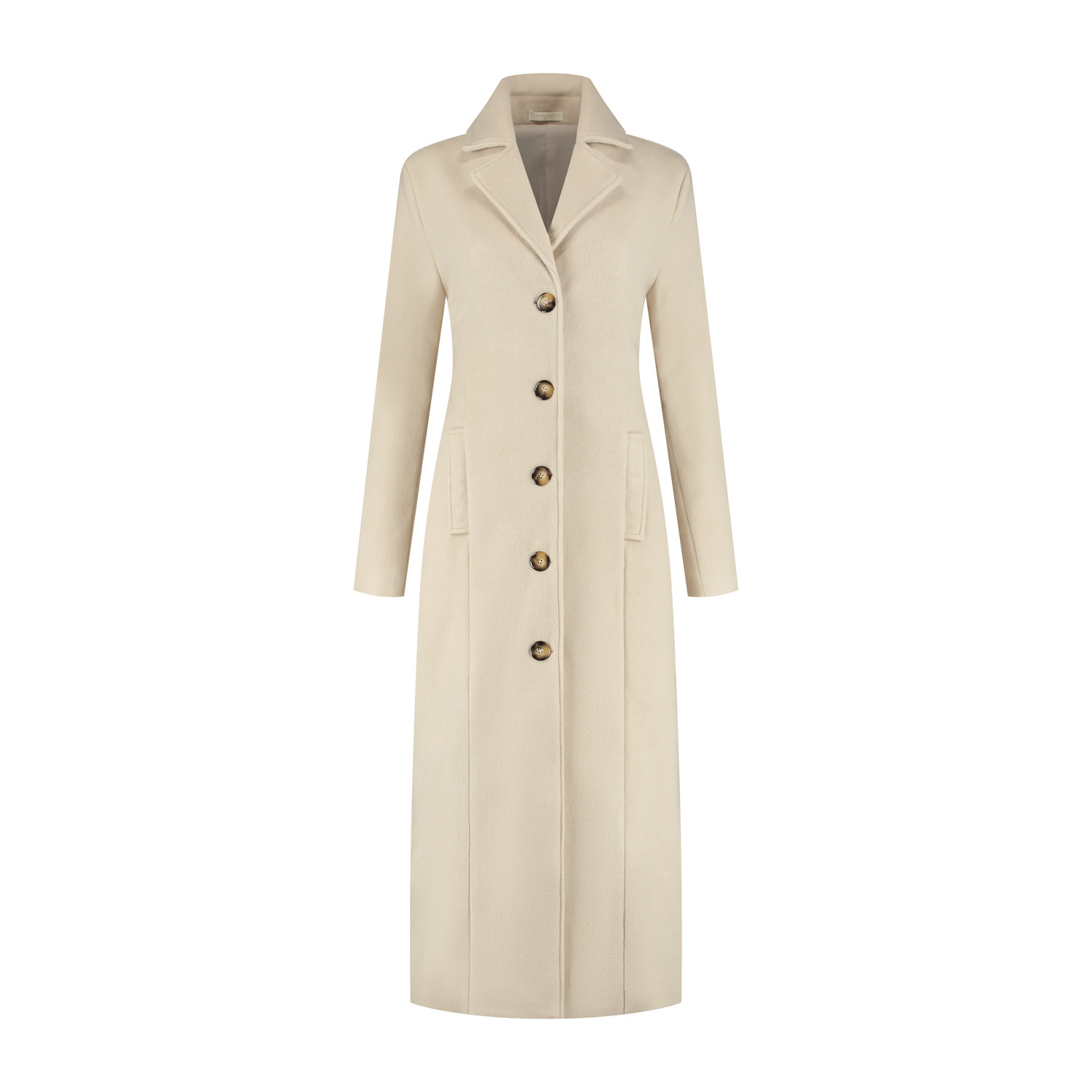 Lange mantel met doorknoopsluiting en royale reverkraag. Deze mantel heeft steekzakken en een loopsplit van achteren. De mantel/jas is voorzien van een voeringstof en gemaakt in een warme en zachte kwaliteitsstof.