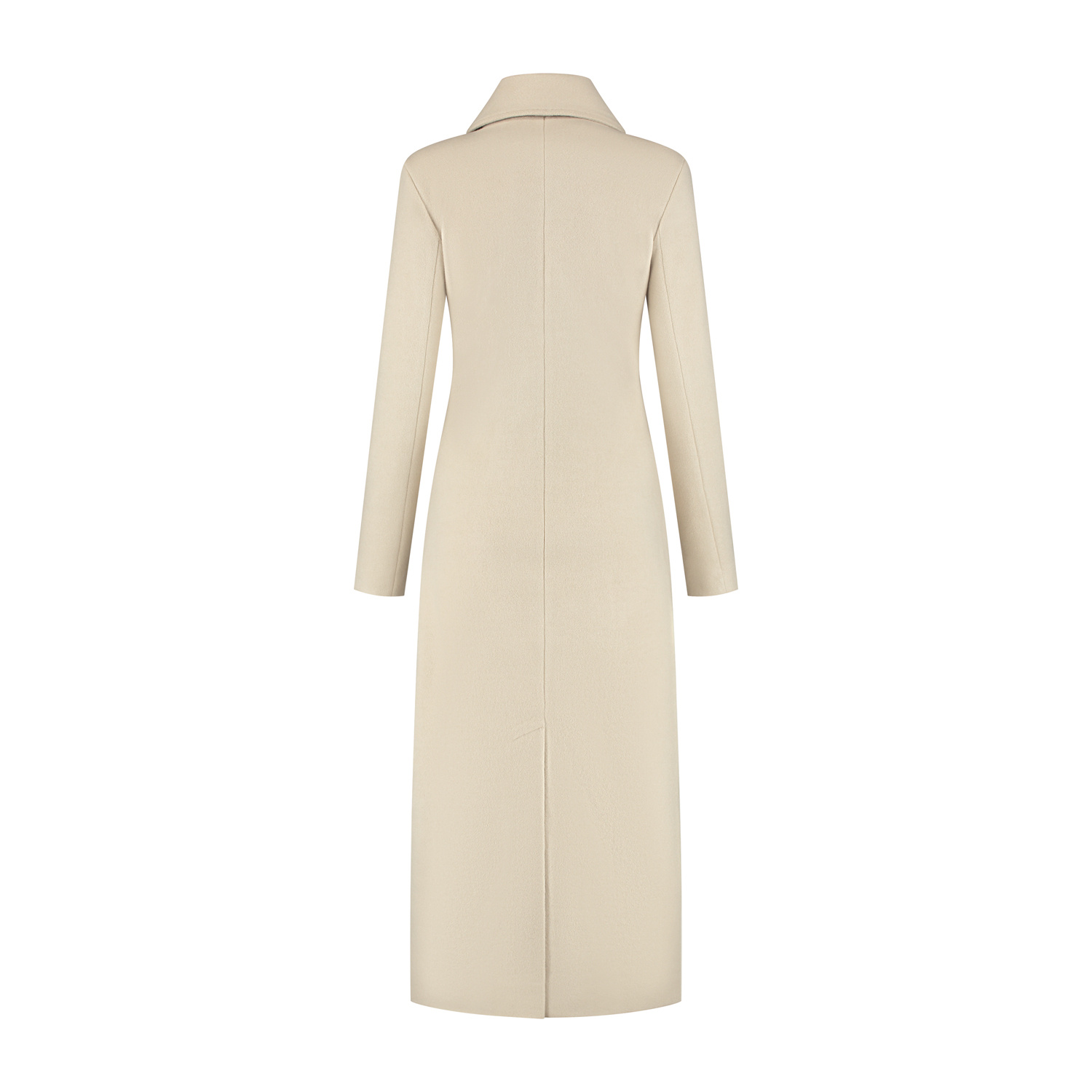 Lange mantel met doorknoopsluiting en royale reverkraag. Deze mantel heeft steekzakken en een loopsplit van achteren. De mantel/jas is voorzien van een voeringstof en gemaakt in een warme en zachte kw...