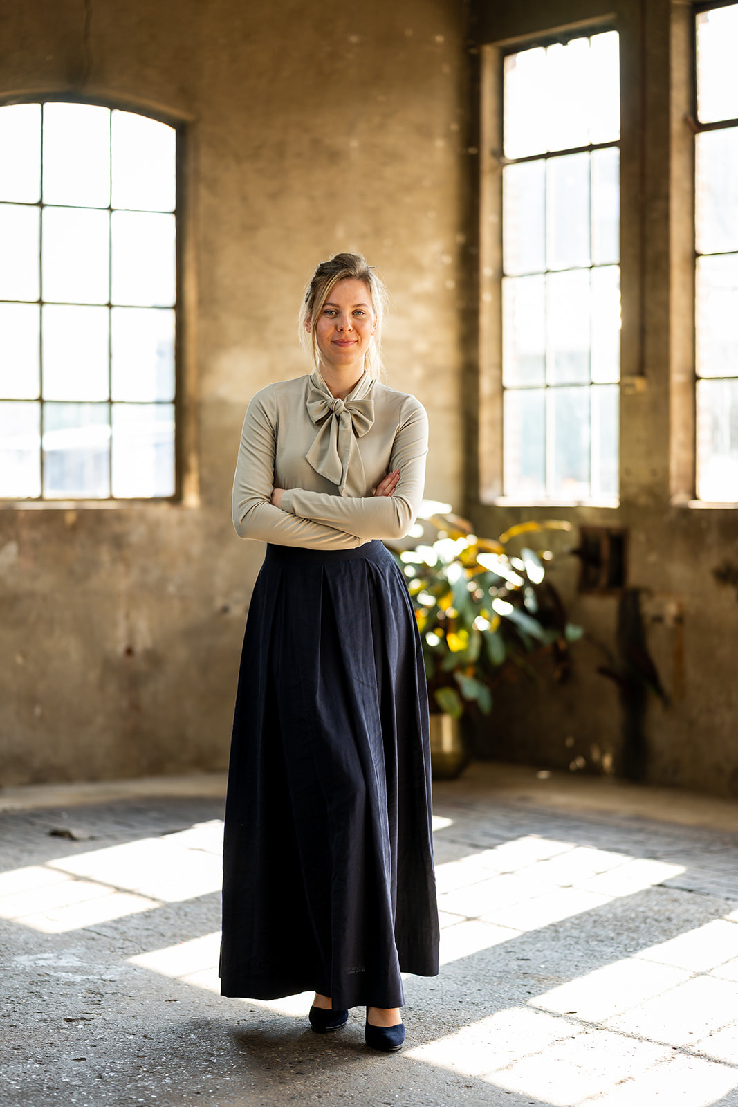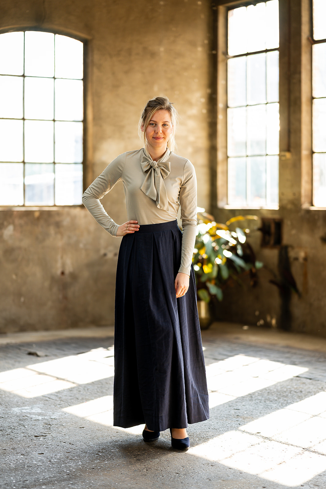 Lange rok met tailleband en in de achterkant van de band een stukje elastiek voor extra draagcomfort. De rok heeft rondom een aantal diepe stolpplooien en sluit in de zijnaad d.m.v. een blinde rits. De rok is gemaakt in een stevige luchtigvallende chique kwaliteitsstof met iets een matte vleug.