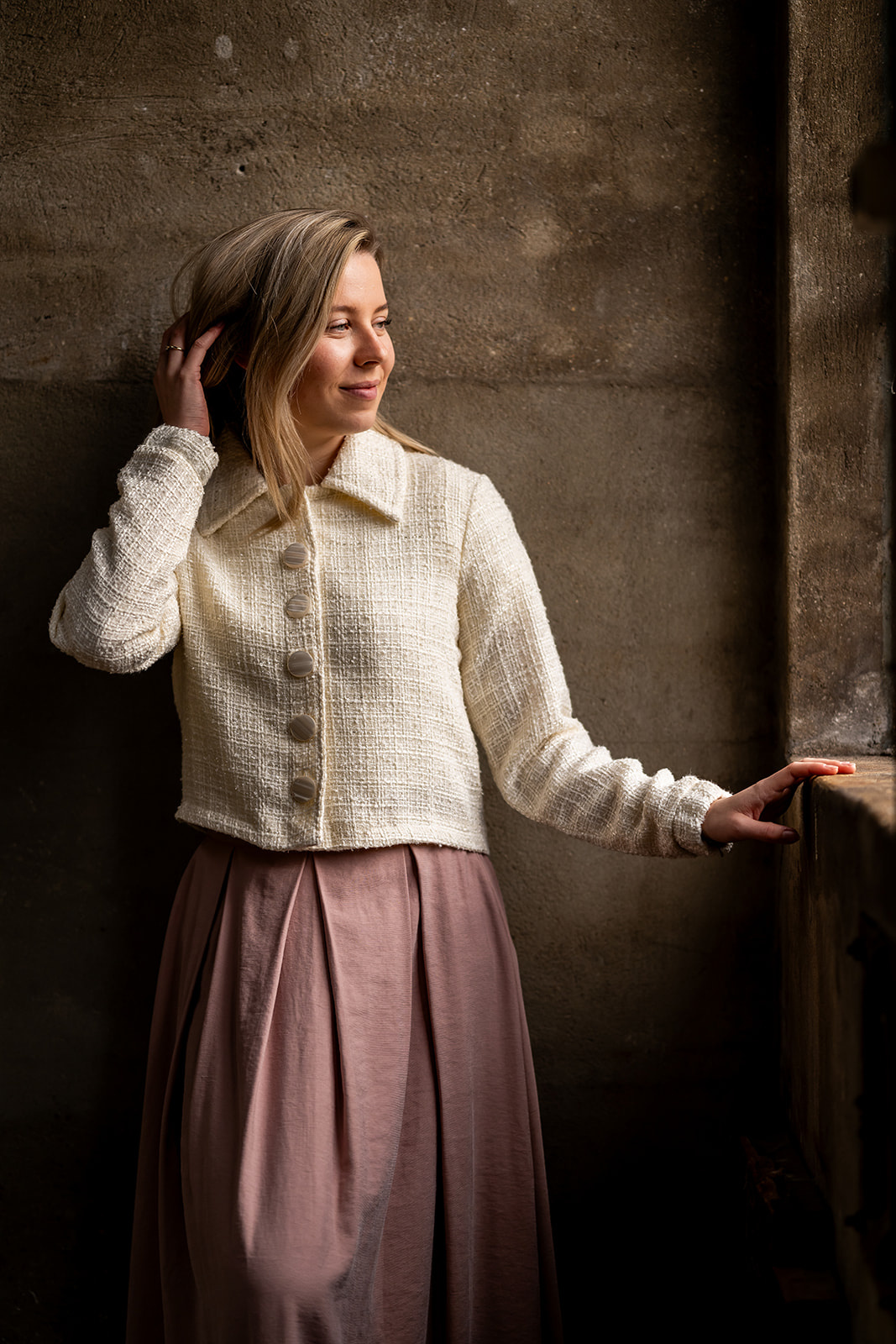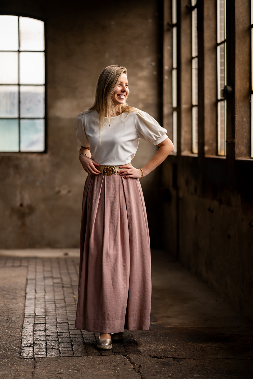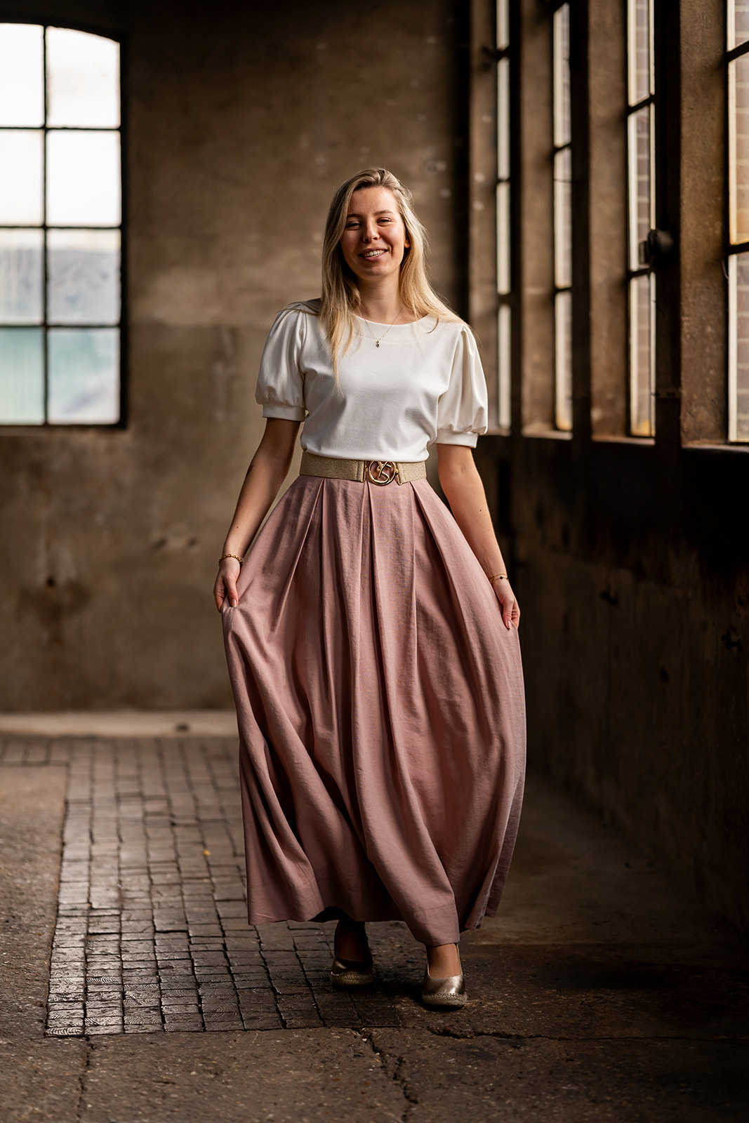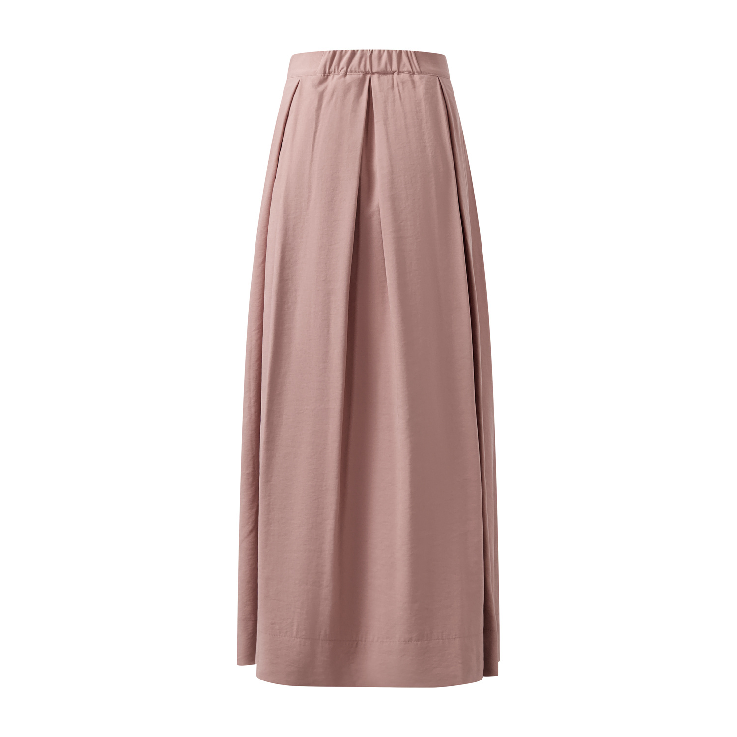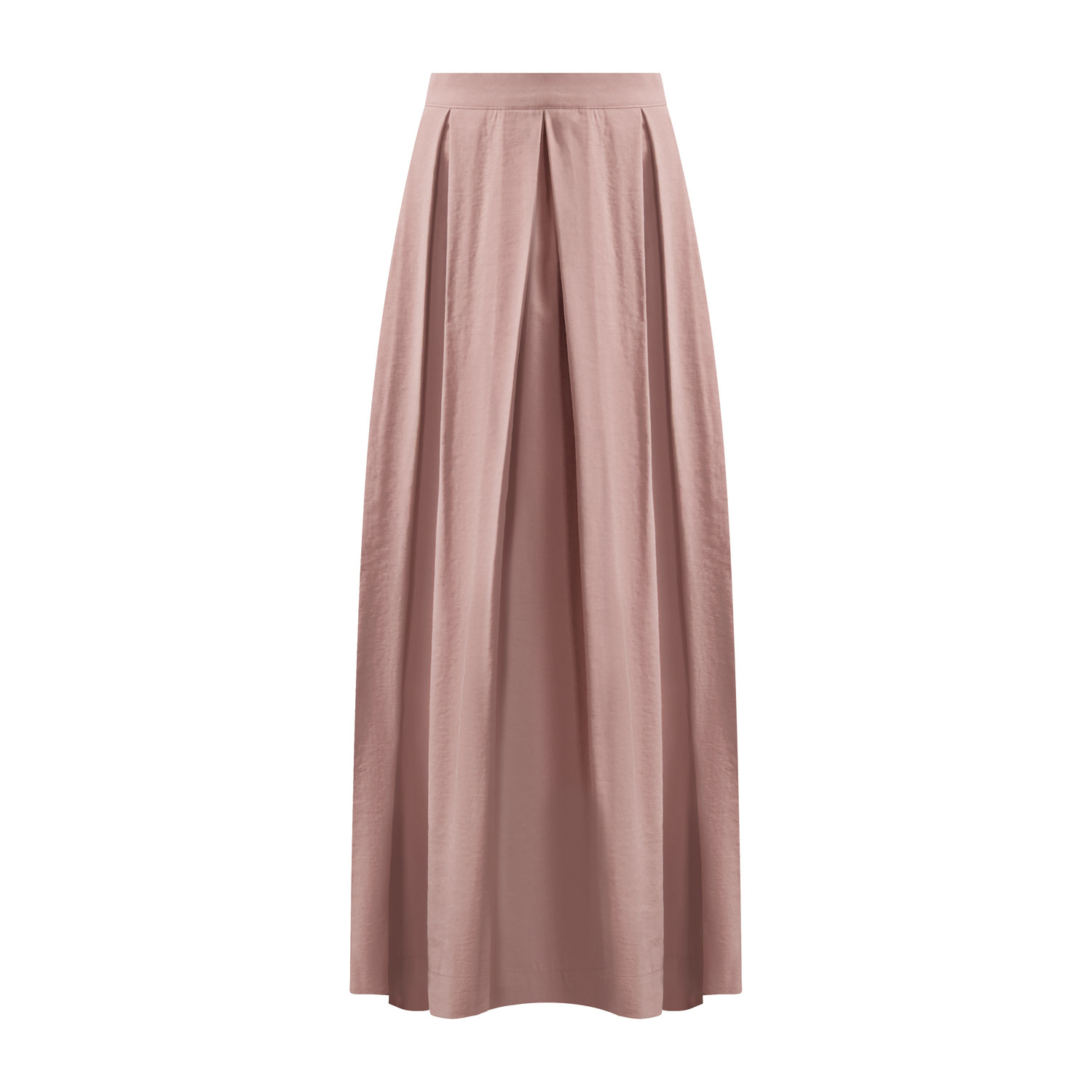 Lange rok met tailleband en in de achterkant van de band een stukje elastiek voor extra draagcomfort. De rok heeft rondom een aantal diepe stolpplooien en sluit in de zijnaad d.m.v. een blinde rits. De rok is gemaakt in een stevige luchtigvallende chique kwaliteitsstof met iets een matte vleug.