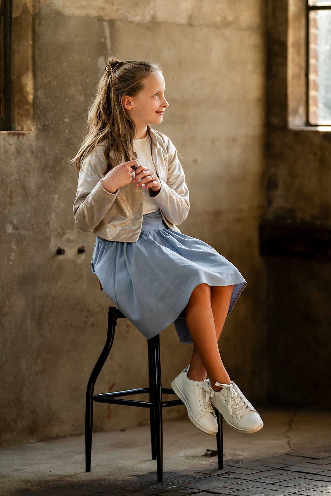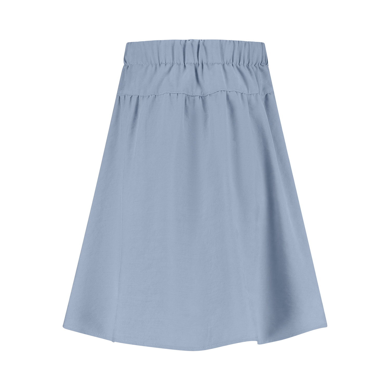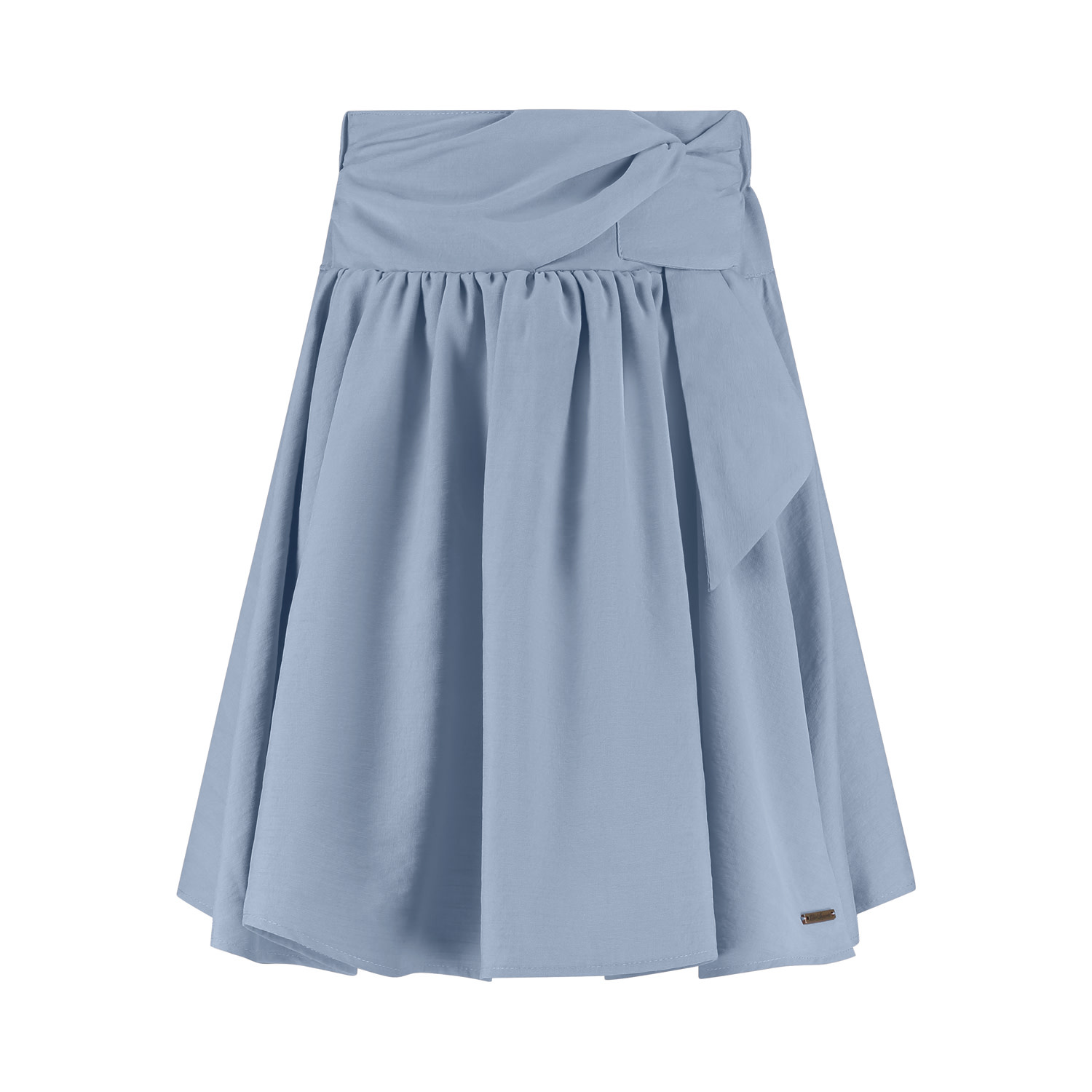 Rok met brede taillepas en elastiek in de achterkant en een lus/voilant detail op de voorkant. Rondom is de rok gerimpeld aan de taillepas en een mooie wijde rok gecreeërd wordt. Het rokje is voorzie...