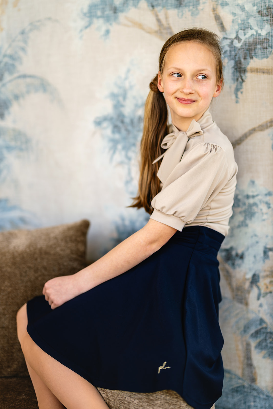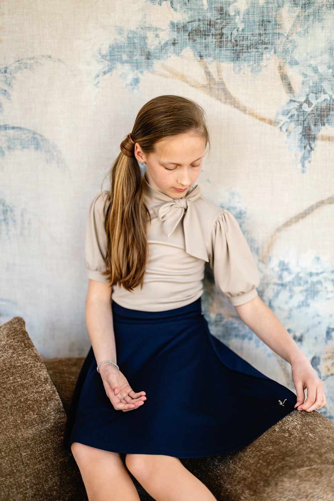 Rok met brede taillepas en knoopsgaten-elastiek in de achterkant van de taillepas. Rondom is de rok gecirkeld aan de taillepas zodat er een mooie wijde rok gecreeërd wordt. Het rokje is voorzien van een goudkleurig Port Lavande borduurtje aan de onderrand. Deze rok is gemaakt in een luxe tricot kwaliteitsstof.