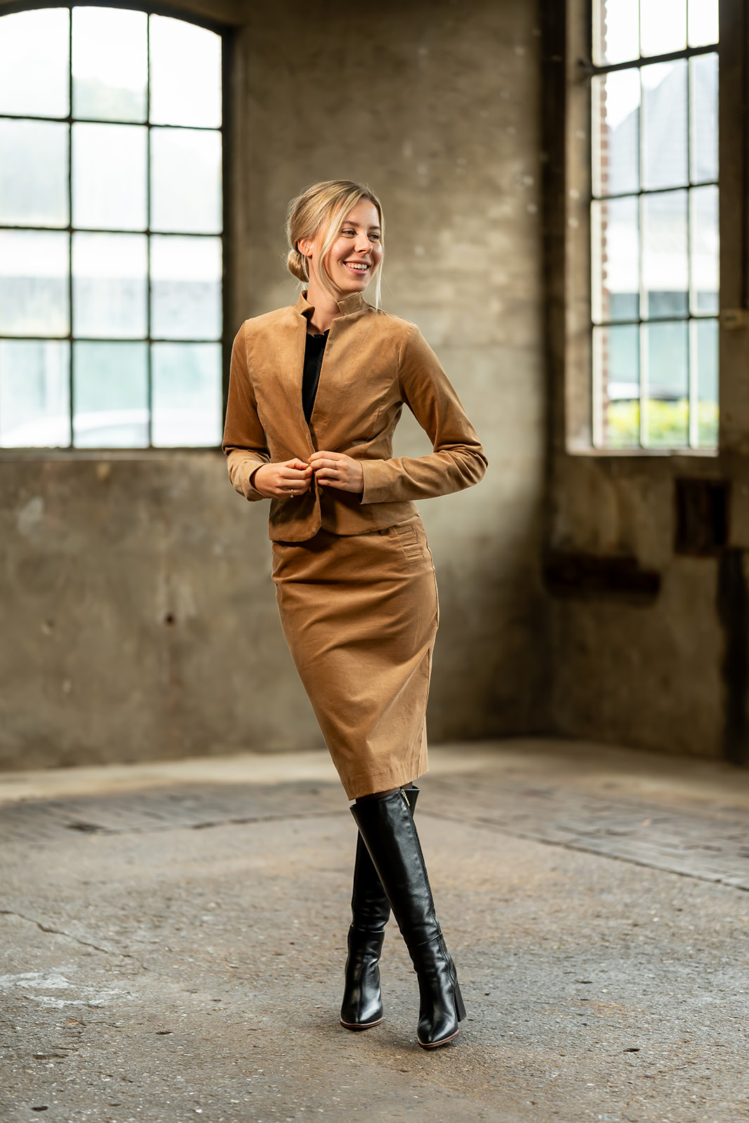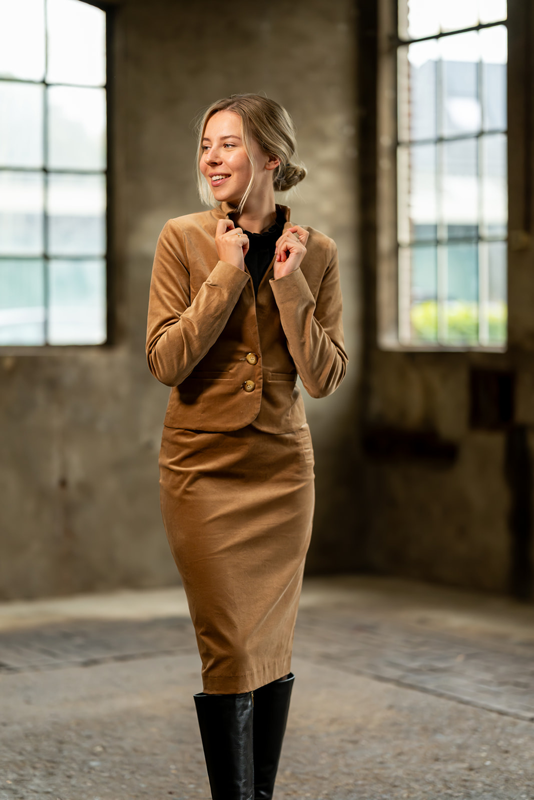 Rok met aangeknipte taille (zonder taillepas) en drie kleine paspels op de zij- voorkant. De rok sluit middenachter doormiddel van een blinde rits en is voorzien van een voering en loopsplit. Deze rok is gemaakt in een mooie velourse kwaliteitsstof.