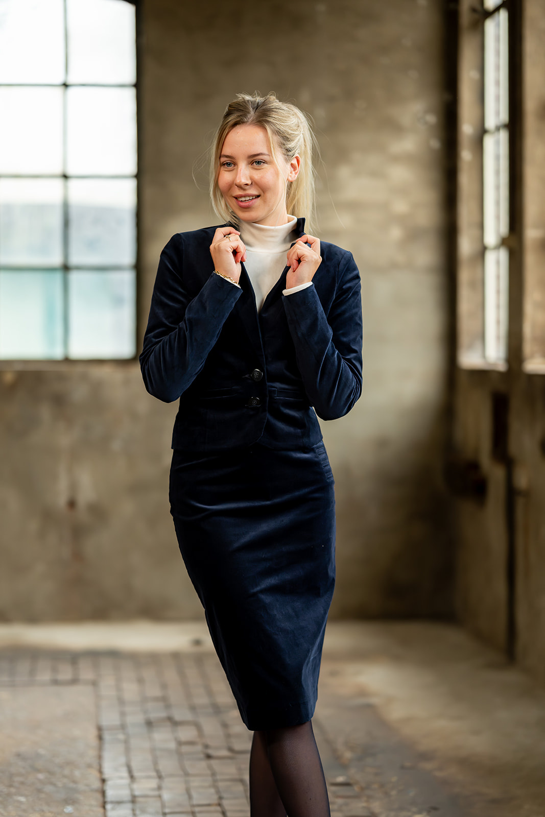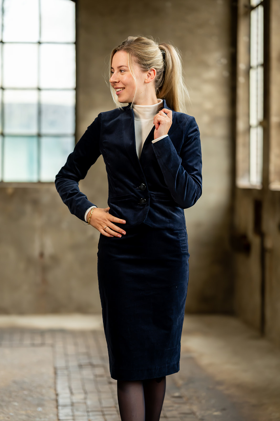 Rok met aangeknipte taille (zonder taillepas) en drie kleine paspels op de zij- voorkant. De rok sluit middenachter doormiddel van een blinde rits en is voorzien van een voering en loopsplit. Deze rok is gemaakt in een mooie velourse kwaliteitsstof.