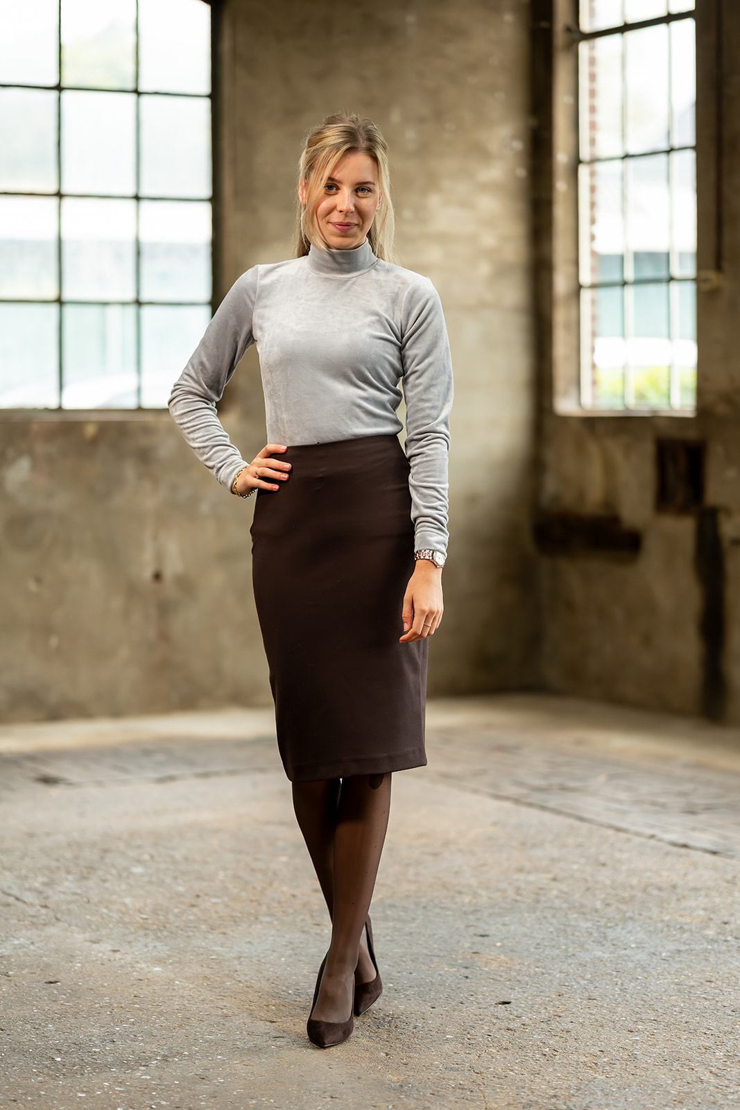Kokerrok in een luxe, stevige tricot kwaliteitstof. De rok heeft een loopsplit en sluit d.m.v. een metalen rits in de middenachternaad.