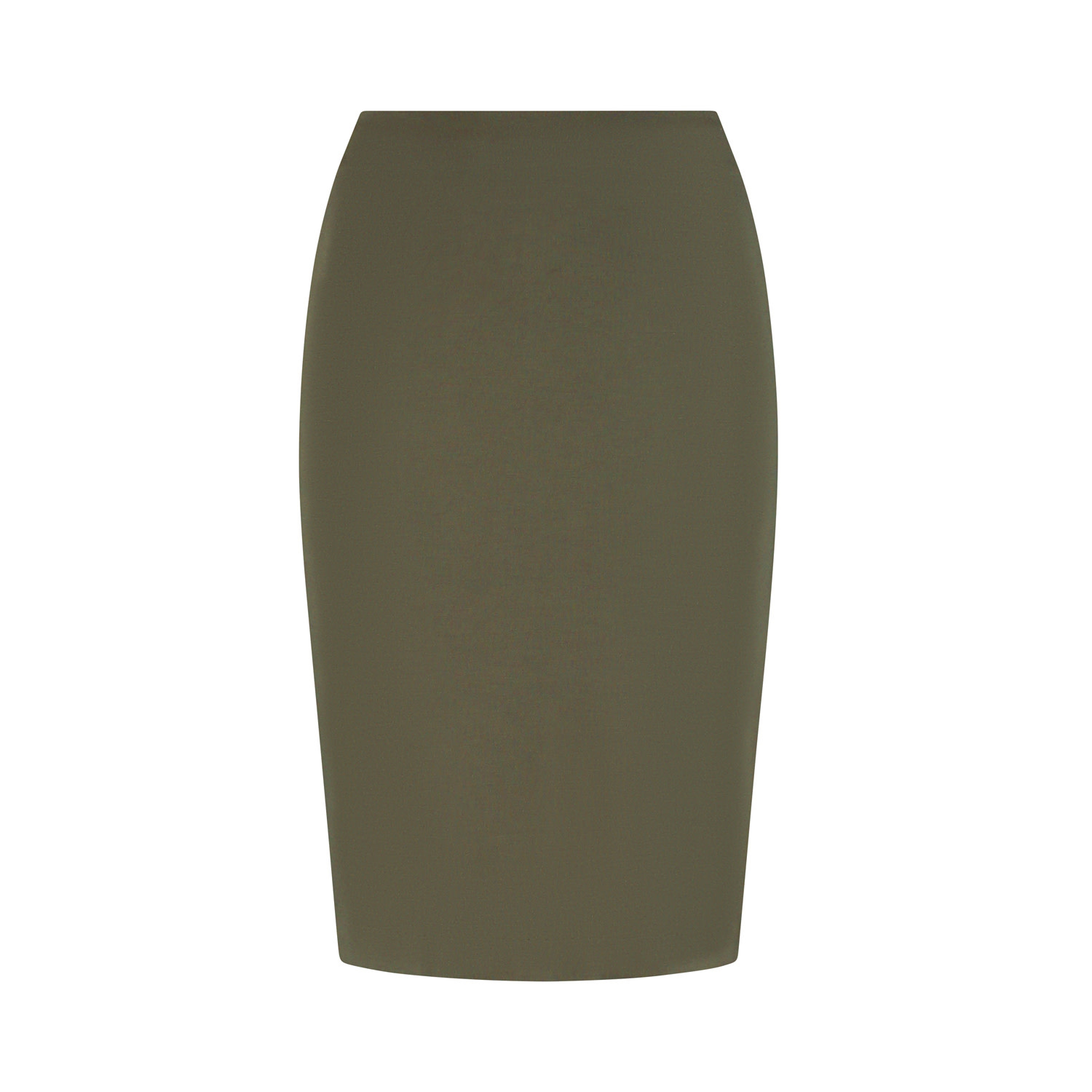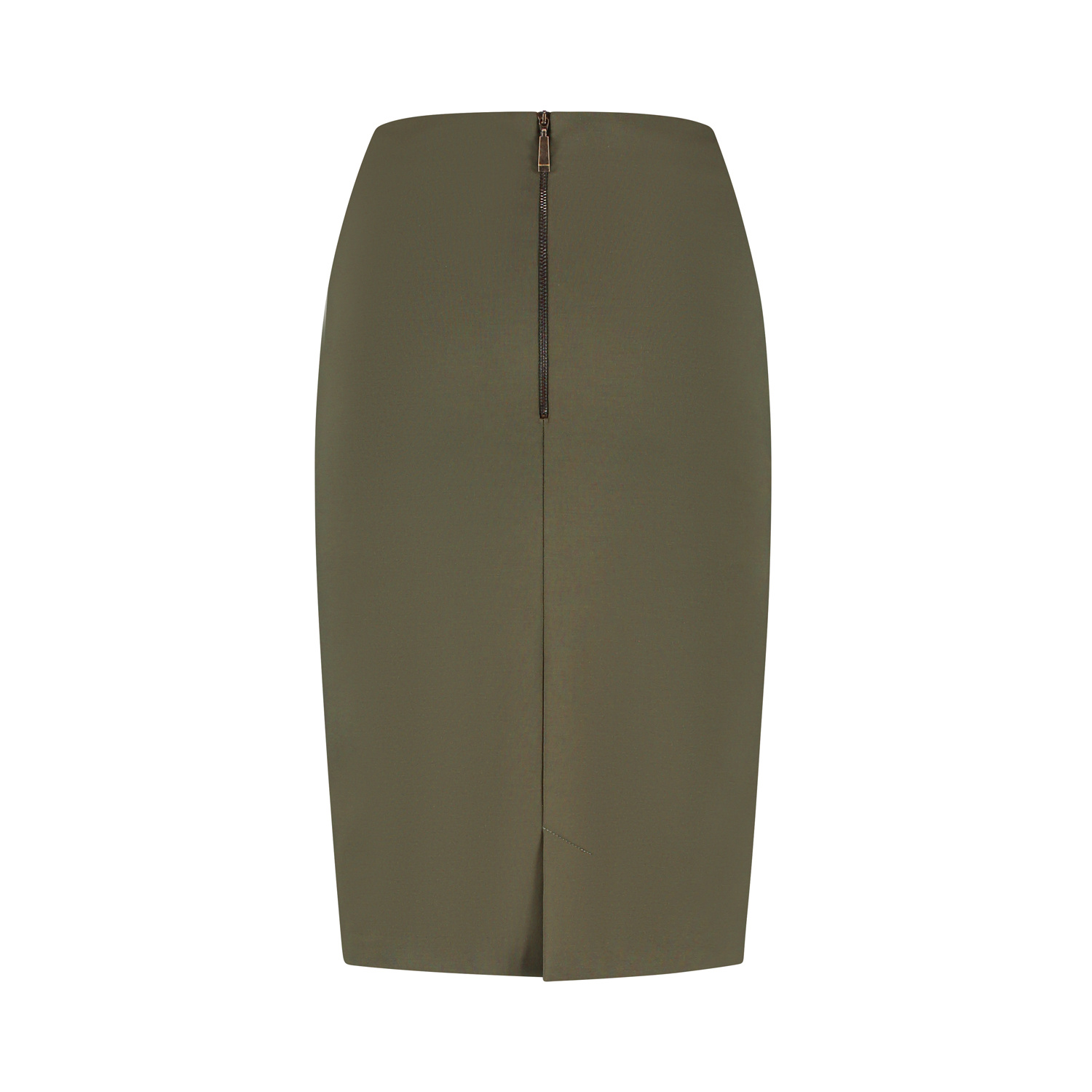 Kokerrok in een luxe, stevige tricot kwaliteitstof. De rok heeft een loopsplit en sluit d.m.v. een metalen rits in de middenachternaad.