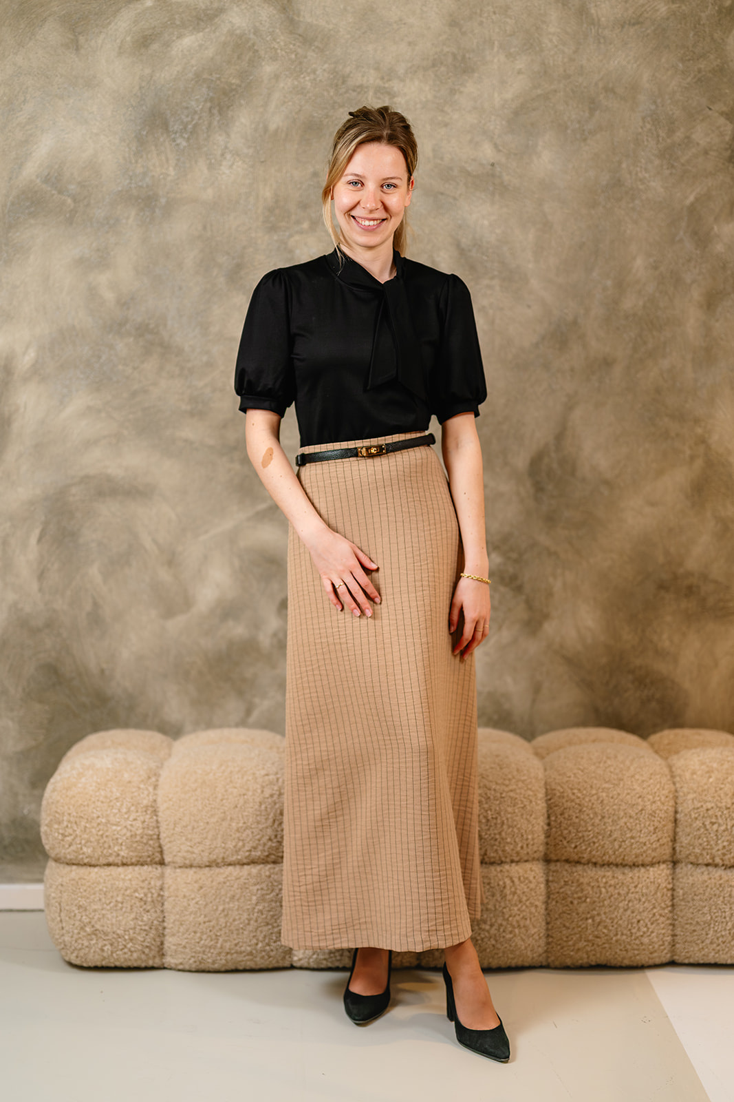 De rok Lena in donkerzand kleur met een zwart krijtstreepje is een échte toevoeging aan je garderobe, elegant in haar eenvoud. De lange, licht uitlopende pasvorm zorgt voor een vrouwelijk silhouet, terwijl de fijne verticale streep een subtiel verlengend effect geeft. De rok is uitgevoerd in een comfortabele, soepelvallende linnenlook stof die mooi met je meebeweegt. Het stukje elastische tailleband aan de achterzijde biedt extra draagcomfort en een perfecte aansluiting in de taille, zonder in te leveren op stijl. De rok is ongevoerd en sluit in de zijnaad d.m.v. een blinde rits. Dankzij de warme zandkleur laat rok Lena zich moeiteloos combineren met zachte knitwear tot een elegante blouse. Draag haar casual met sneakers en een trui, of combineer met een blazer en hakken voor een verfijnde, geklede look. Rok Lena is een veelzijdige essential die klasse en comfort perfect samenbrengt, precies zoals je van Port Lavande mag verwachten.