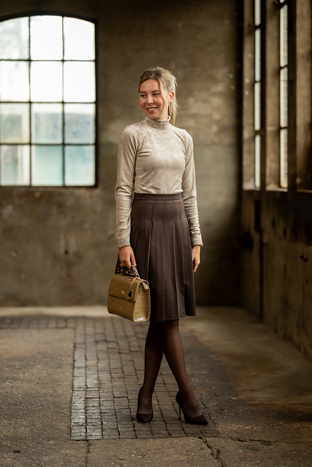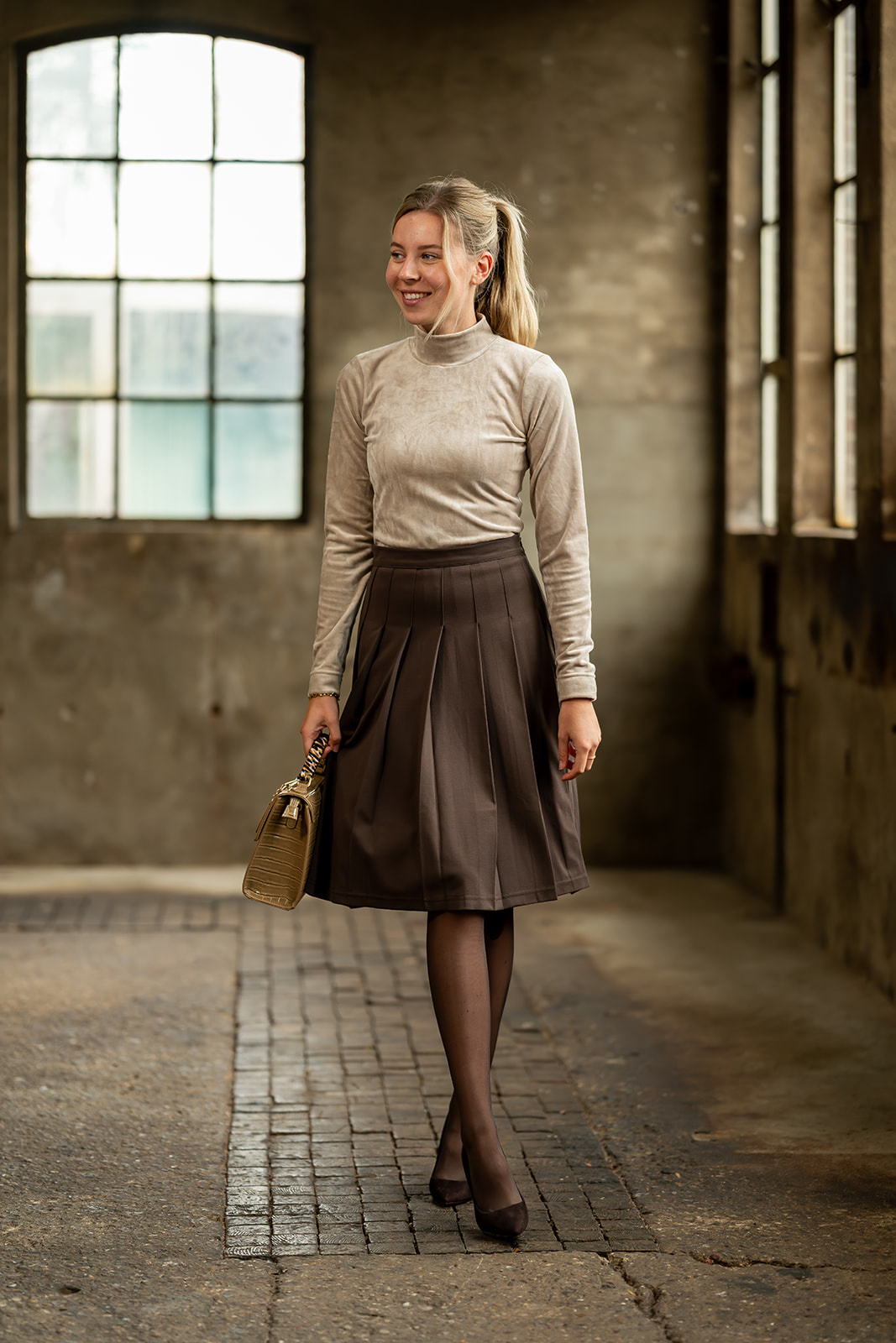 Voeg een vleugje tijdloze klasse toe aan uw garderobe met deze prachtige donkerbruine plooirok. De smalle tailleboord met in de zijkant een blinde rits en de verticale plooien zorgen voor een elegante uitstraling. Deze stijlvolle en veelzijdige rok is perfect te combineren met een blouse voor een formele look of een coltruitje, bontjasje of fluwelen jasje voor een casual-chique uitstraling en ook nog eens te dragen in elk seizoen van het jaar.